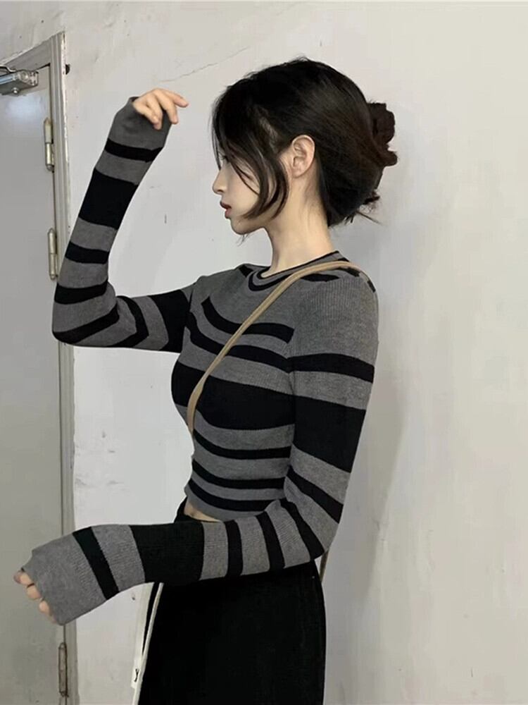 2024 秋の新スタイルアメリカンレトロネクタイデザインスリムショート多用途ストライプ長袖セーター女性 ロング オータム 秋物 missk47881933284