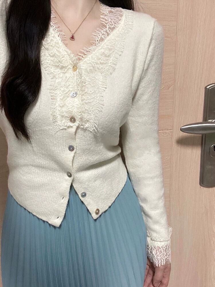 2024 秋の新スタイルフレンチセクシーなレーススプライシングスリムフィット V ネックセーター気質底トップ女性 オータム 秋物 Vネック missk91069726451