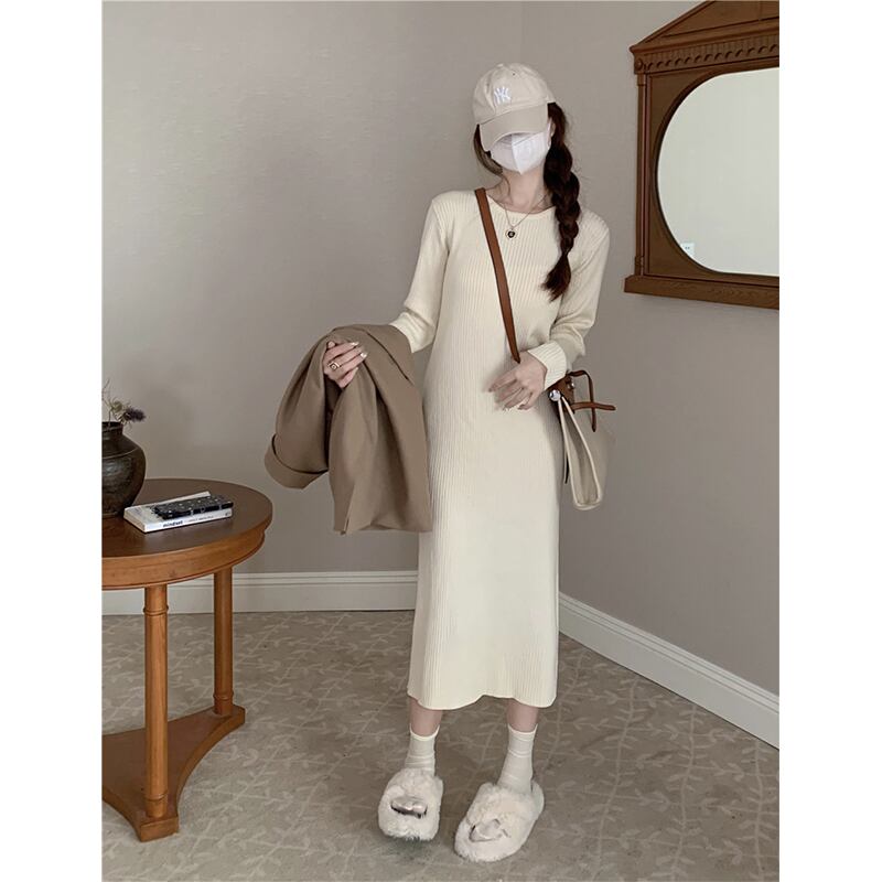 スタイルラウンドネック長袖ニットドレス女性秋 2024 新しいファッション痩身気質ミッドレングススカート ロング オータム 秋物 Oネック missk11609006872