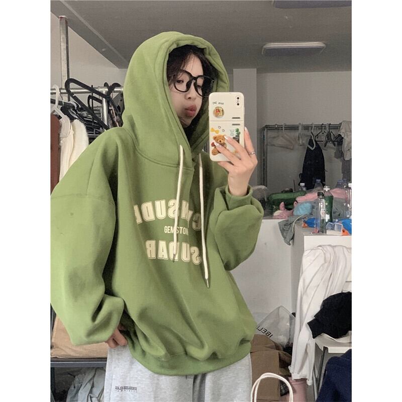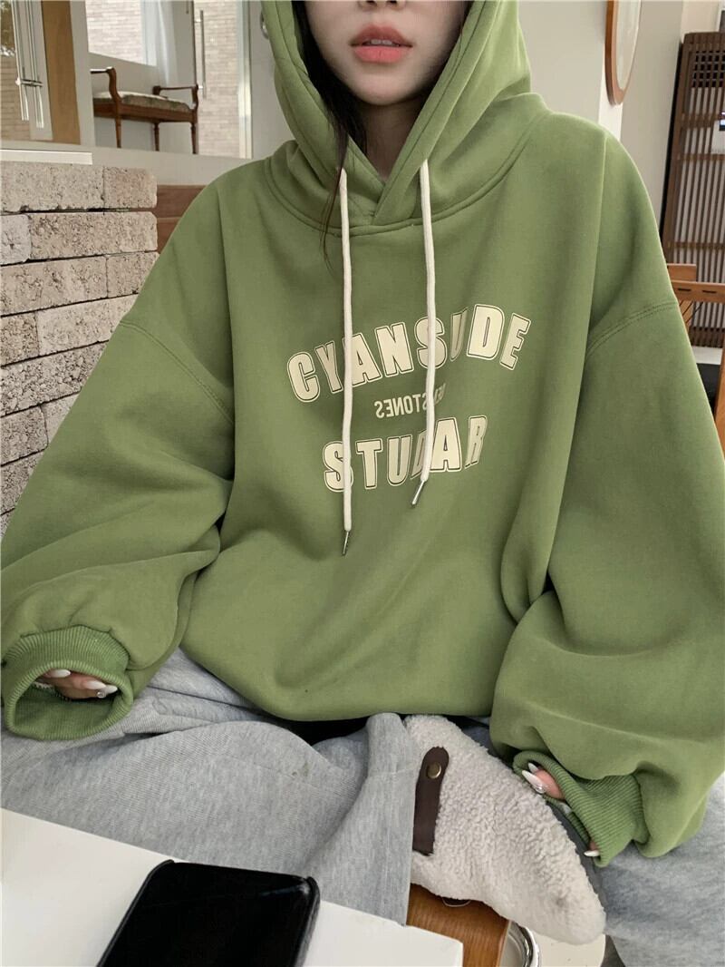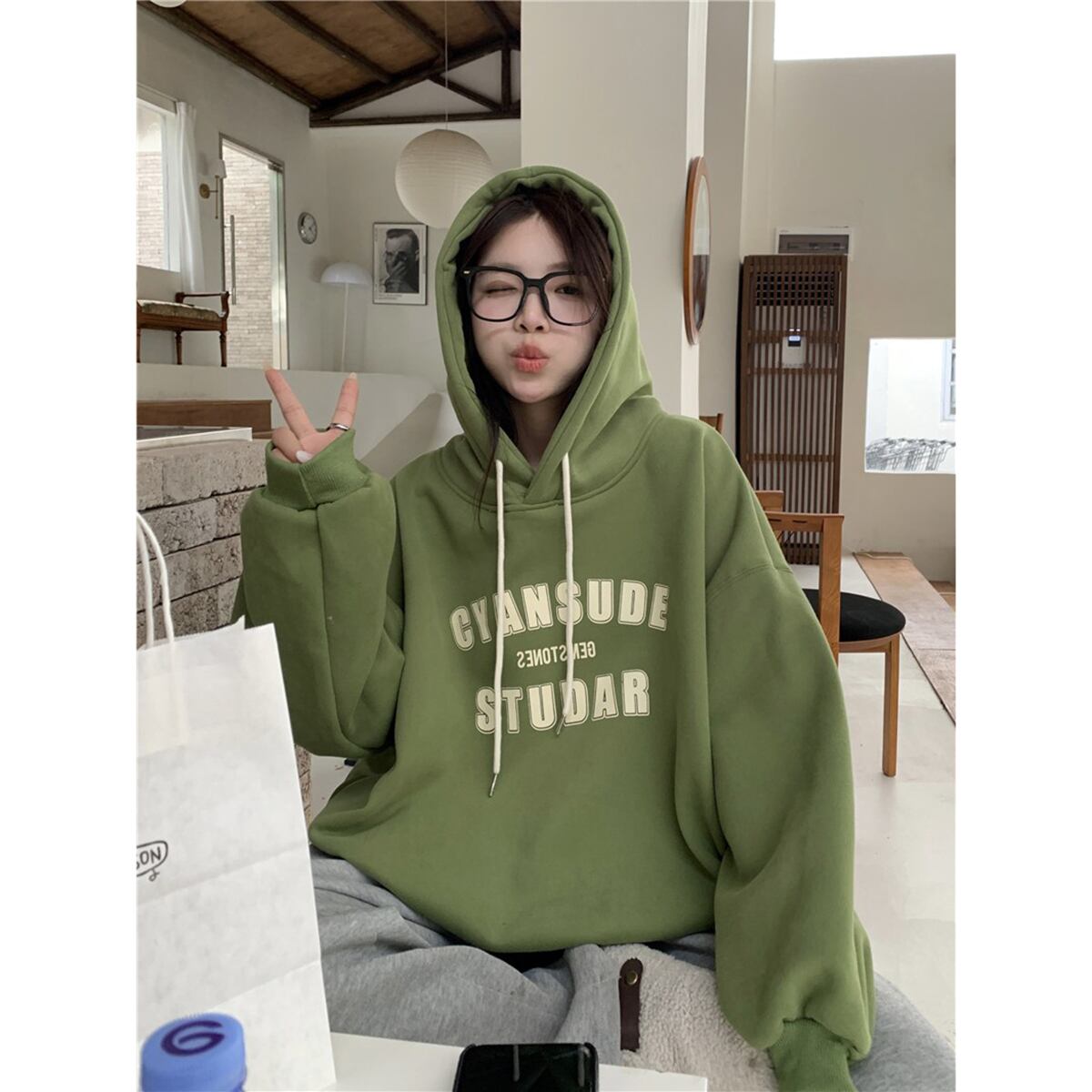 グリーンベルベットフード付きスウェットシャツ秋怠け者スタイルプリント厚みのあるジャケットトップ女性用 オータム 秋物 missk97574825293