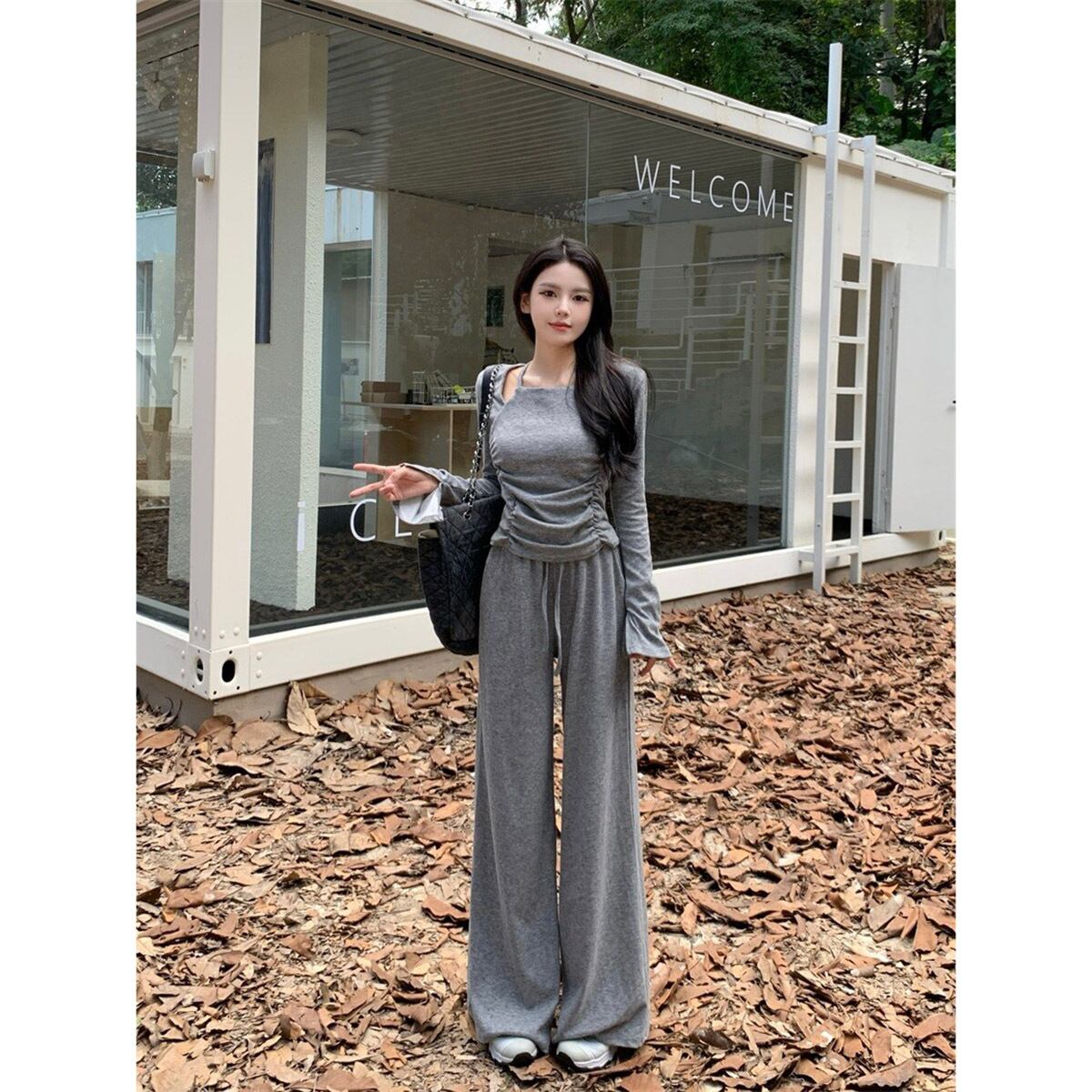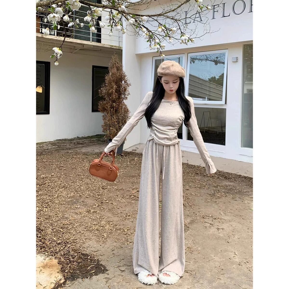 ホットデザインホルターネック巾着長袖 Tシャツハイウエストワイドレッグパンツ女性秋 2024 新しいファッションスーツ ロング オータム 秋物 missk85052393211