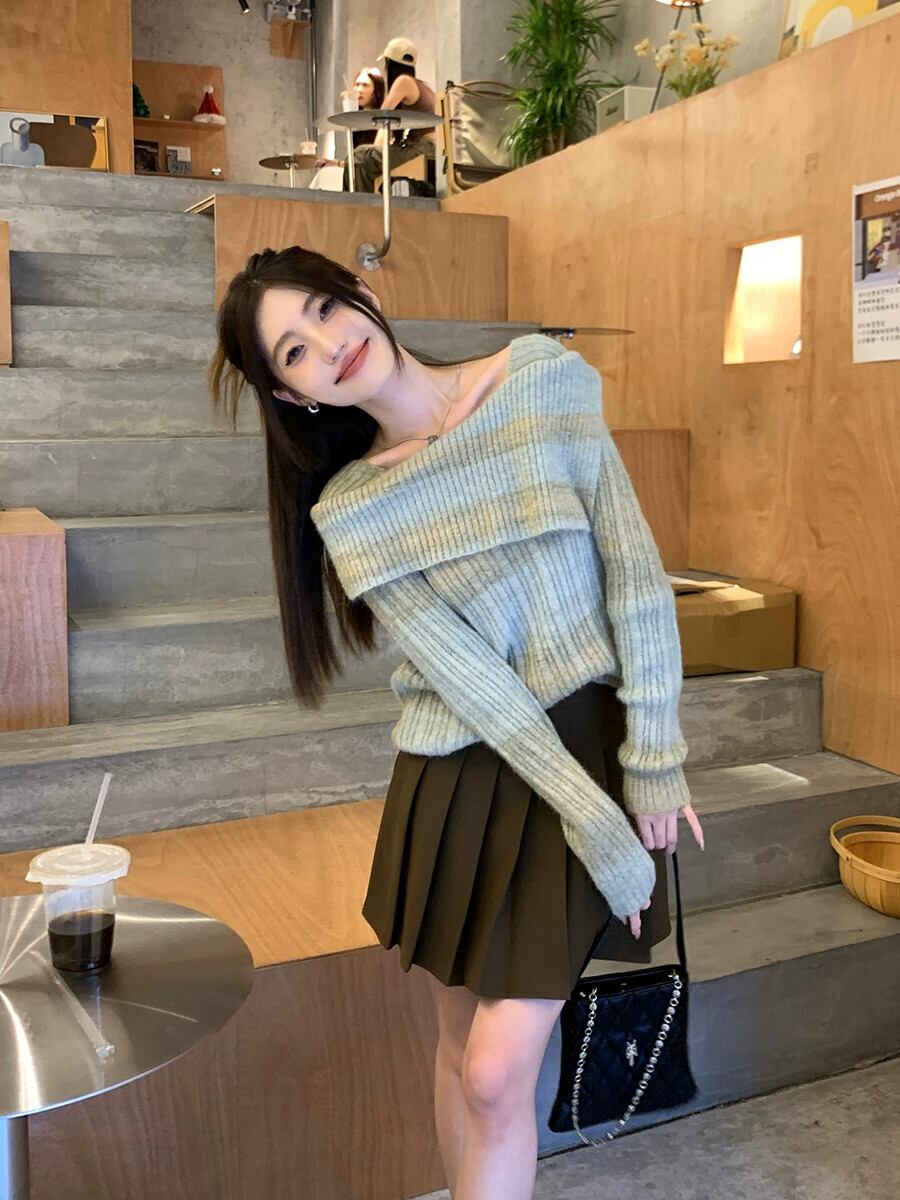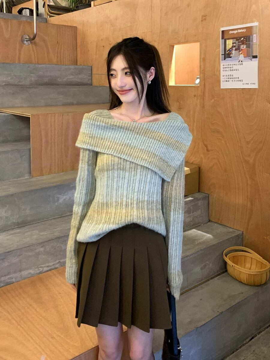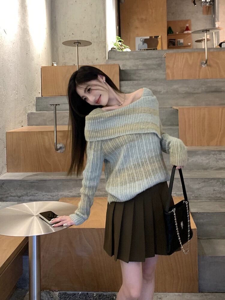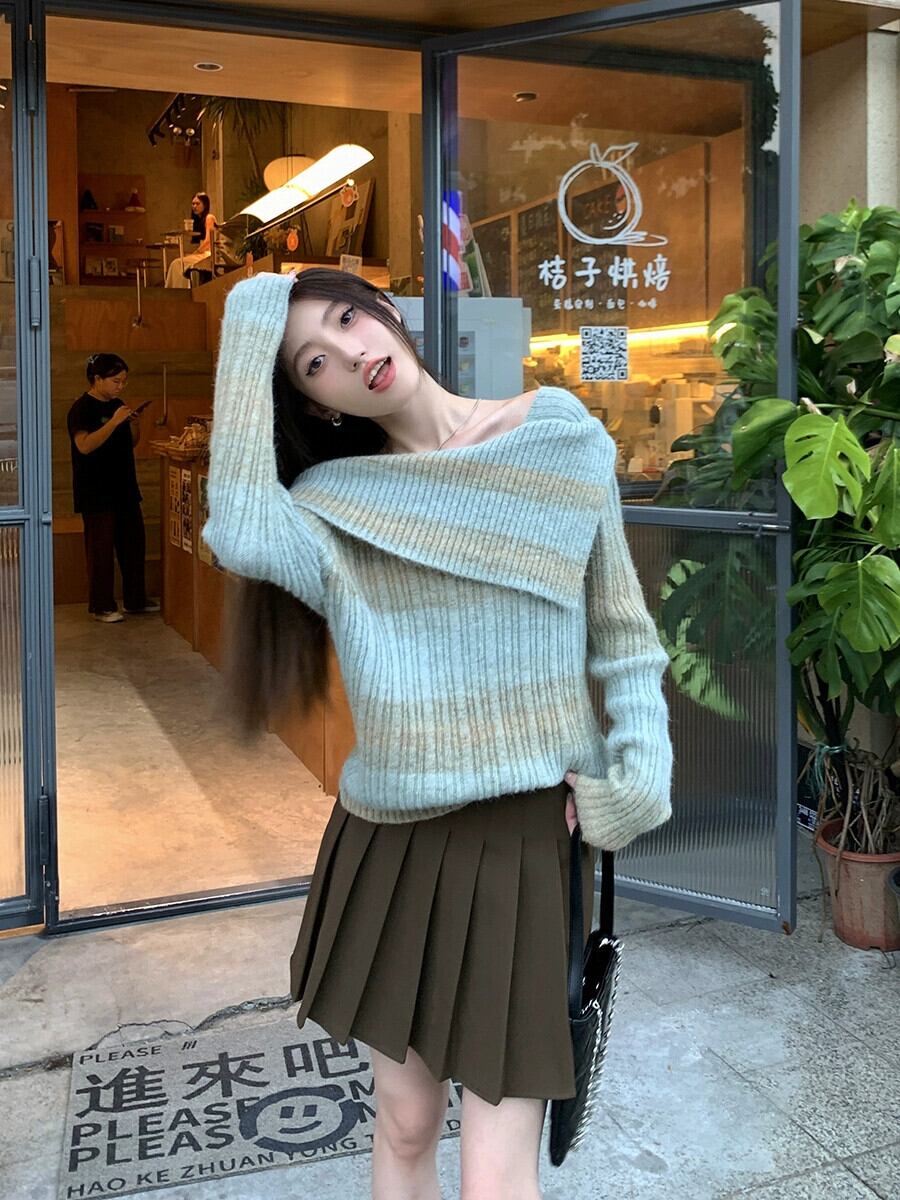 ワンショルダープルオーバーセーター女性秋 2024 新しいフレンチニッチストライプデザイン甘くてスパイシーな長袖セーター ロング 大人ガーリー スウィート キュート カジュアル オータム 秋物 missk98069523542