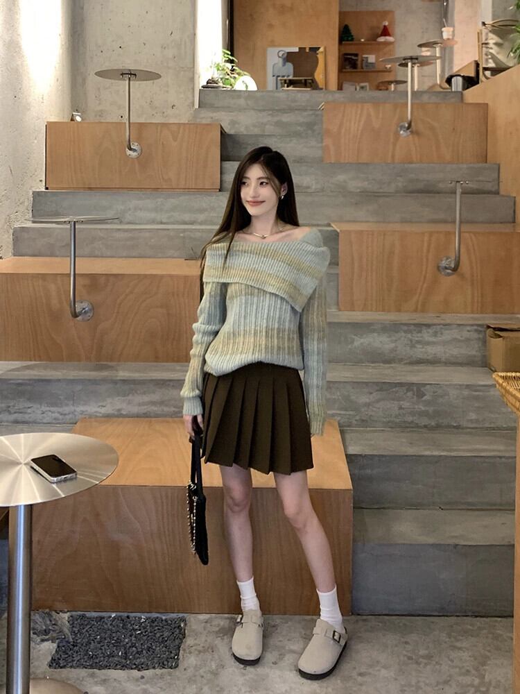色:コーヒーカラーのプリーツスカート,グラデーションストライプセーター