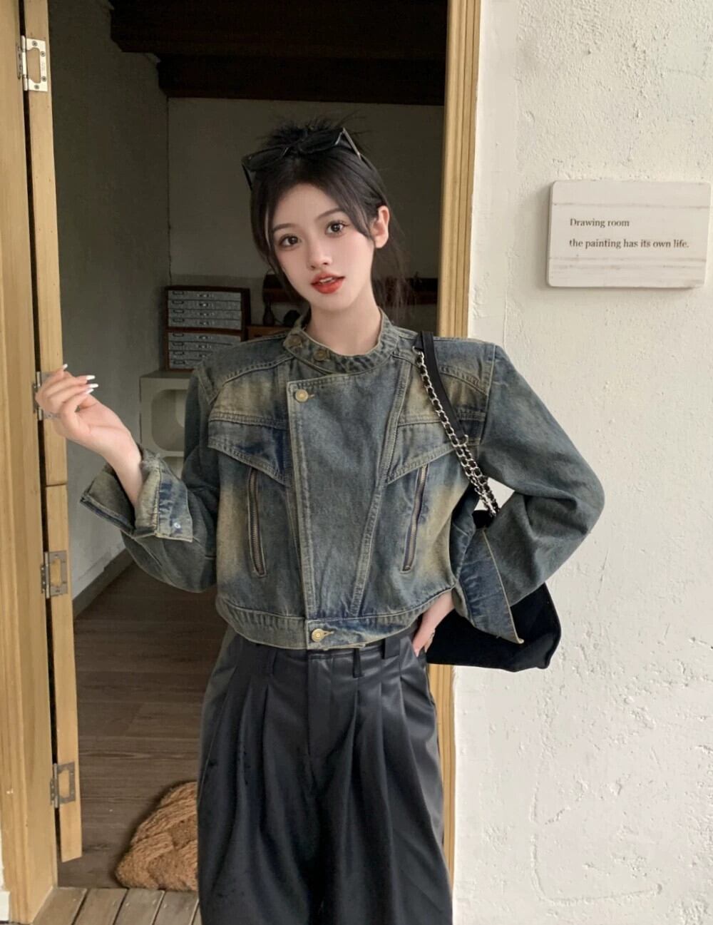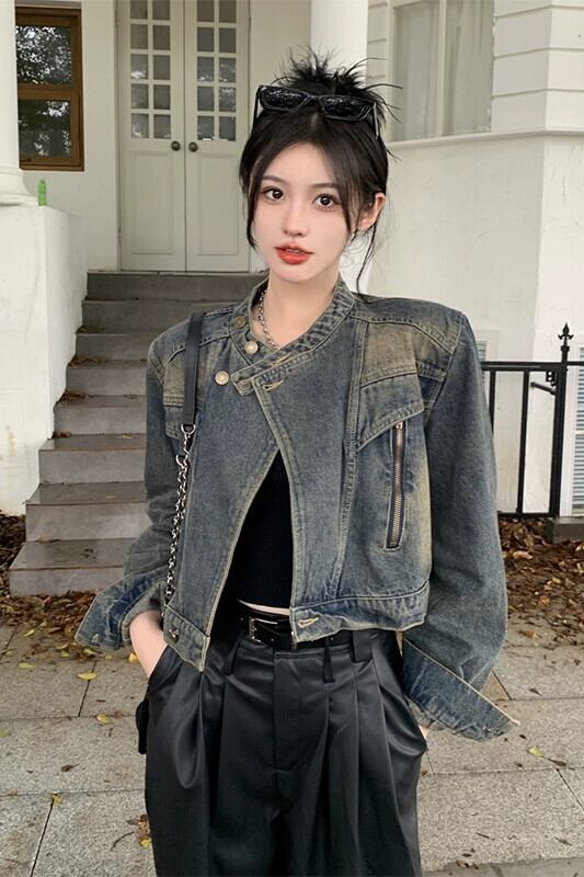 ハンサムなデニムオートバイのジャケットの女性秋 2024 新しいレトロ多用途ルーズショート長袖トップイン ロング オータム 秋物 missk32791442243