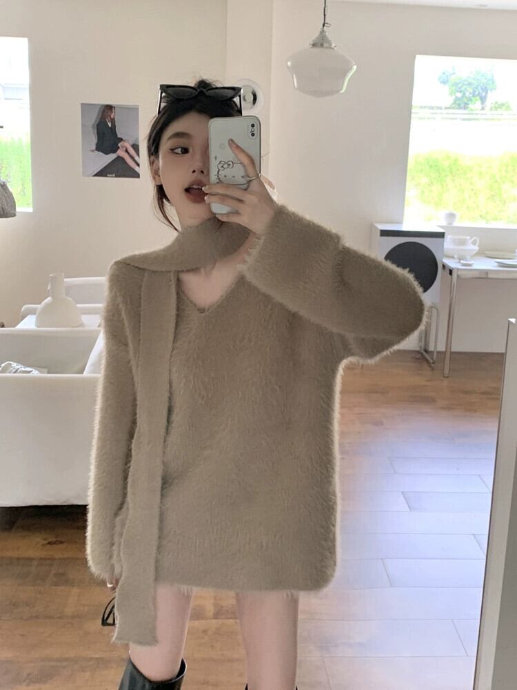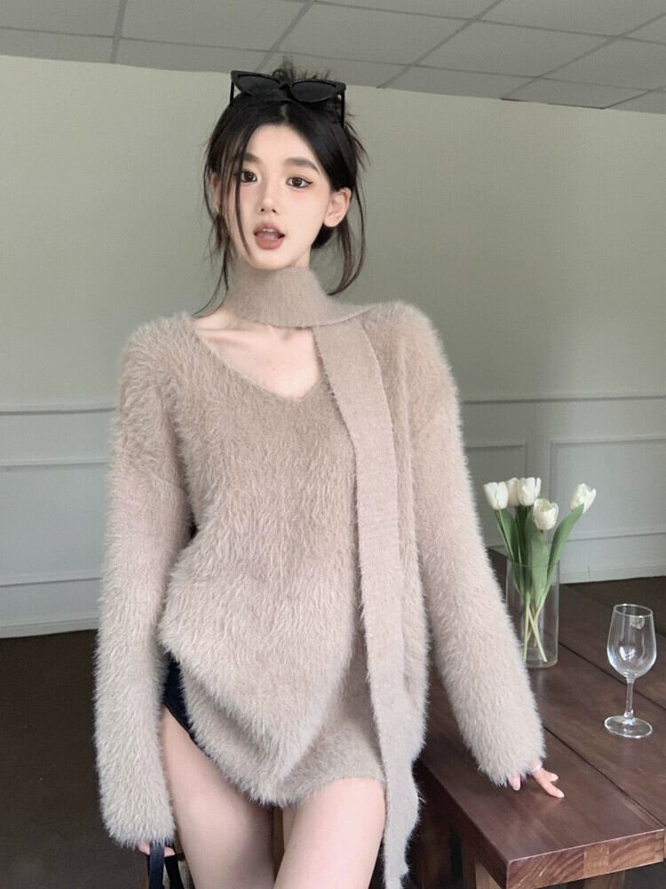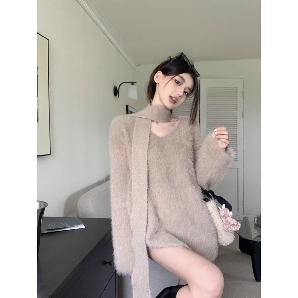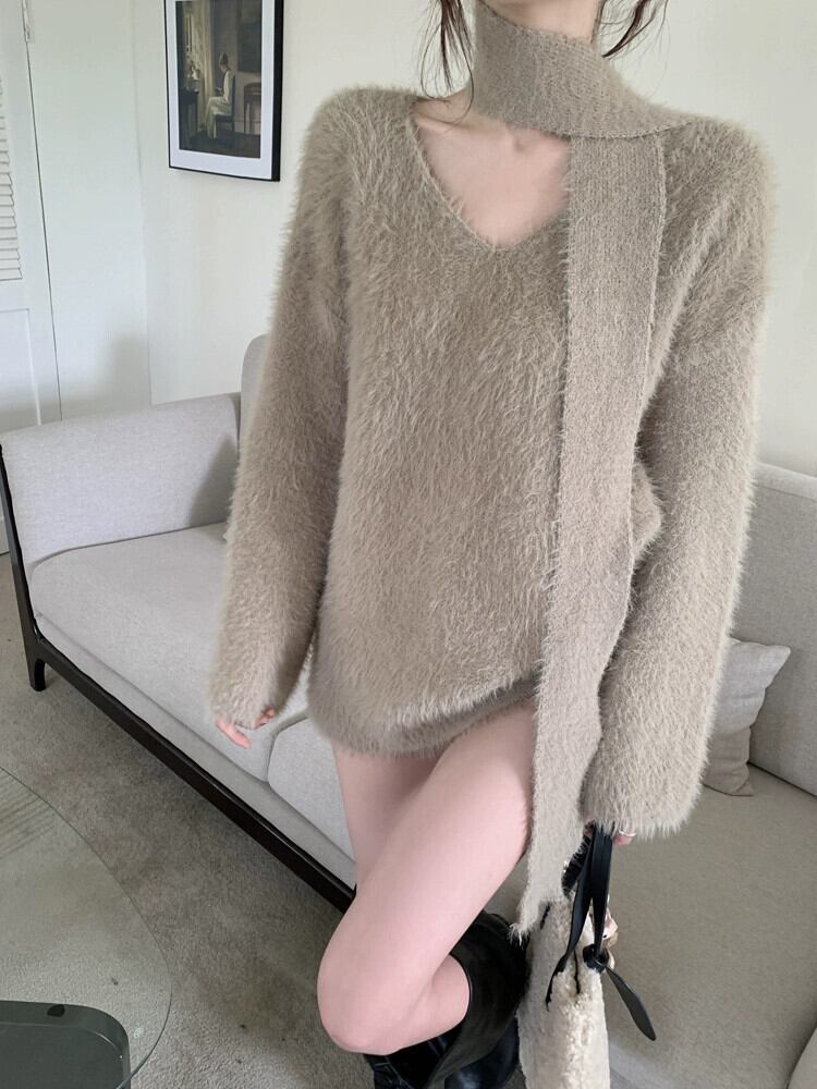 模造ミンクセーター女性秋冬 2024 新しいソフトで優しいスタイル V ネックルーズリボンデザイン長袖トップ ロング オータム 秋物 ウィンター 冬物 Vネック missk49022956186