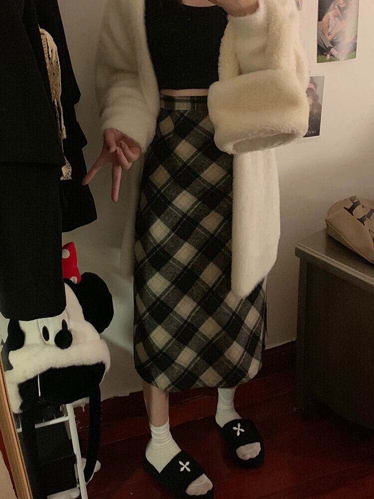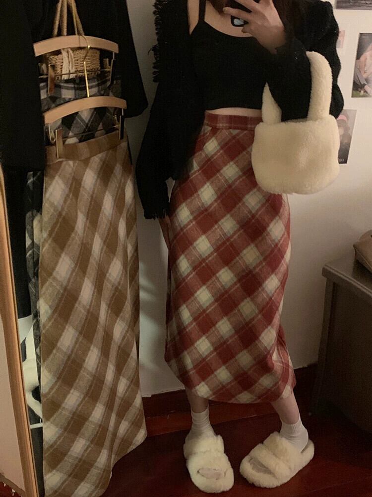 レトロチェック柄ウールスカート女性の秋冬 2024 新しいハイウエストスリムミッドレングス気質ヒップカバーストレートスカート オータム 秋物 ウィンター 冬物 missk85535906770