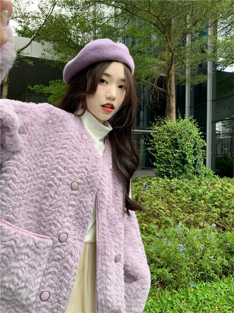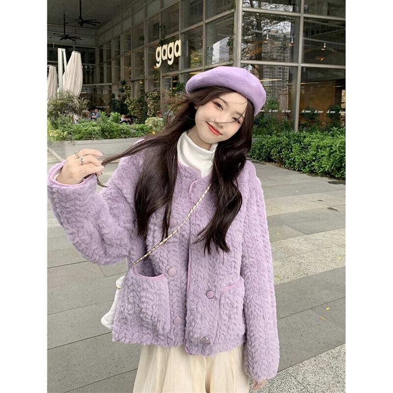 Xiaoxiangfeng 毛皮コートの女性の模造ラムウール秋冬 2024 新しい厚く暖かいルーズパープル長袖トップ ロング オータム 秋物 ウィンター 冬物 missk24594991252