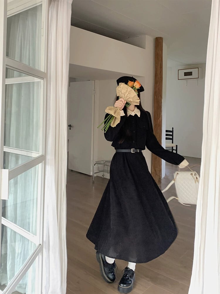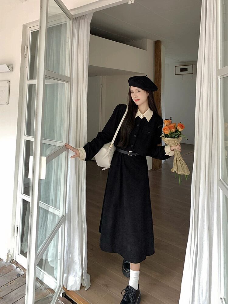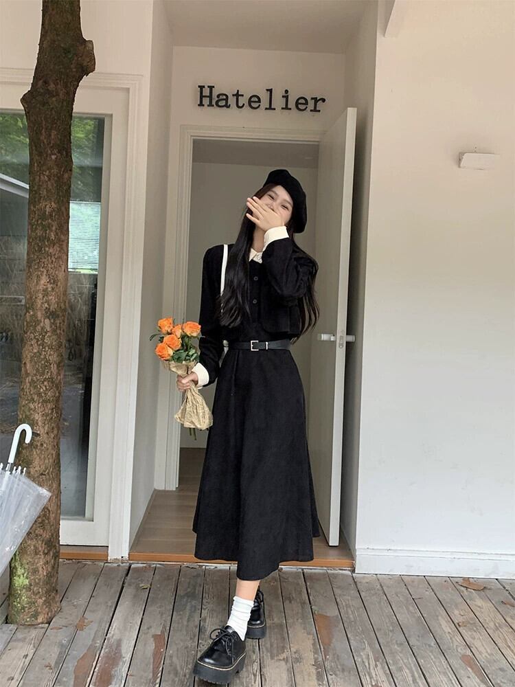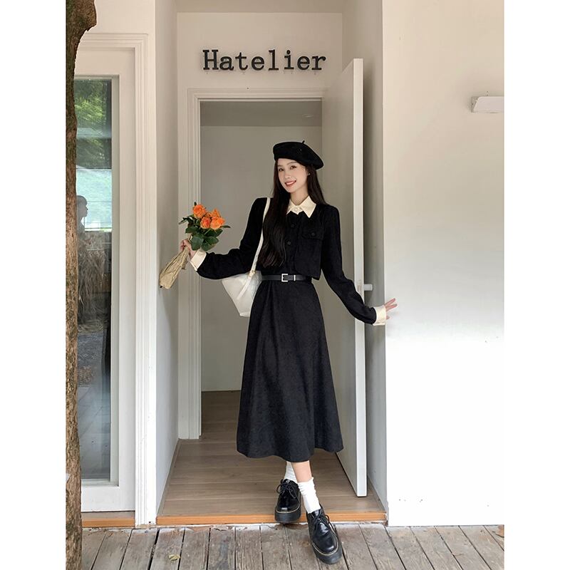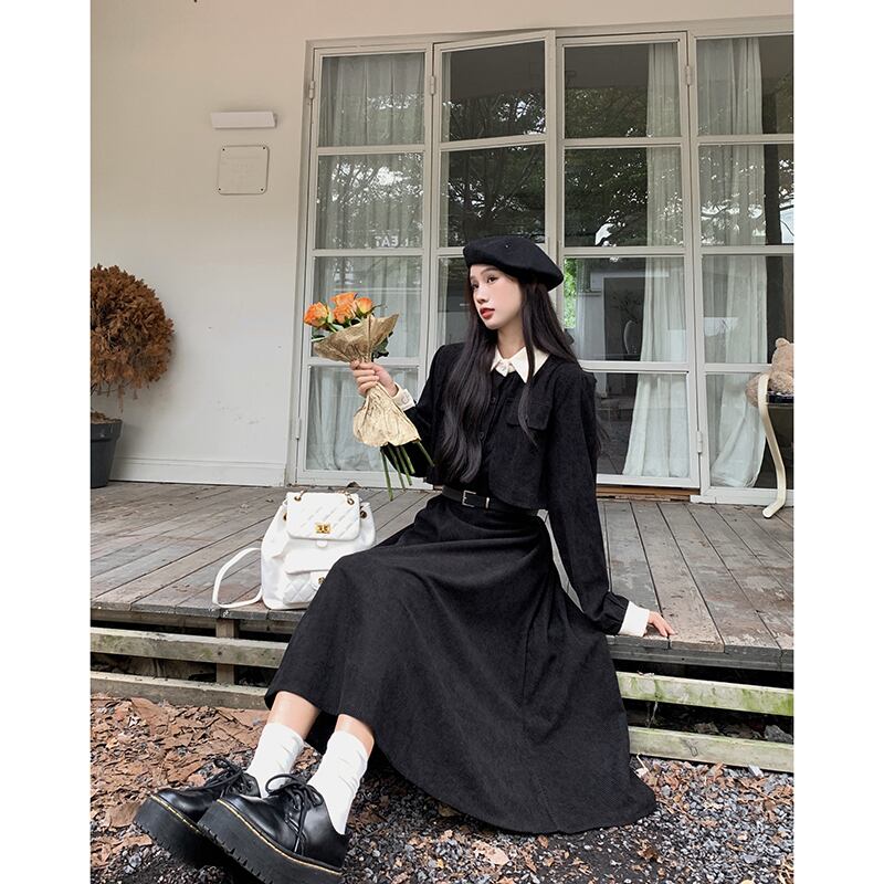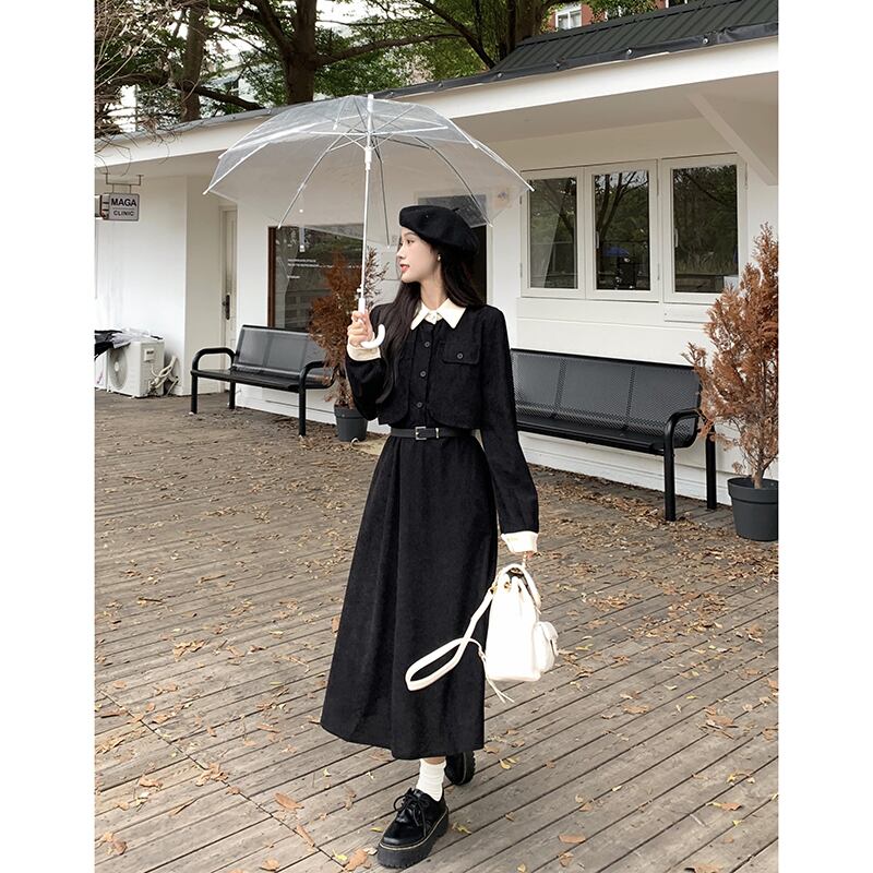 フレンチスタイルのコーデュロイドレスの女性秋 2024 新しいスタイルウエスト痩身ニッチカジュアル黒ミッドレングススカート ブラック オータム 秋物 missk95201429806