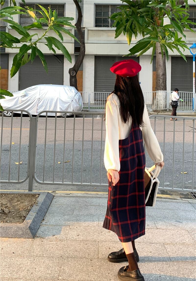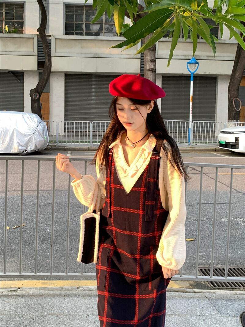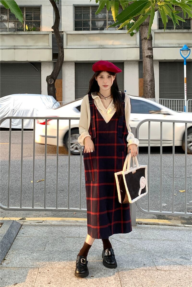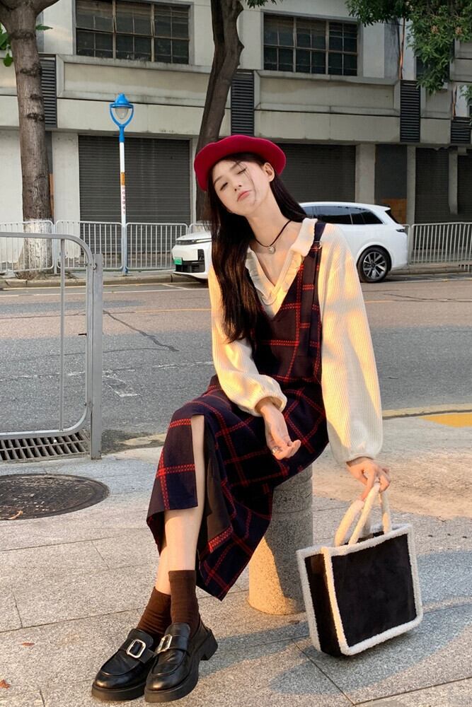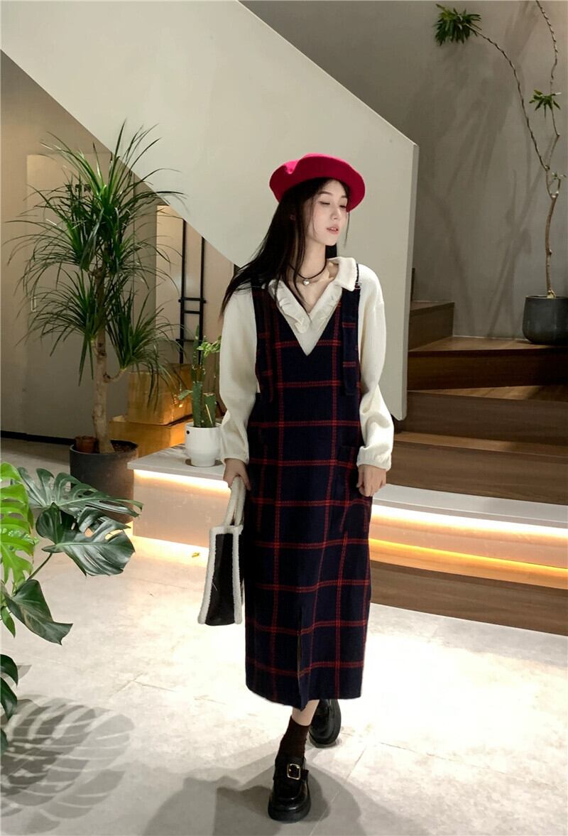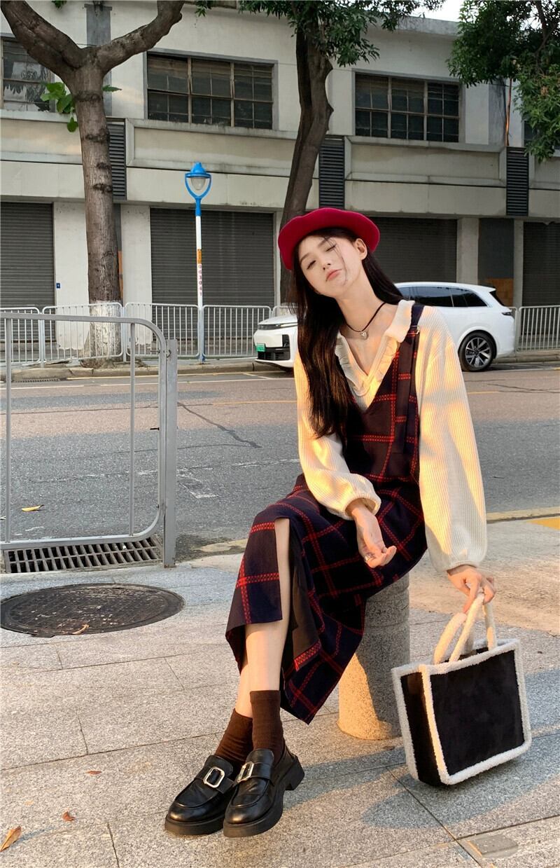 レトロチェック柄サスペンダードレス女性秋 2024 新しいスタイルフレンチルーズミッドレングスデザインストレートスカート オータム 秋物 missk55026053559