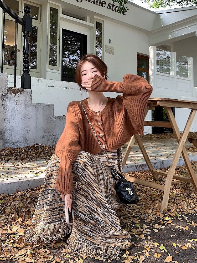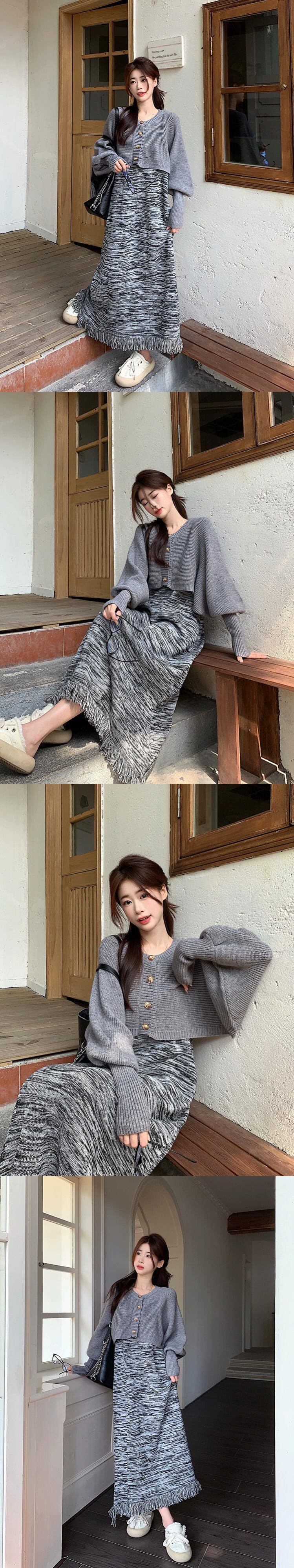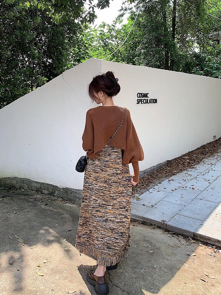 色:茶色のセーターサスペンダースカート,黒のセーターサスペンダースカート,コーヒーカラーのセーターコート,グレーのセーターコート