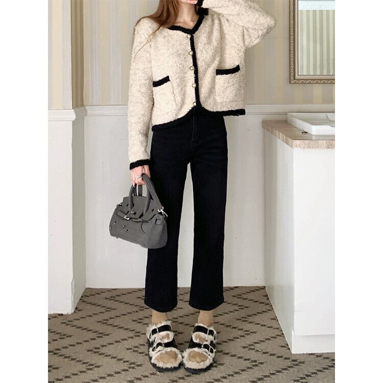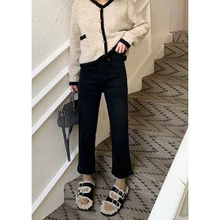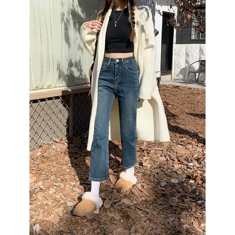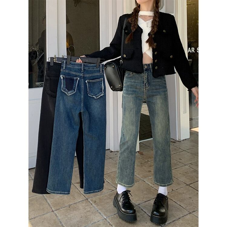 ベルベット肥厚ストレッチジーンズ女性秋 2024 新しいハイウエストスリム洗浄レトロストレート 9 点パンツ オータム 秋物 missk25987625726
