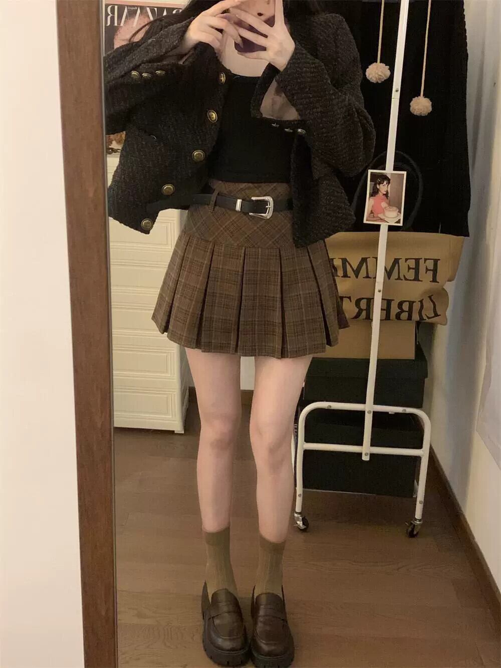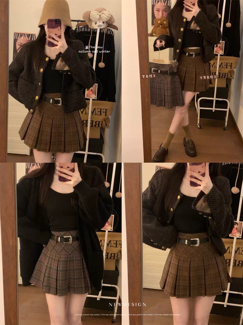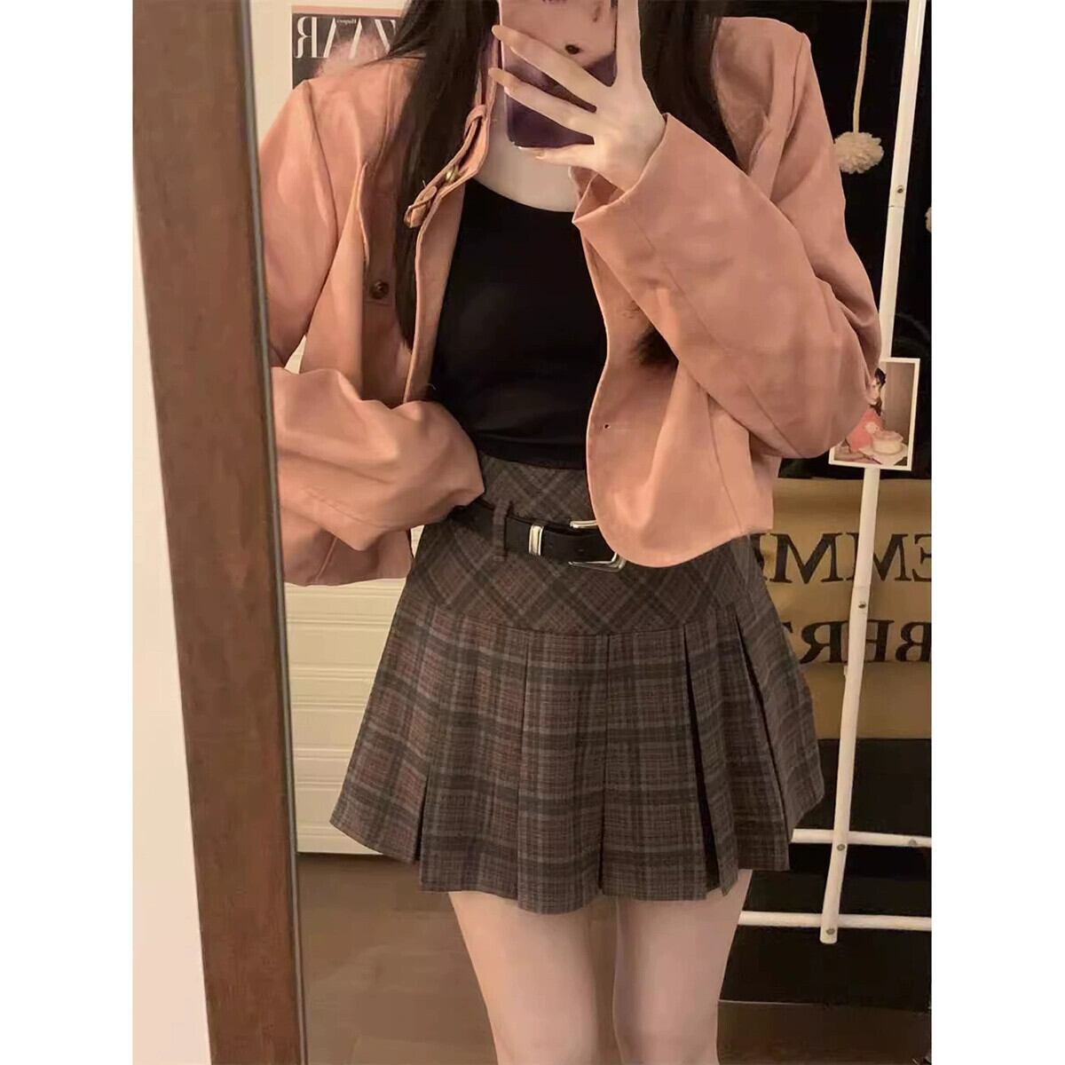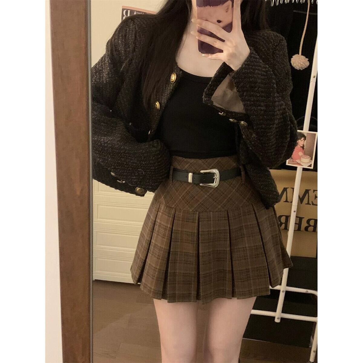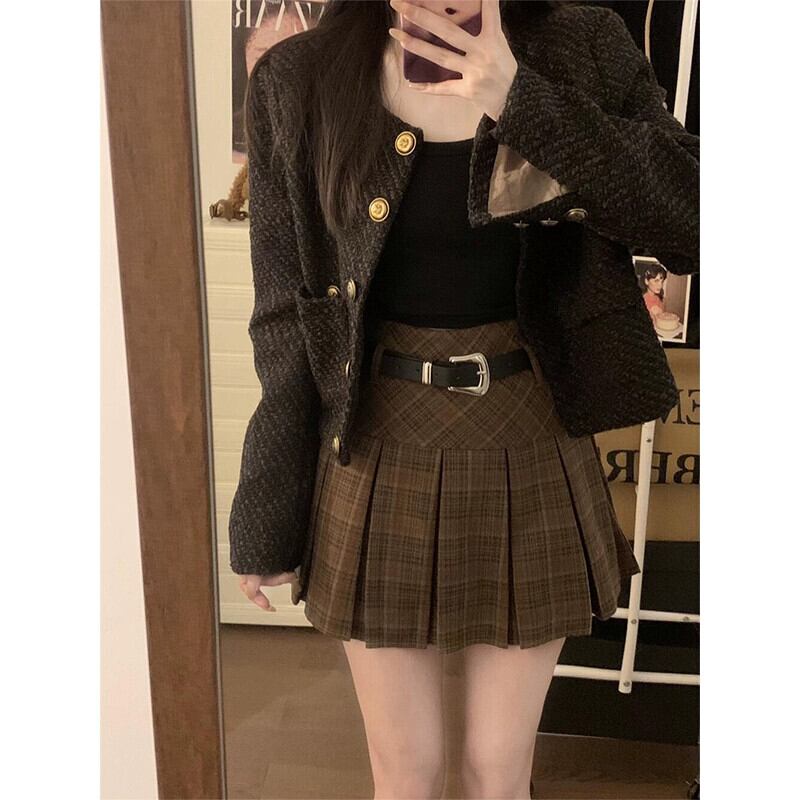 -ウエストチェック柄スカート女性秋 2024 新しいレトロ香港スタイルスリムプリーツスカート A ラインスカート オータム 秋物 Aライン missk6158745997