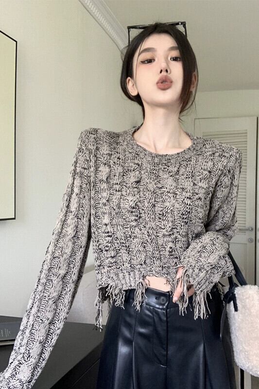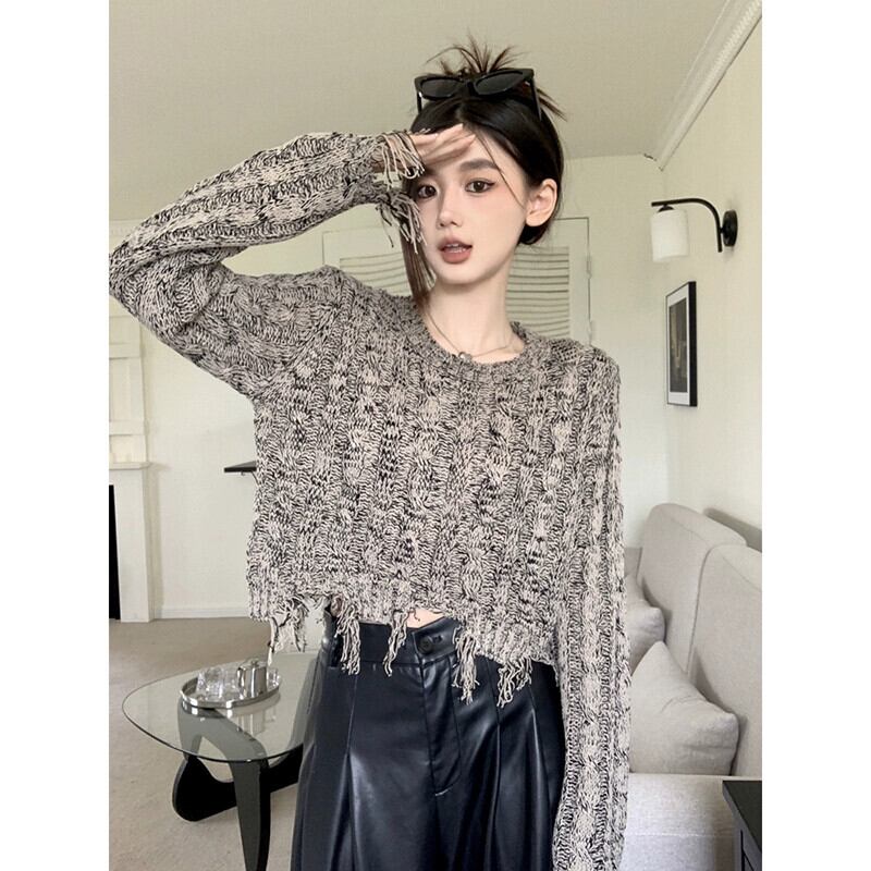 アメリカンスタイルリッピング生エッジニットセーター女性秋と冬2024新デザインショートルーズシック長袖トップ ロング オータム 秋物 ウィンター 冬物 missk21174027032