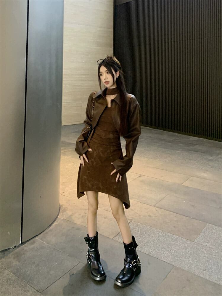 色:コーヒーカラーのレザージャケット,コーヒーカラーのチューブトップスカート