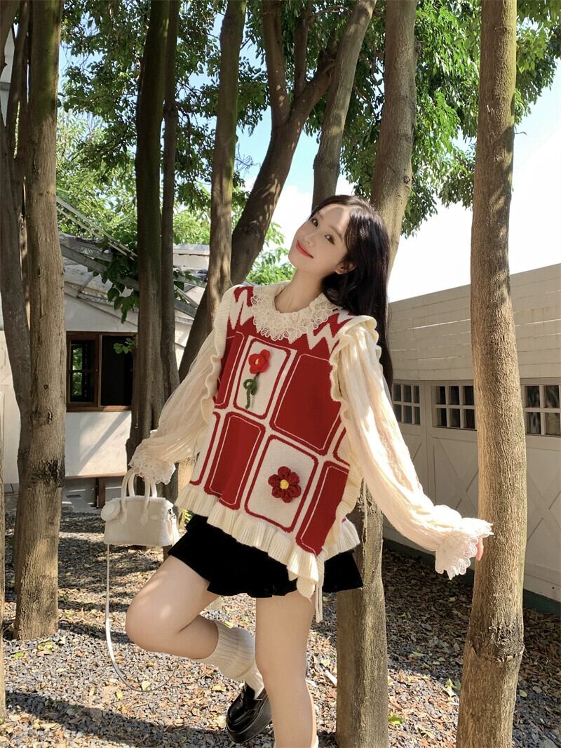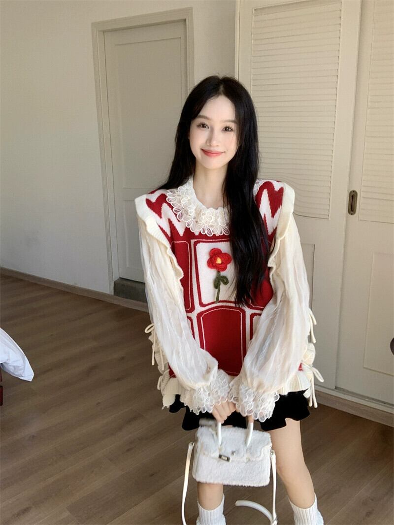 甘い立体花デザインストラップニットベスト長袖シャツ女性の秋の 2024 新しいファッションスーツ ロング 大人ガーリー スウィート キュート カジュアル オータム 秋物 フラワーデザイン missk48783145777