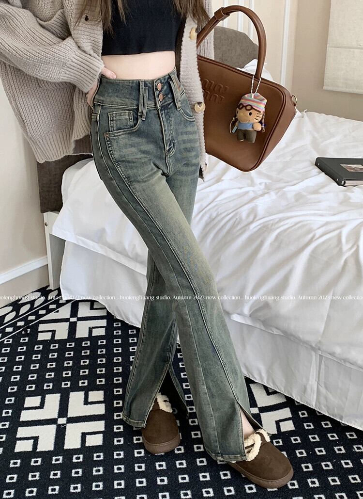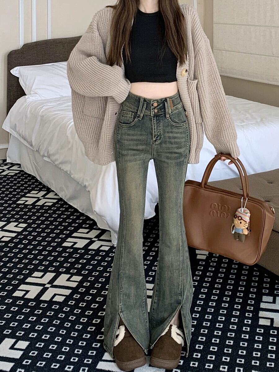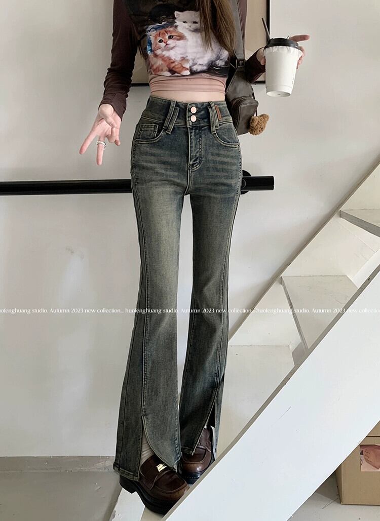 レトロハイウエストストレッチジーンズ女性秋冬 2024 新しいスリムデザインスリットパンツ床長フレアパンツ レッド オータム 秋物 ウィンター 冬物 missk50754492059