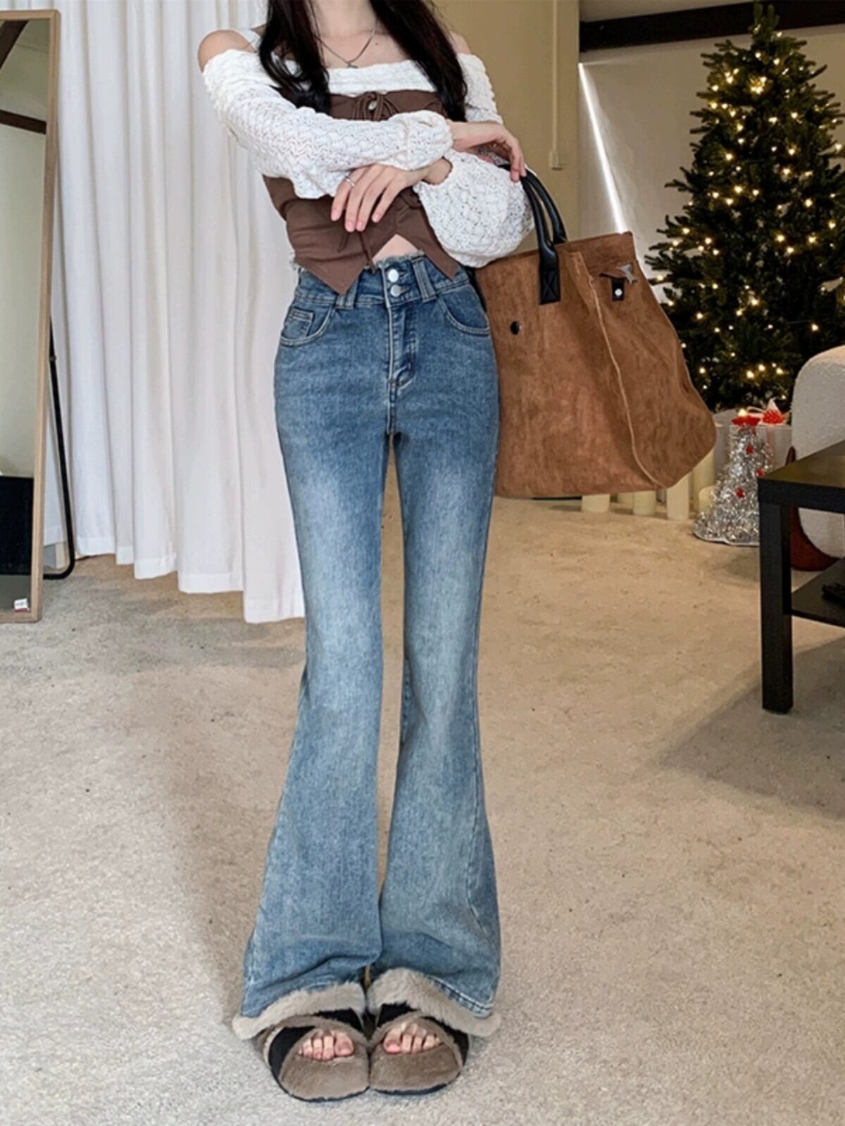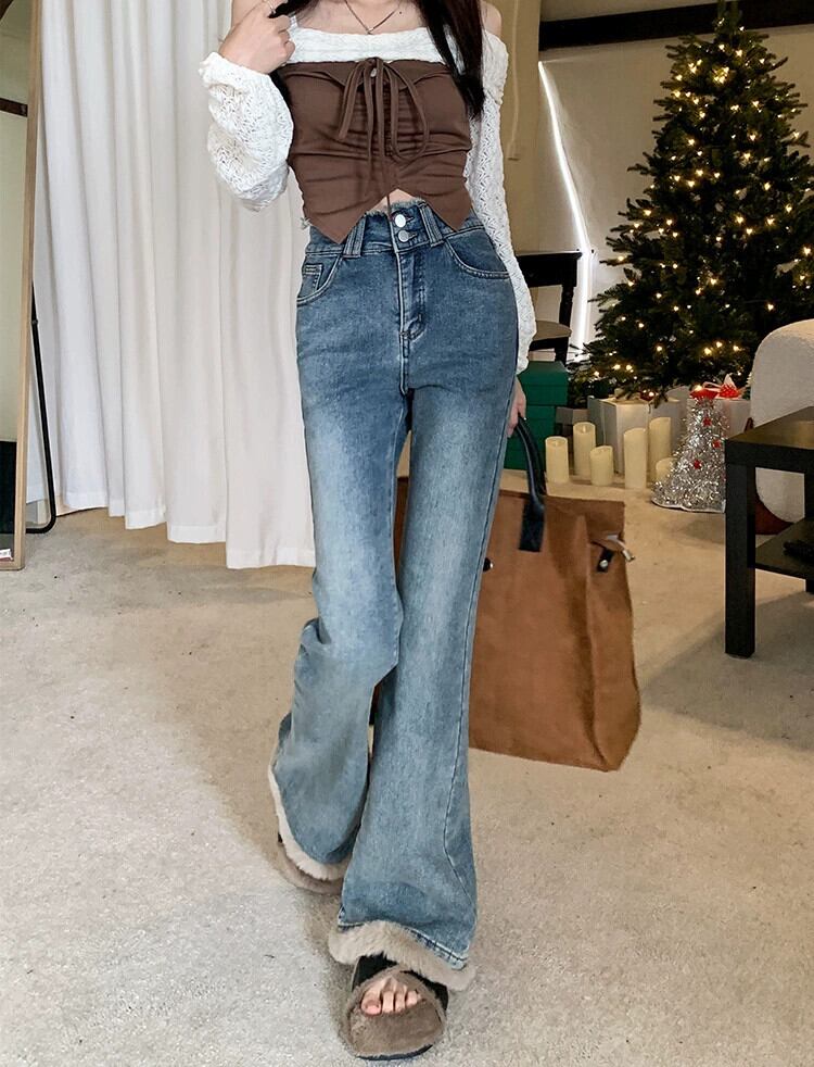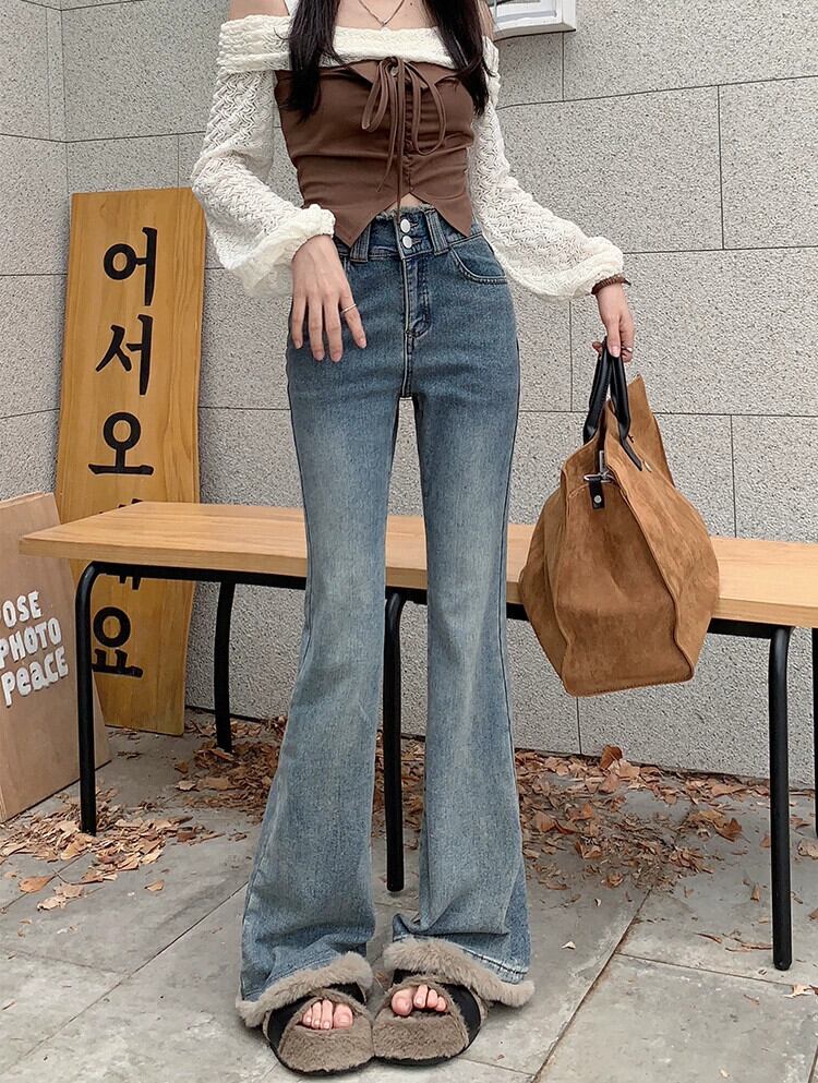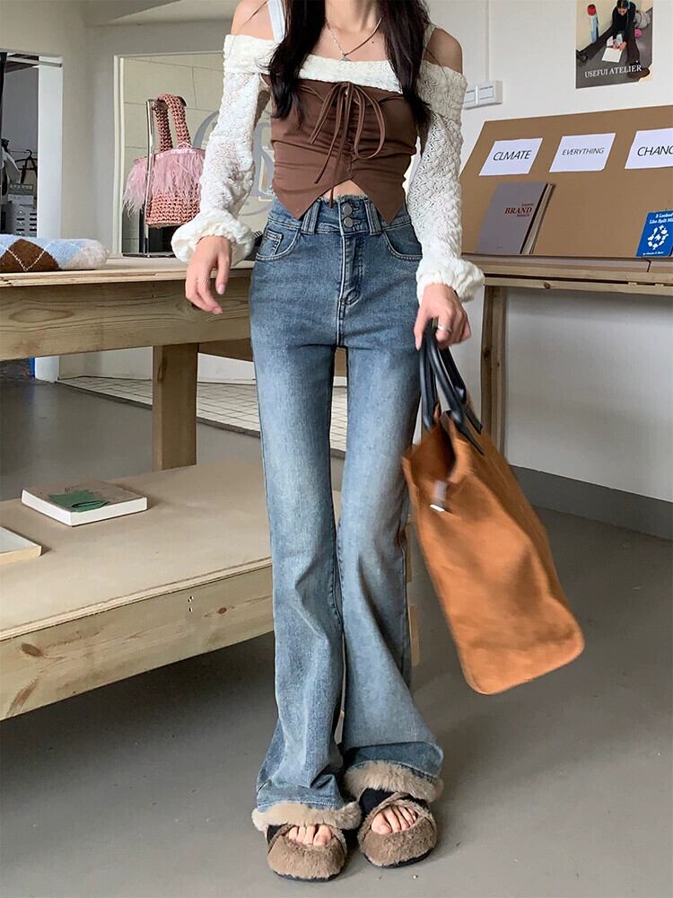 猫猫スプライシングブーツカットパンツ女性 2024 秋の新しいスタイルのレトロなハイウエストスリムデザインジーンズ床長パンツ オータム 秋物 missk83429381825