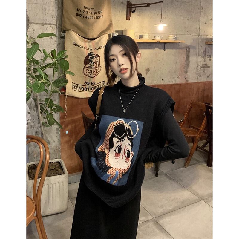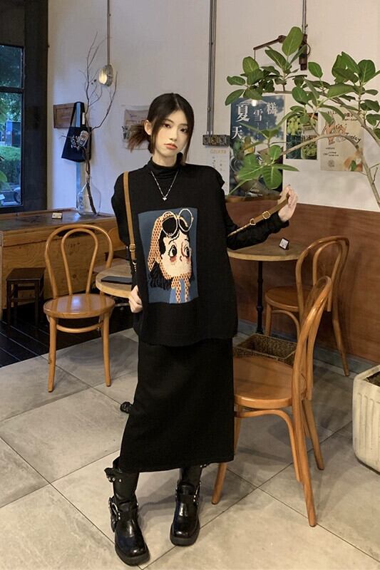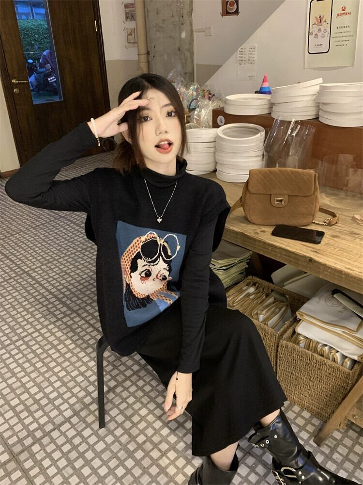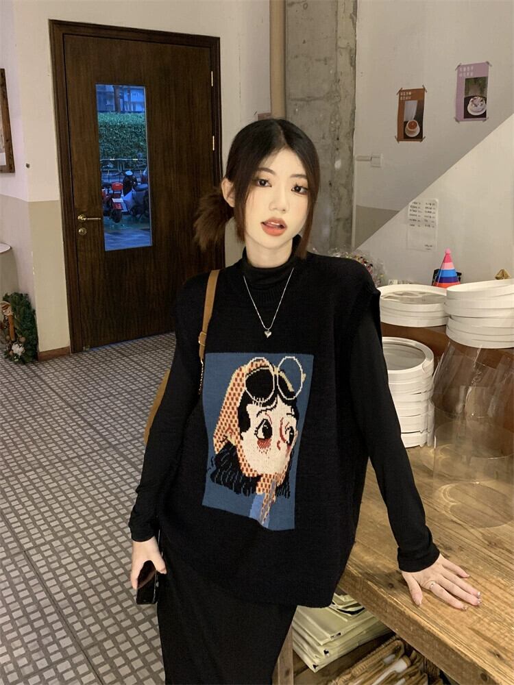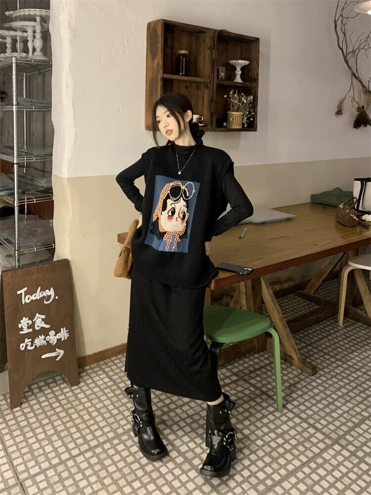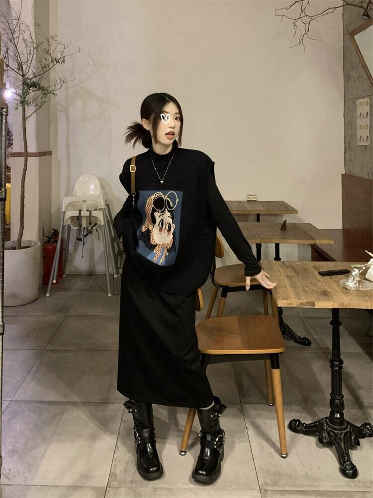 レトロ漫画ニットベストハイカラー底シャツスリットスカート女性秋 2024 新しいファッション 3 点セット オータム 秋物 missk24294853623