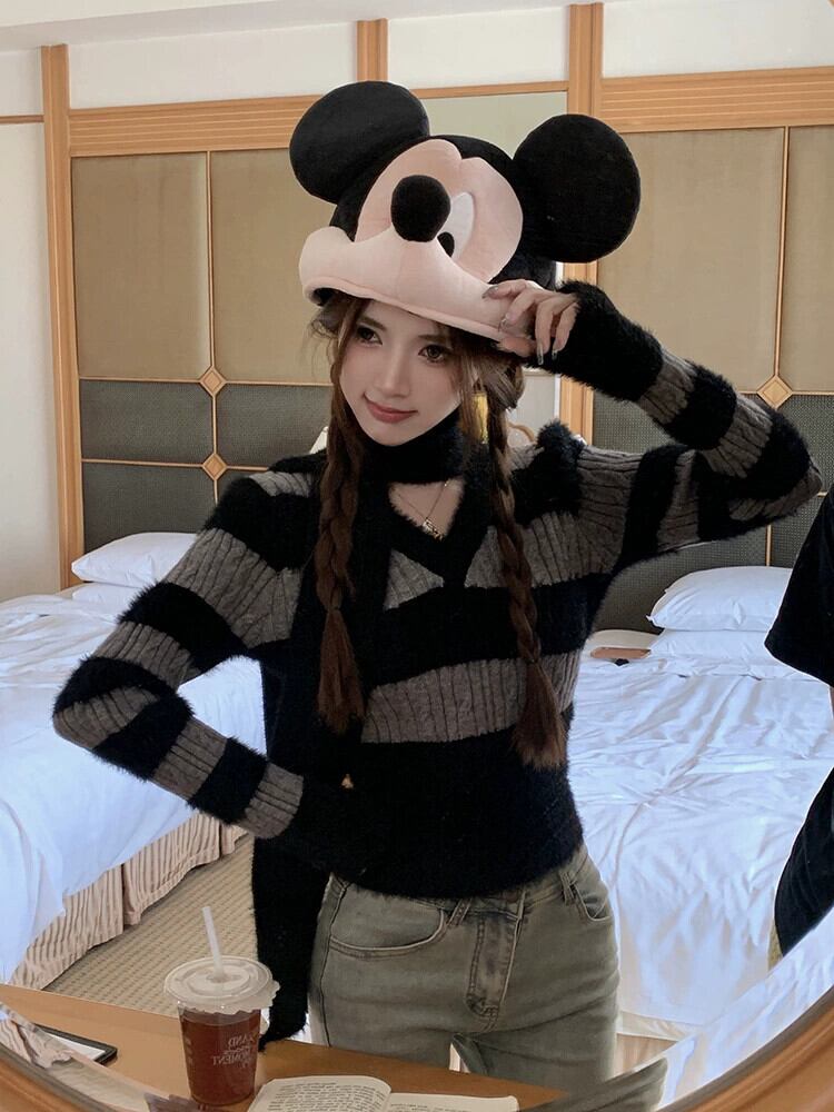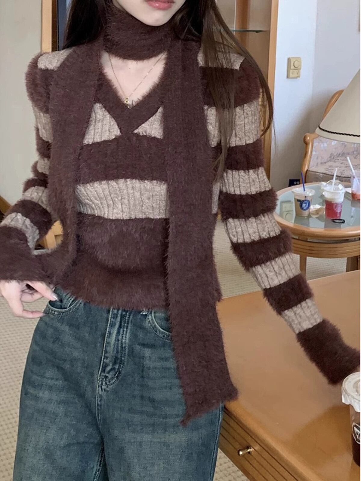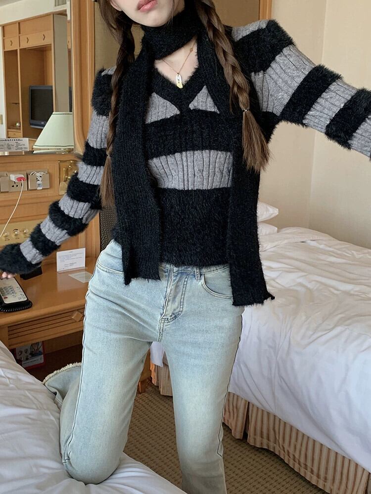 モヘアストライプ V ネック長袖セーター女性秋と冬 2024 新しいレトロなソフトワックスショートニットトップ + スカーフ ロング オータム 秋物 ウィンター 冬物 Vネック missk82525980100