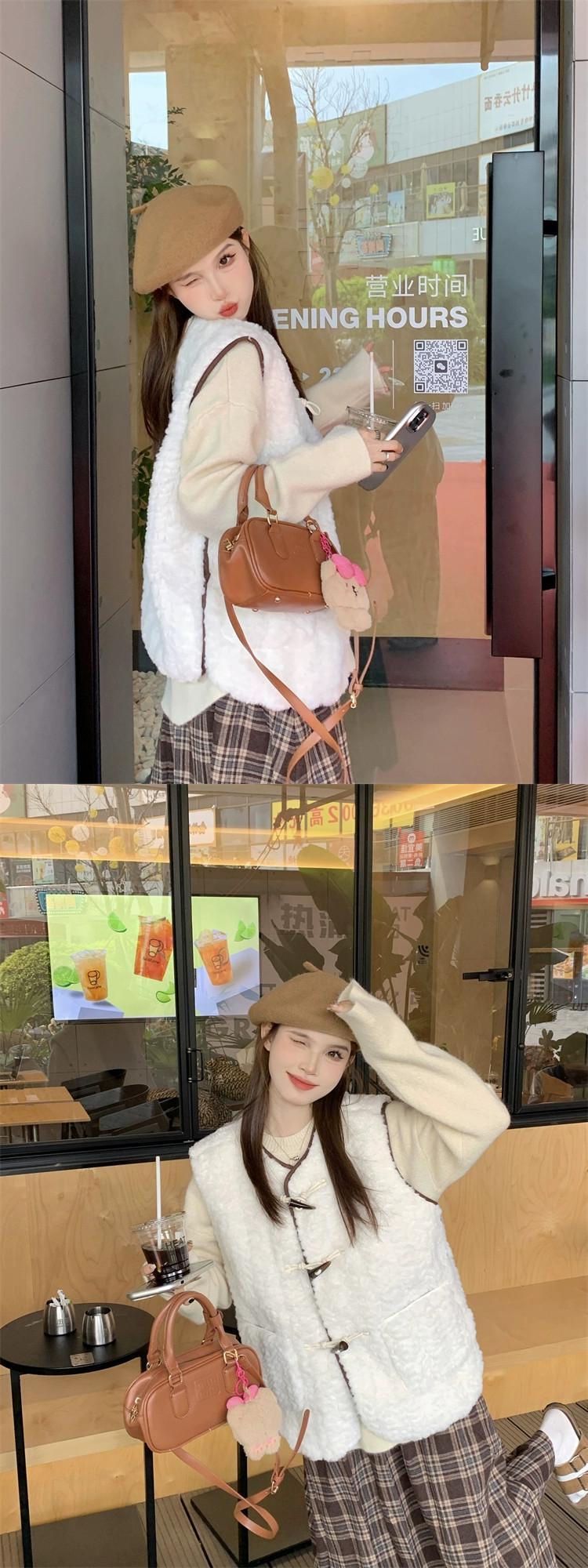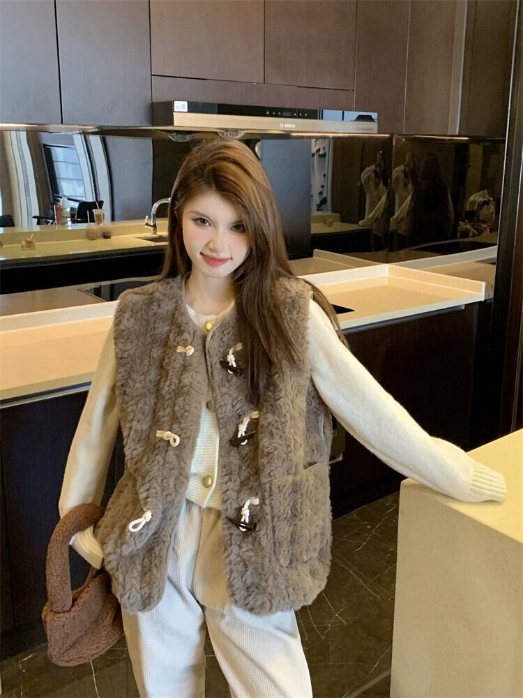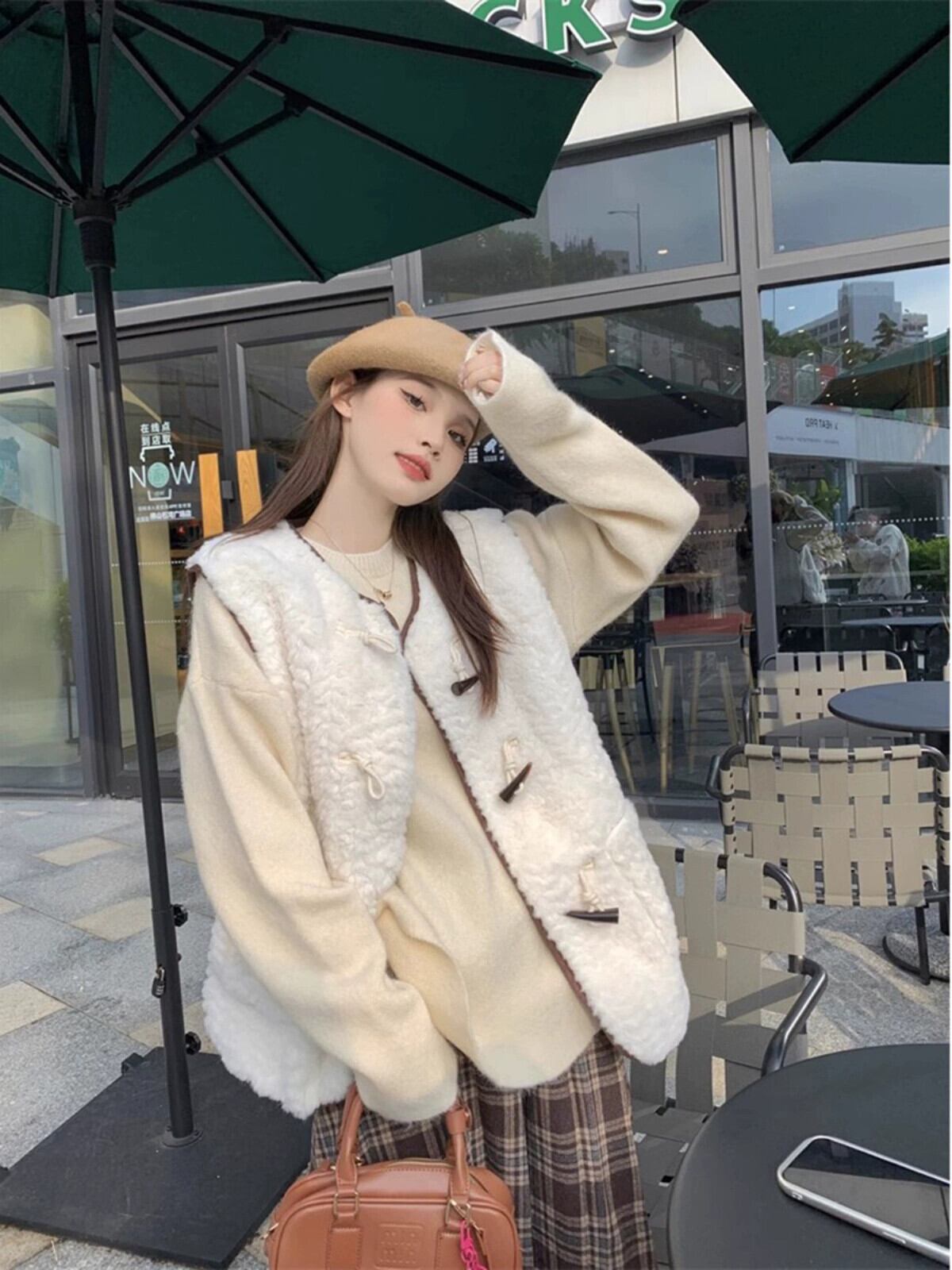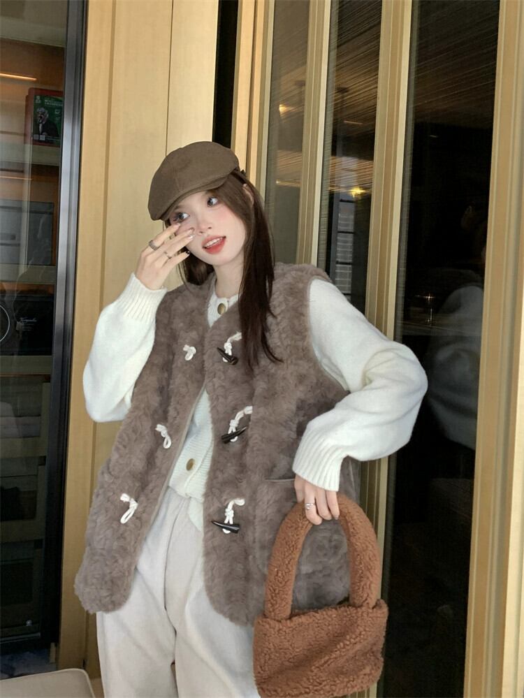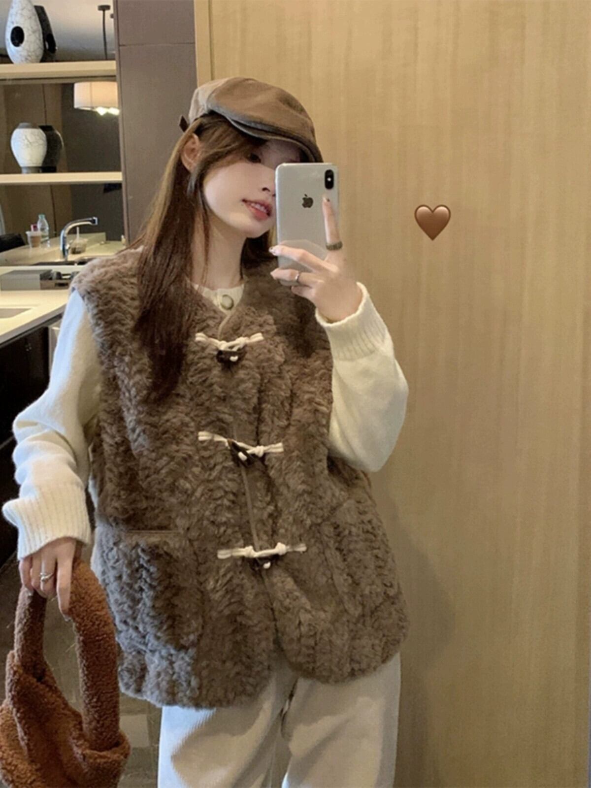 2024 秋の新スタイルのルーズでファッショナブルなホーンボタン模造子羊の毛のベストノースリーブジャケット女性のシックなトレンド オータム 秋物 missk35756866620