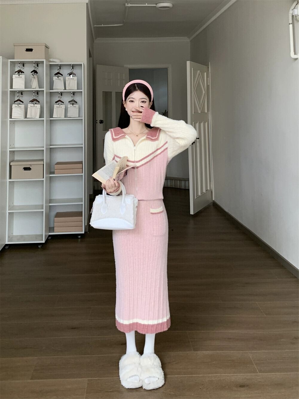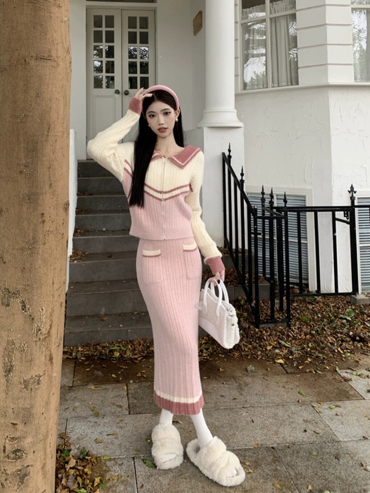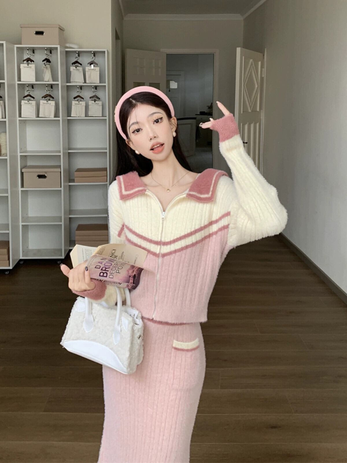 イミテーションミンクラペル優しい風長袖ニットカーディガンミドル丈スカート女性2024秋冬新作2点セット ロング オータム 秋物 ウィンター 冬物 missk87942828155