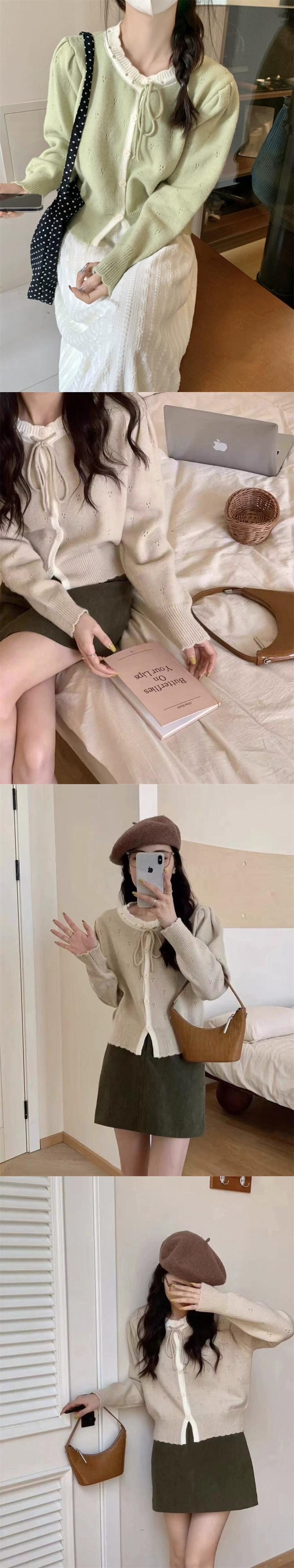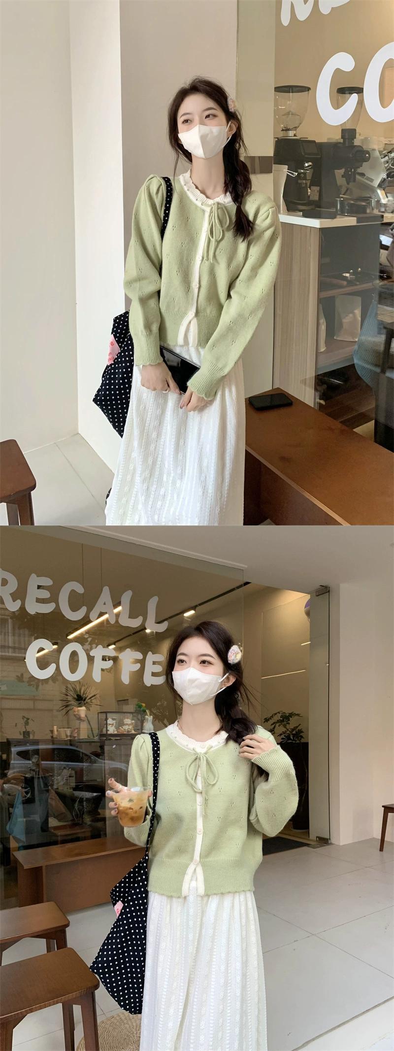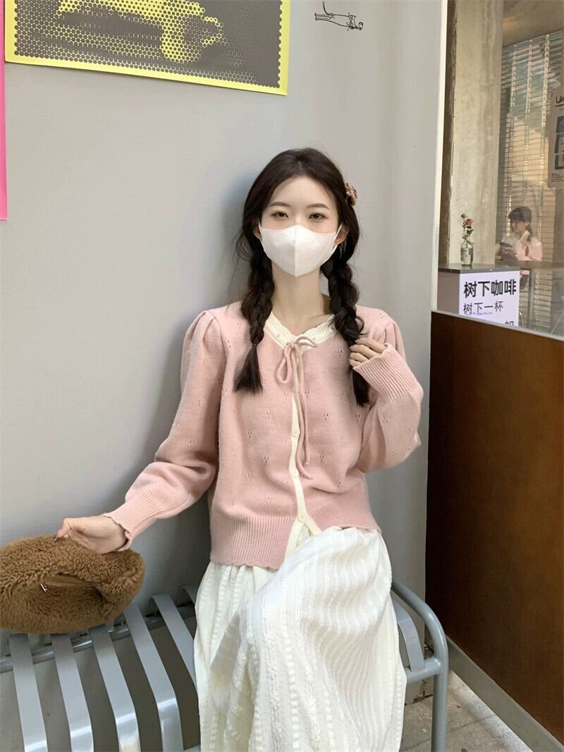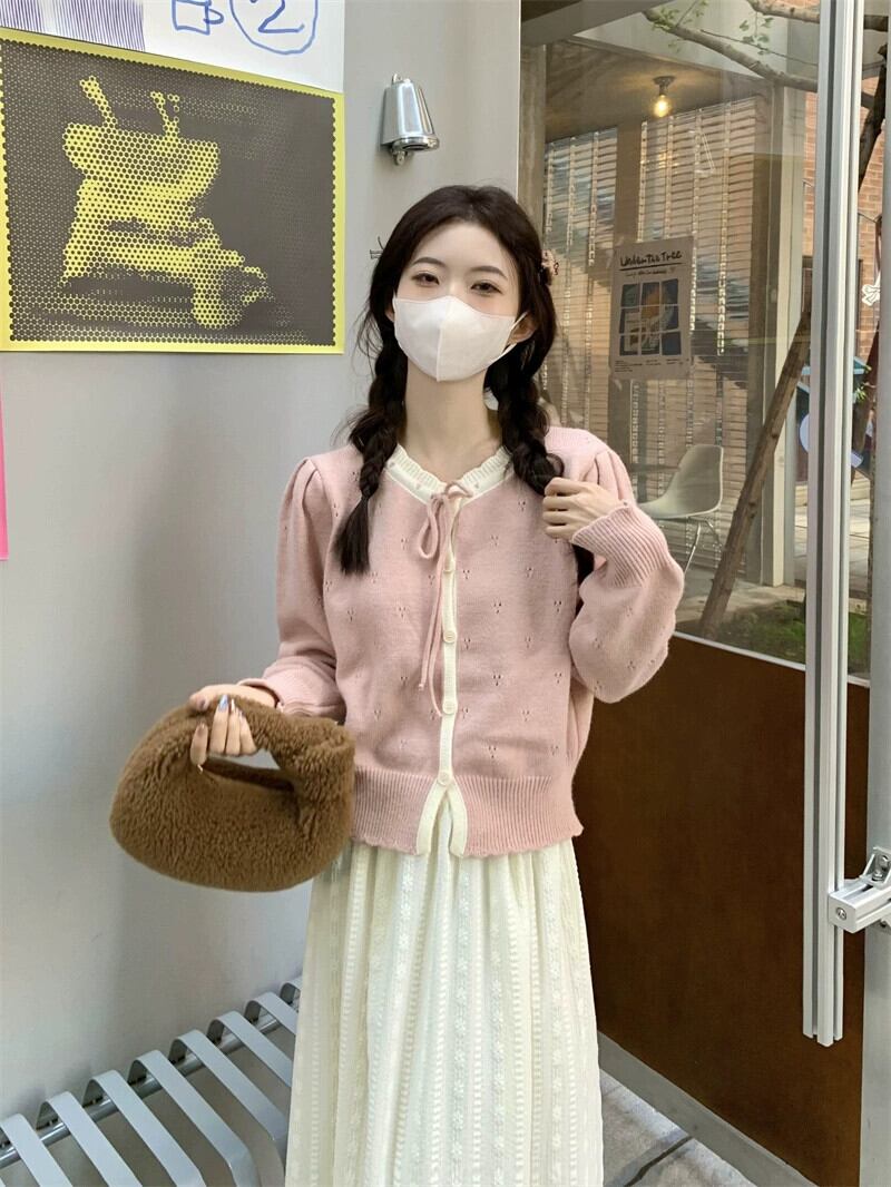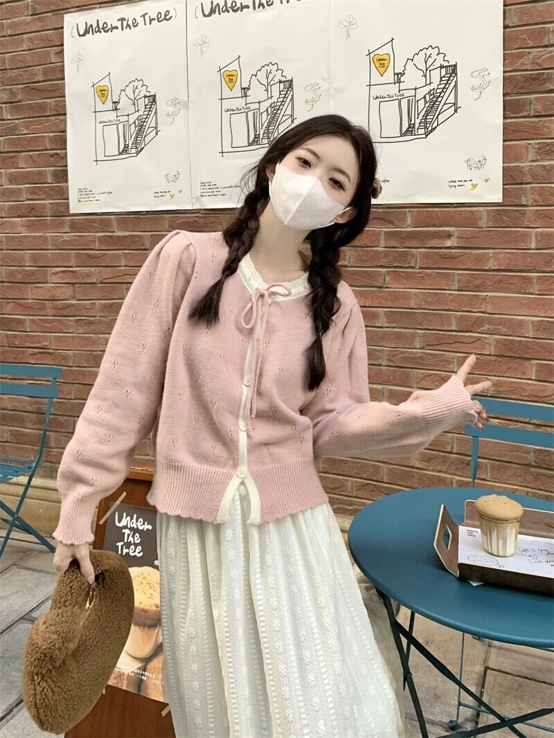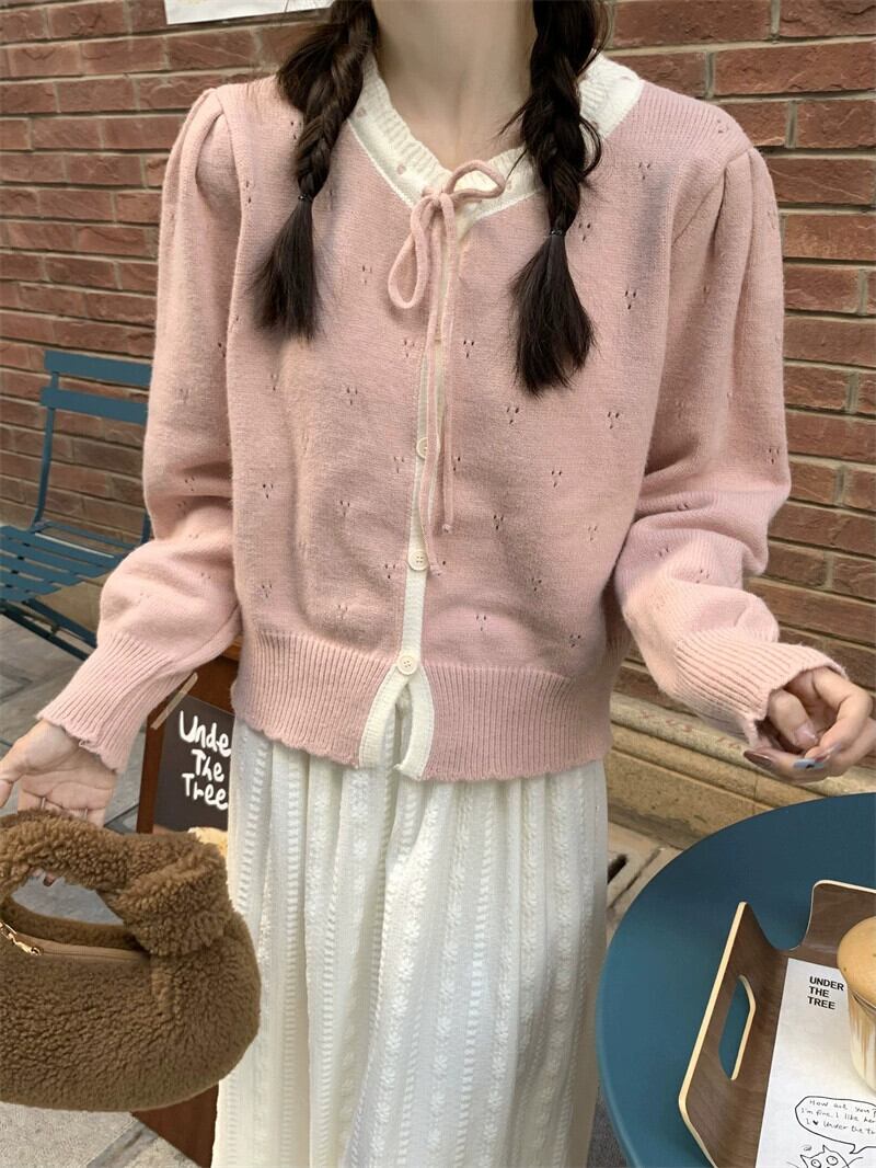 甘くて優しいスタイルの長袖ニットカーディガン女性秋 2024 新しいスタイルのレースアップ中空ソフトワックス状ルーズショートセーター ロング 大人ガーリー スウィート キュート カジュアル オータム 秋物 missk11070393640