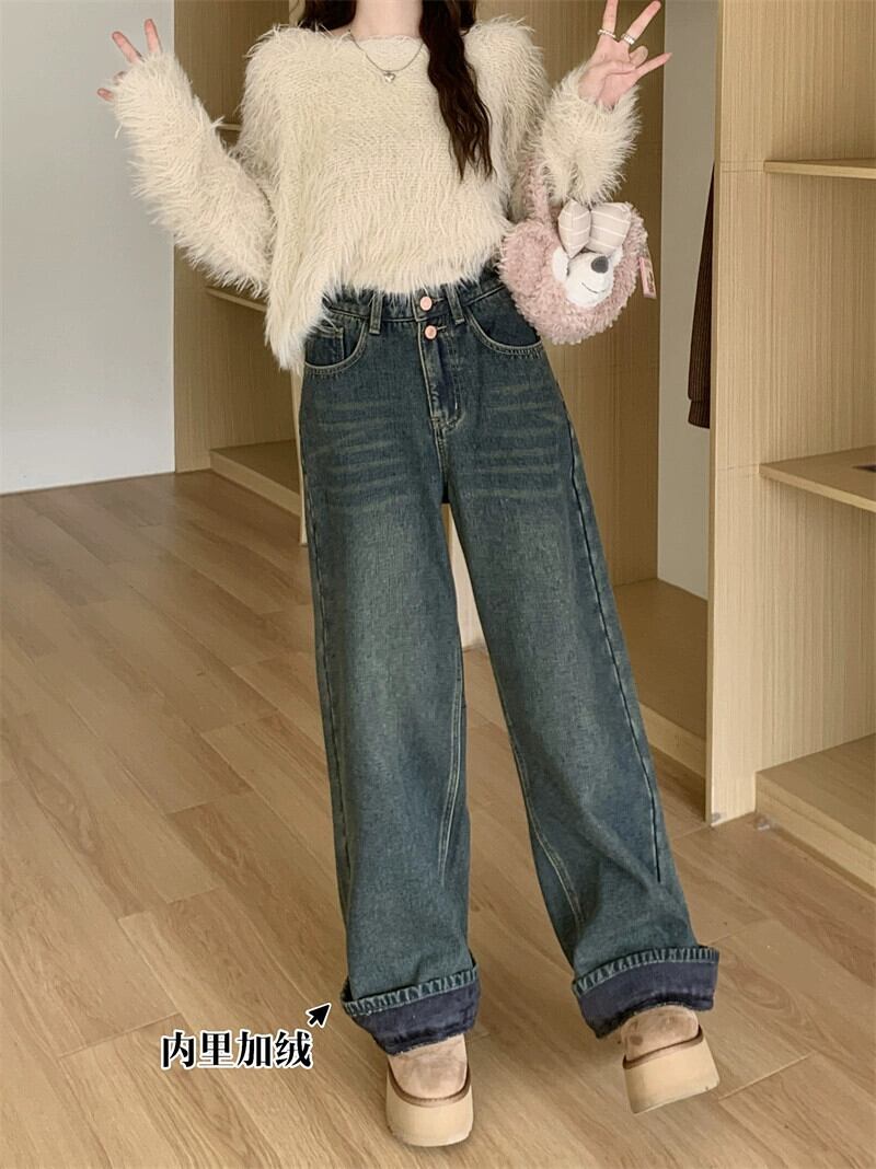 ベルベット肥厚ジーンズ女性、秋冬バージョン 2024 新しいハイウエスト痩身ルーズワイドレッグストレートフロアレングスパンツ オータム 秋物 ウィンター 冬物 missk19978986440