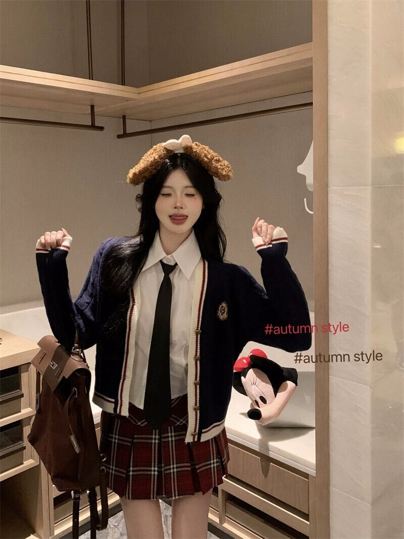 色:チェック柄スカート,シャツ+ネクタイ,白いカーディガン,ブルーカーディガン