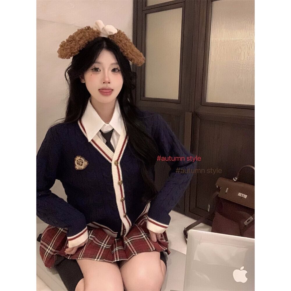 スタイル V ネック刺繍コントラストカラー長袖セーターチェック柄プリーツスカート女性の秋と冬の 2024 新しいファッションスーツ ロング レッド オータム 秋物 ウィンター 冬物 Vネック missk83599249933