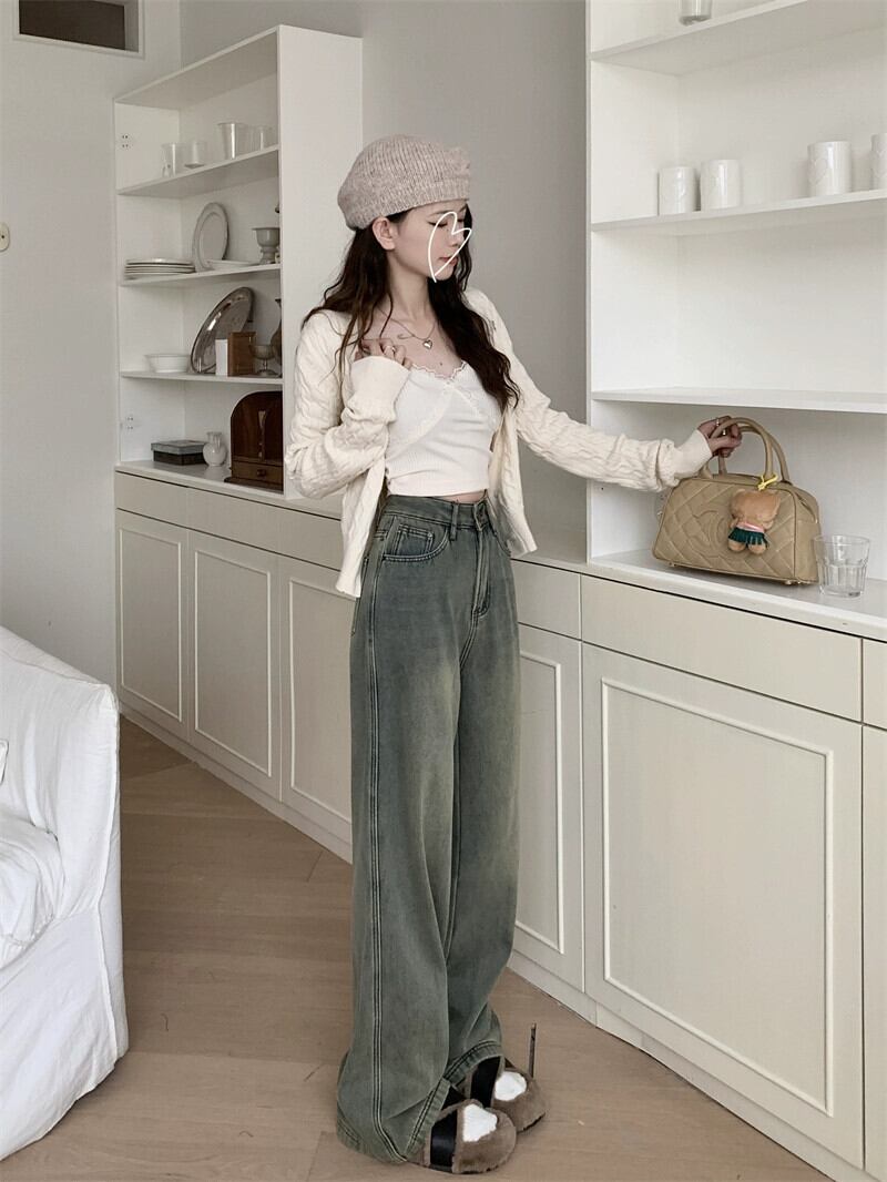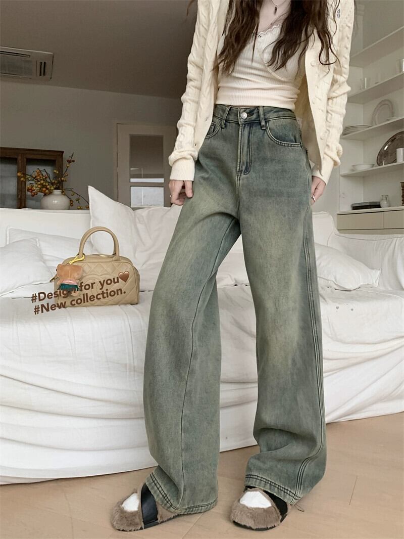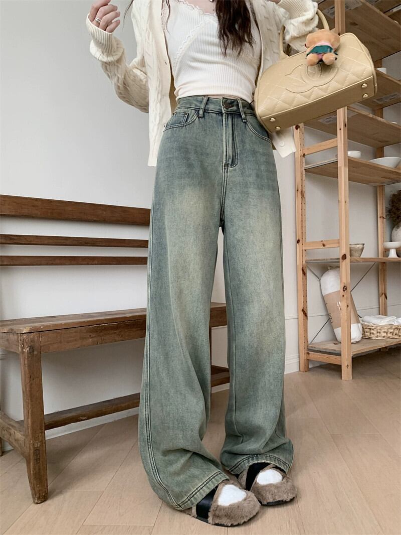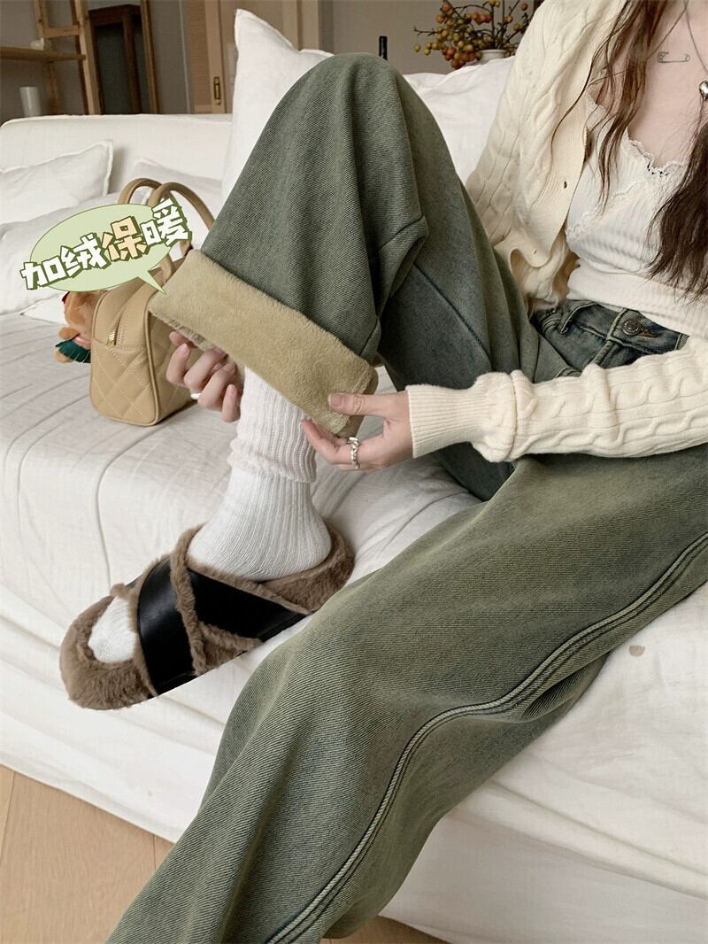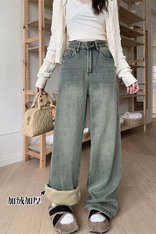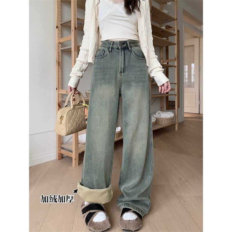アメリカの甘くてクールなベルベット厚みのあるジーンズの女性の秋と冬 2024 新しい多用途レトロなハイウエスト床までの長さのワイドレッグパンツ 大人ガーリー スウィート キュート カジュアル オータム 秋物 ウィンター 冬物 missk49802489689