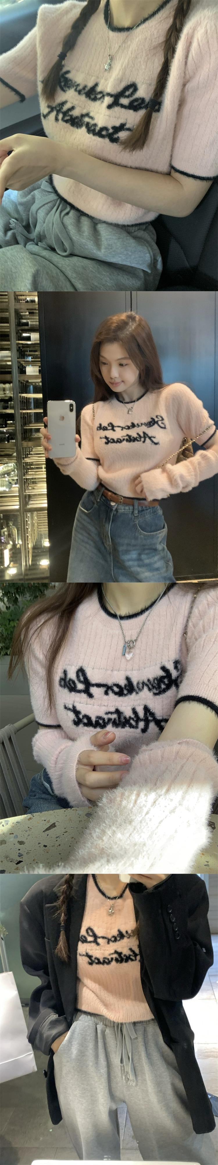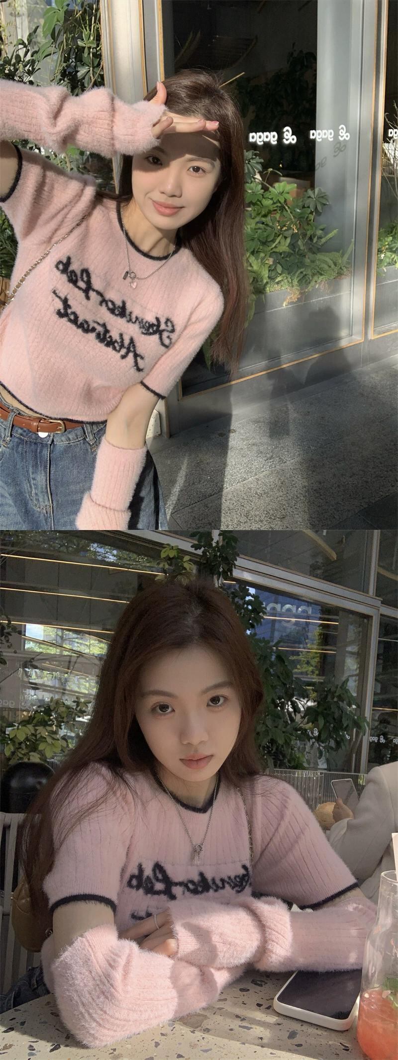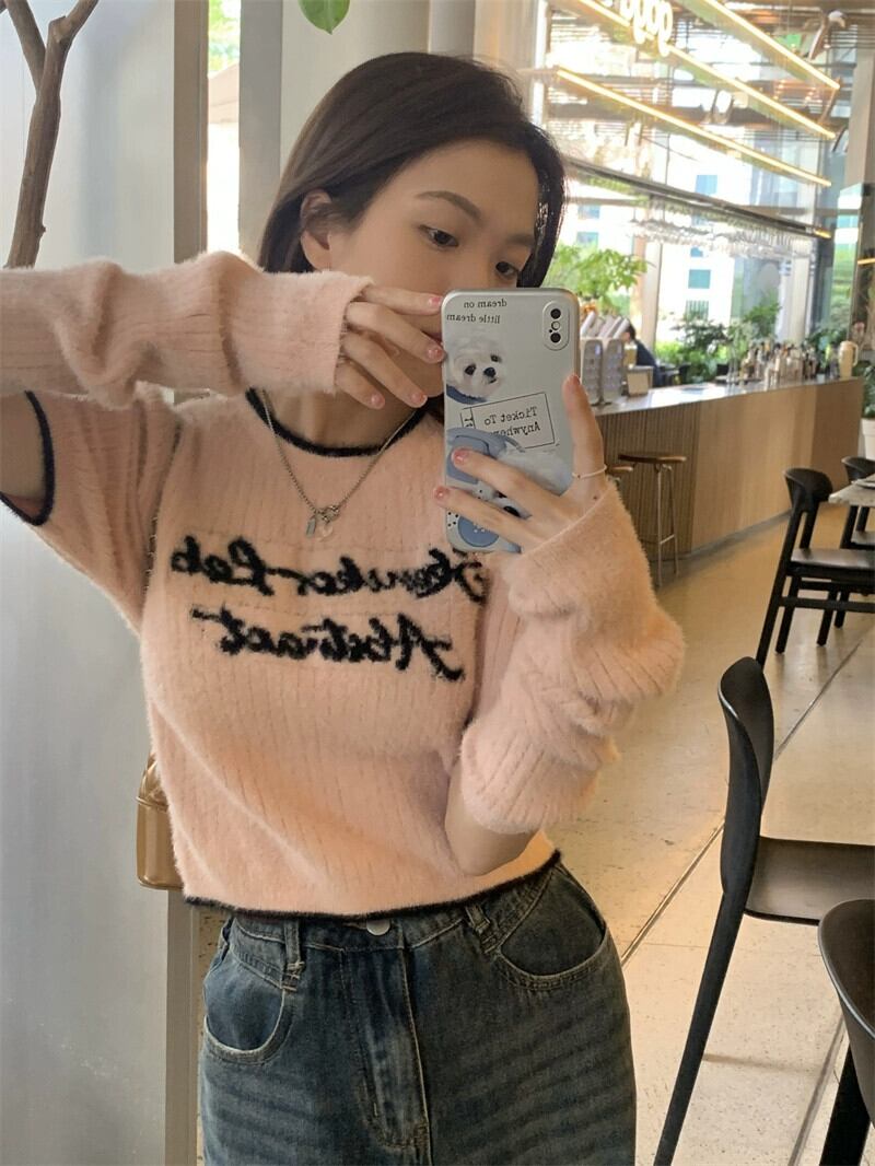 ソフトワックスレターピンク長袖セーター春 2024 新しいファッション多用途スリムショートトップ女性 ロング スプリング 春物 missk16456022358
