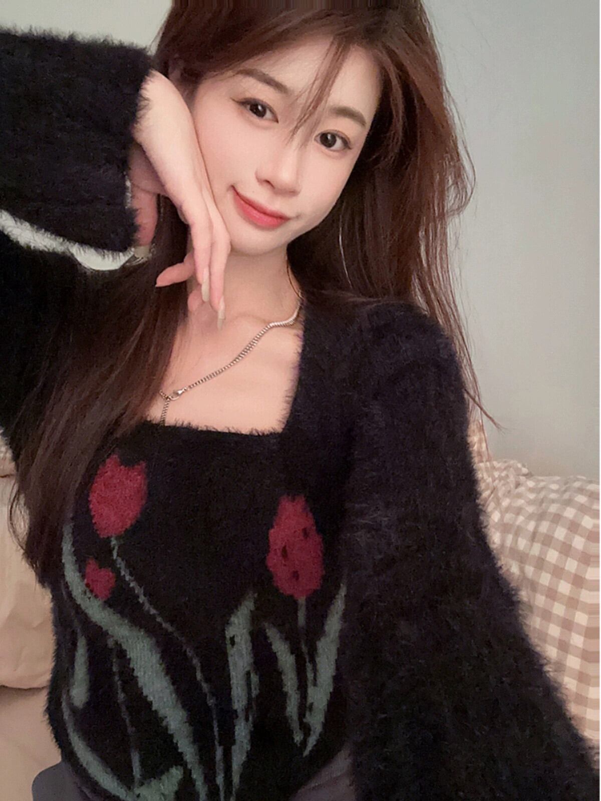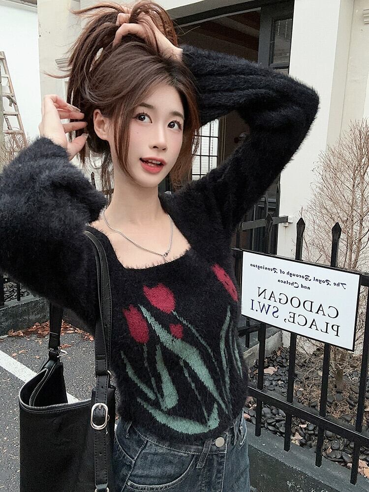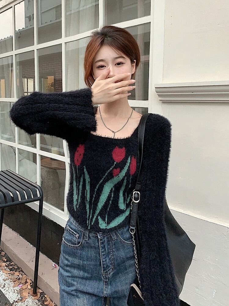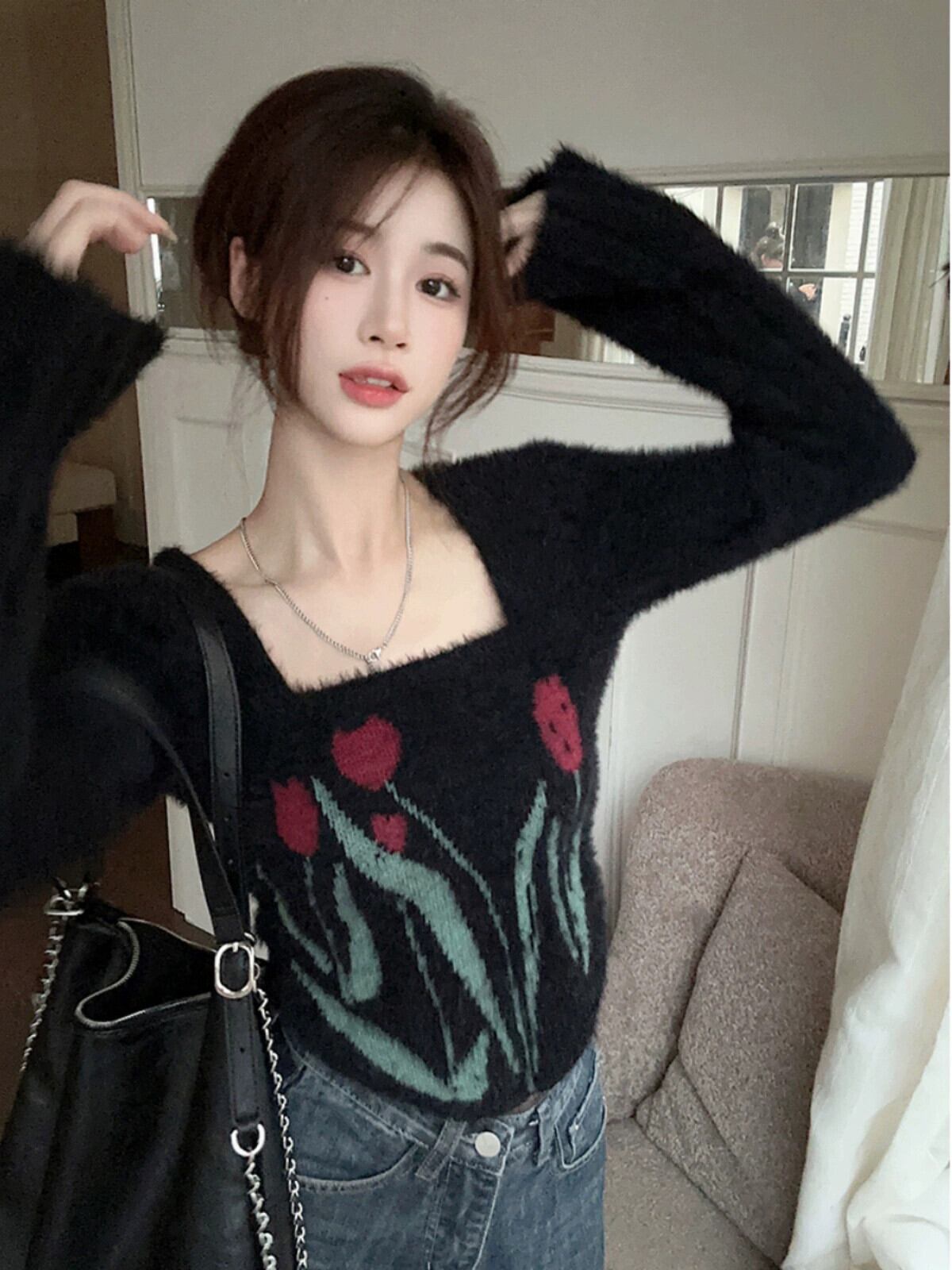 模造ミンクスクエアネックセーター女性秋と冬 2024 新しいジャカードデザインレトロスリムフィット長袖セーター ロング オータム 秋物 ウィンター 冬物 スクウェア missk46317105303