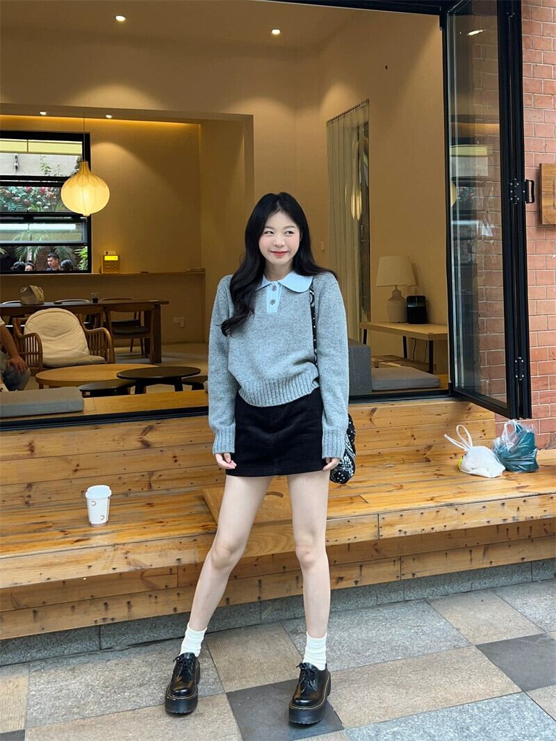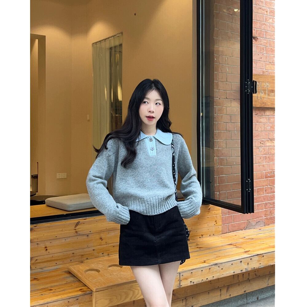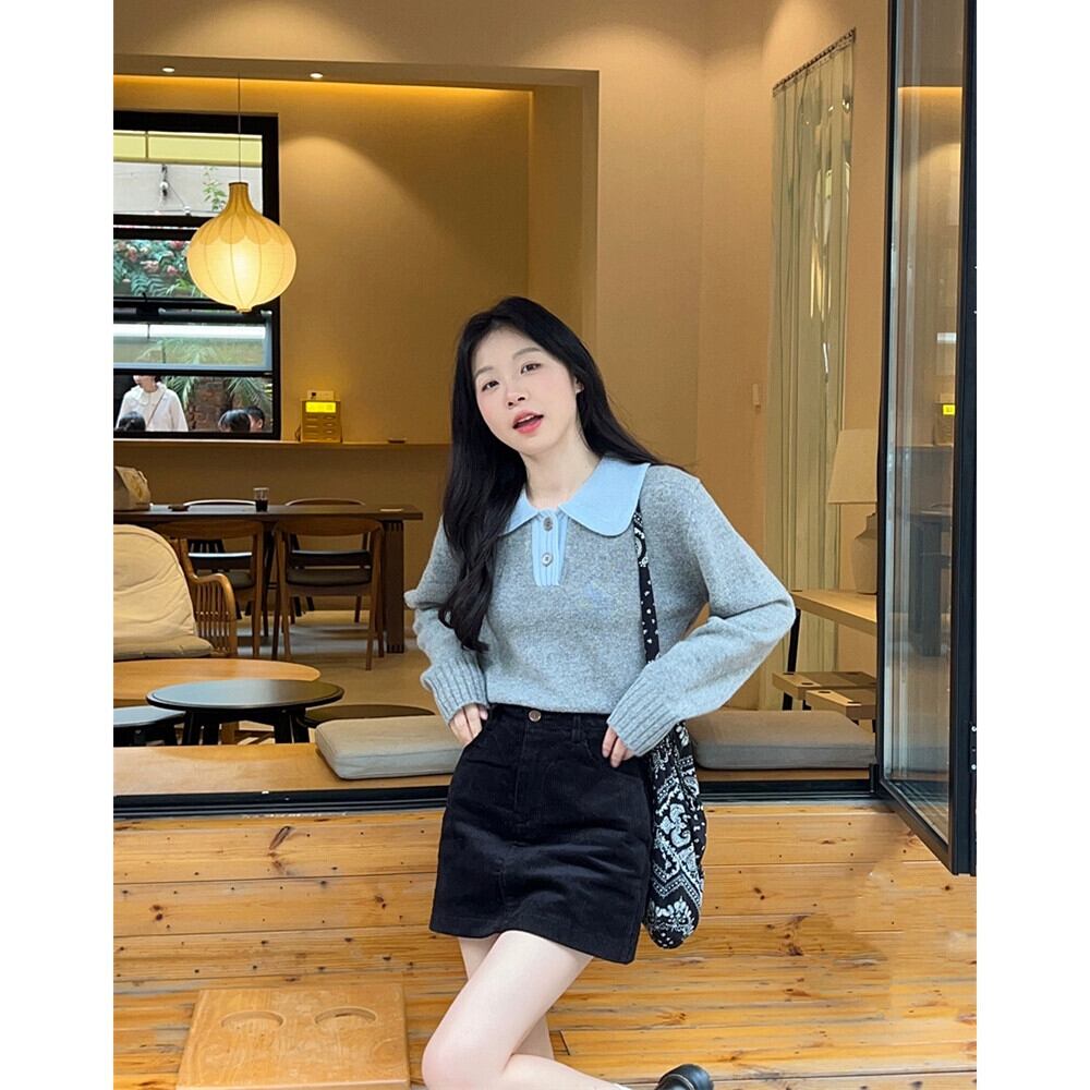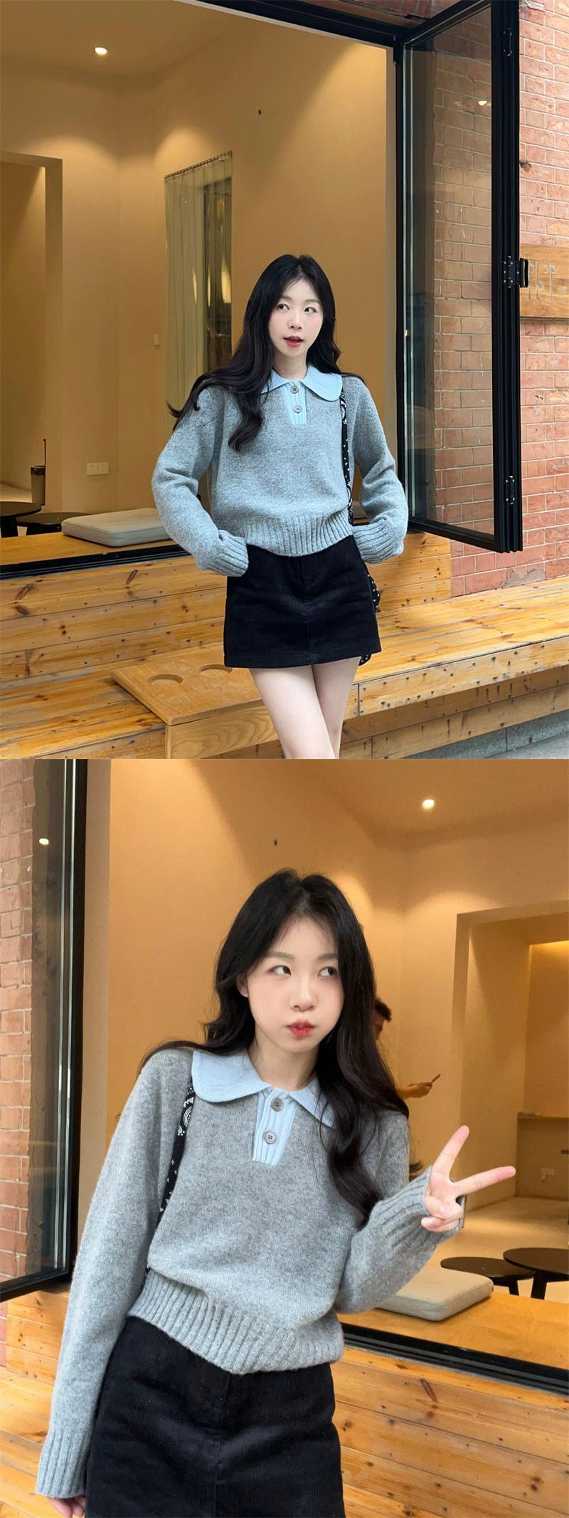 コントラストカラーラペル長袖セーター女性秋冬 2024 新しいフレンチレトロ小柄なショートアウターニットトップ ロング オータム 秋物 ウィンター 冬物 missk11456601028