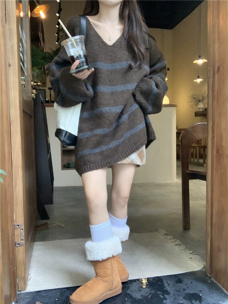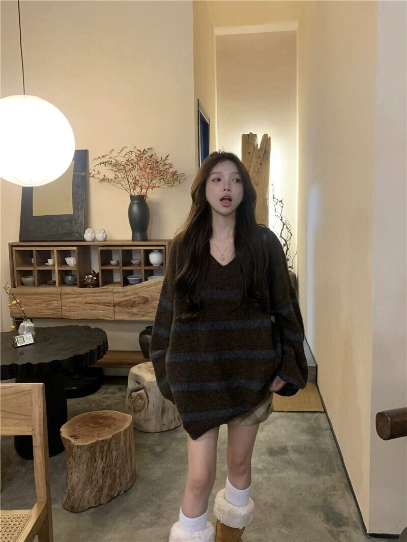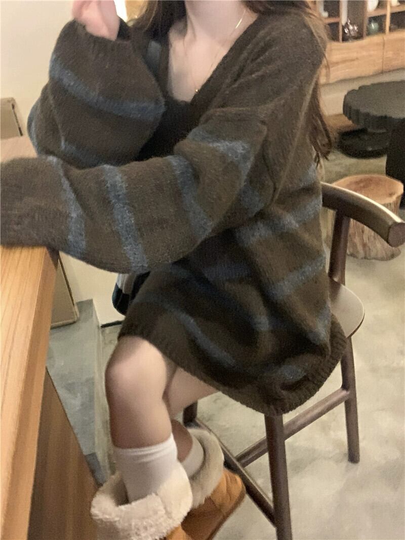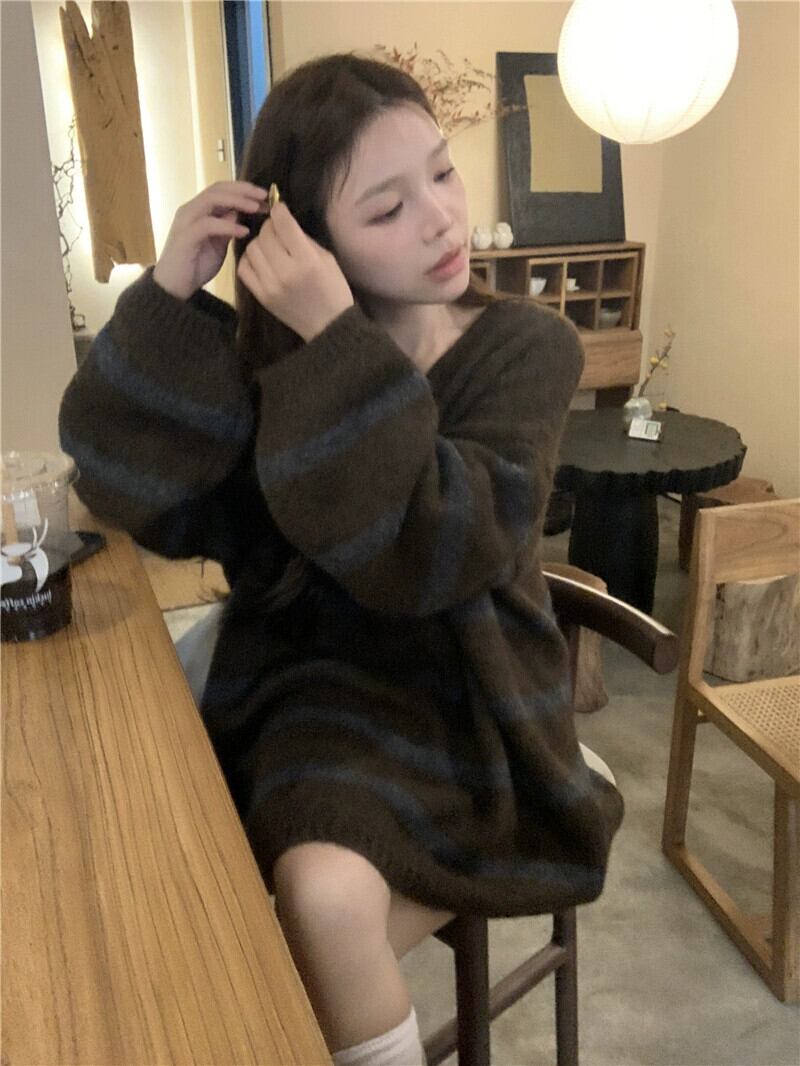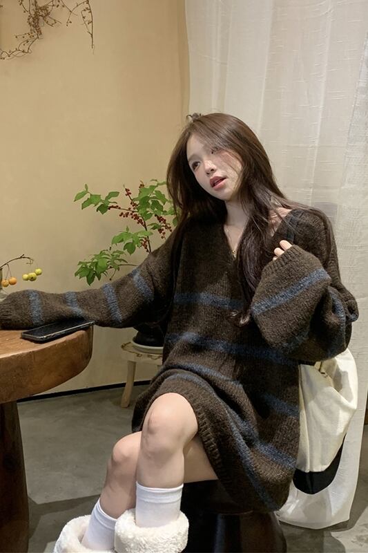 怠惰なスタイル V ネックストライプセーター秋冬 2024 新しいレトロ怠惰なスタイルルーズミッドレングス長袖セーター ロング オータム 秋物 ウィンター 冬物 Vネック missk2013721463