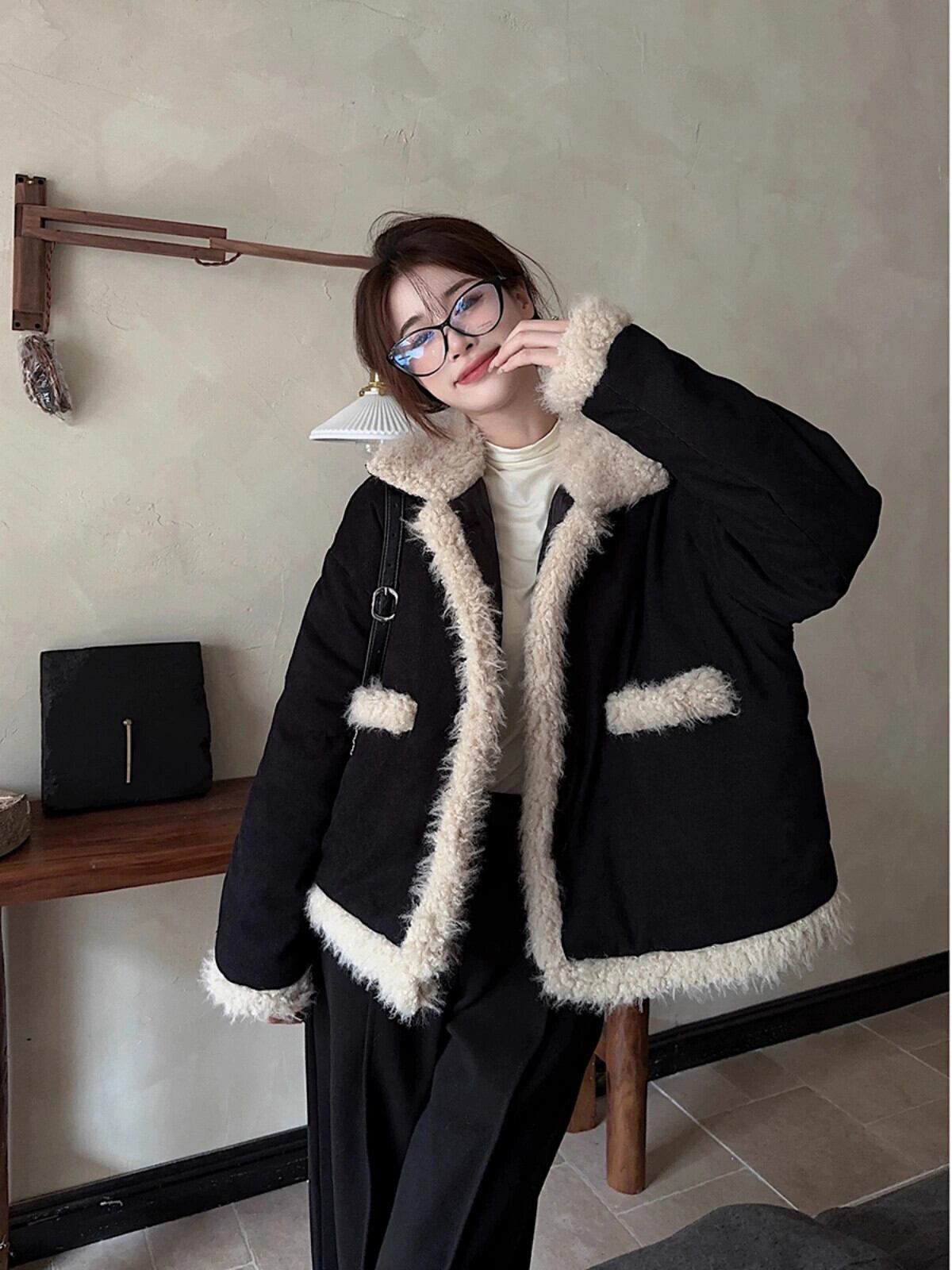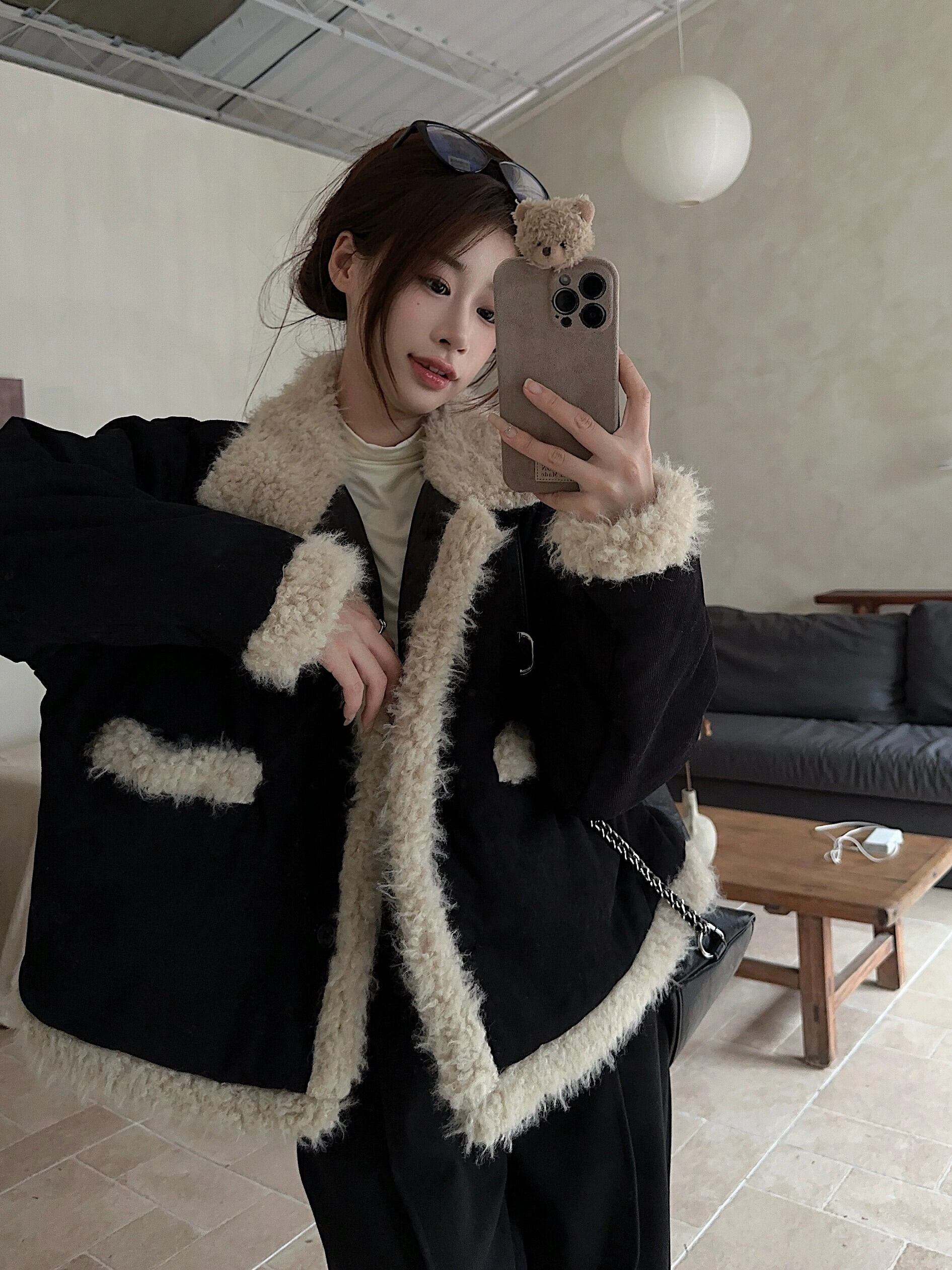 模造ラムウールコートの女性の秋と冬 2024 新しいレトロプラスベルベット肥厚小さなルーズショート長袖トップ ロング オータム 秋物 ウィンター 冬物 missk84427313745