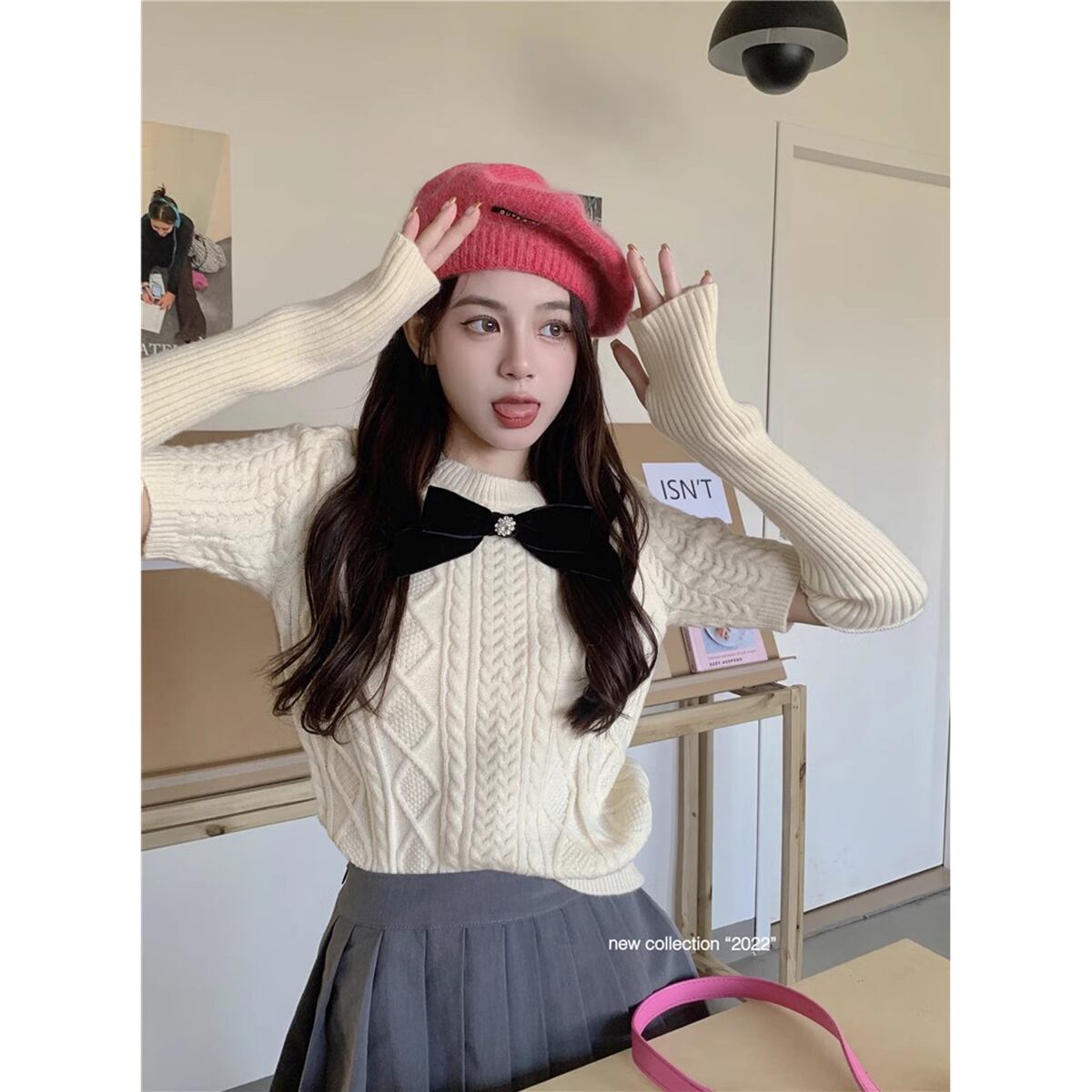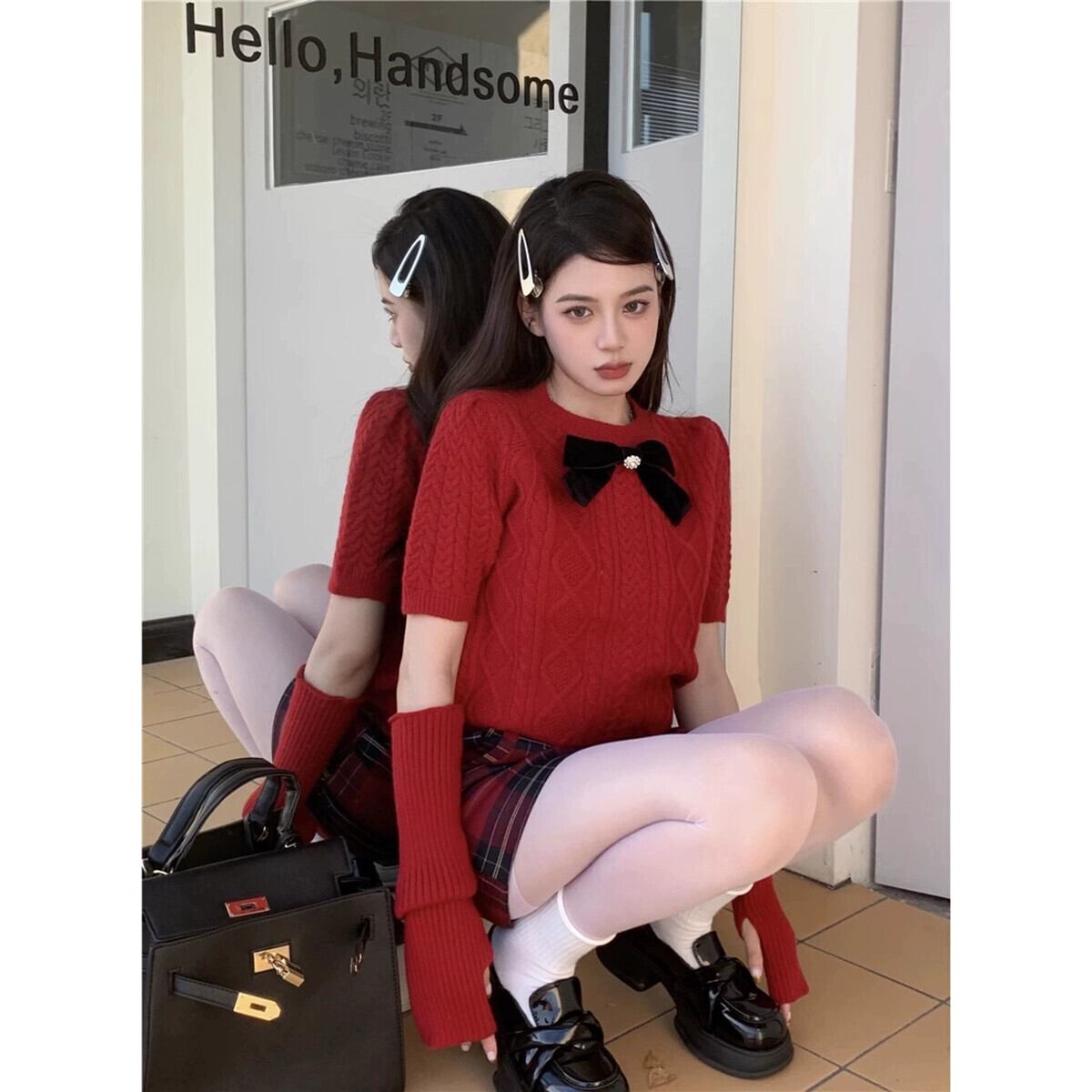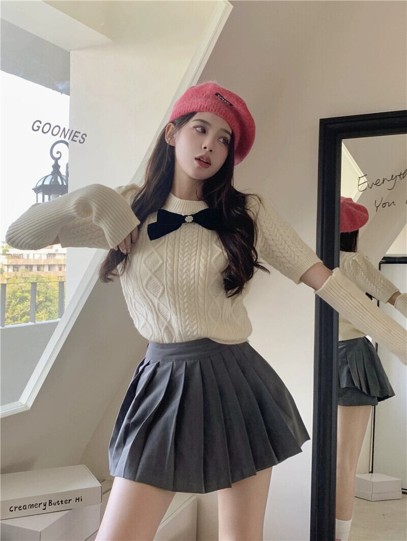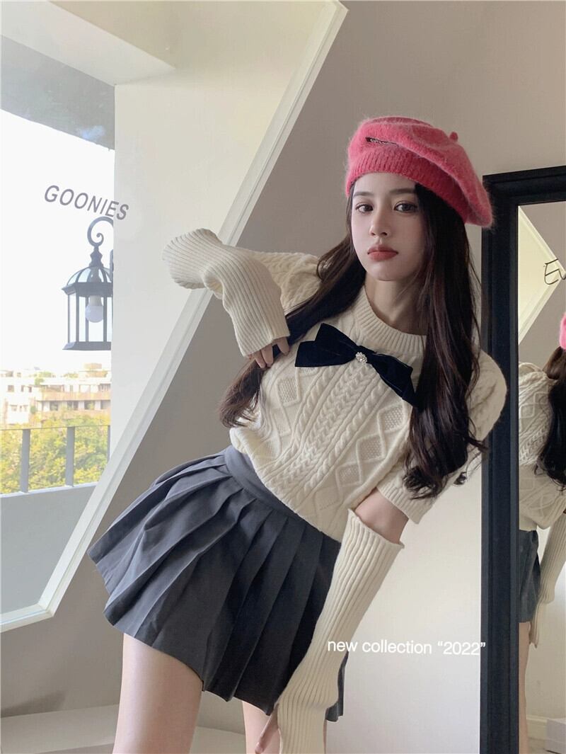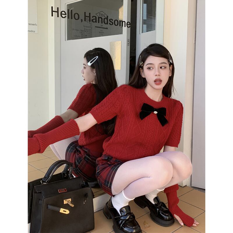 甘くてスパイシーなボウスリーブセーターの女性の秋と冬の 2024 新デザイン赤痩身ショートセーター レッド リボン 大人ガーリー スウィート キュート カジュアル オータム 秋物 ウィンター 冬物 missk52910272330