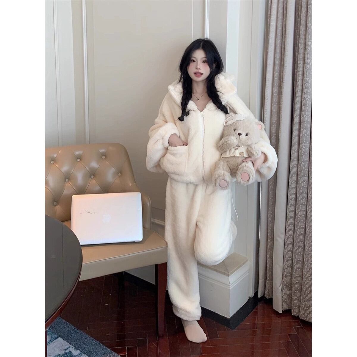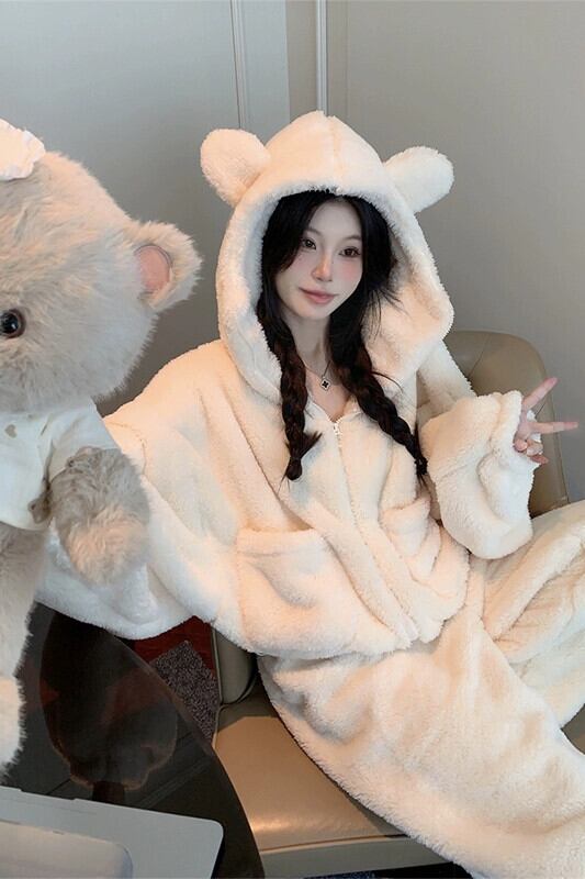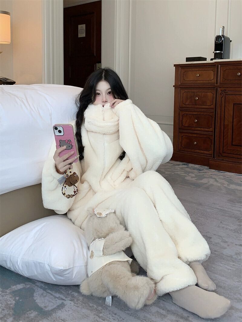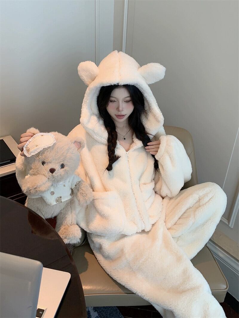 かわいいフード付き厚みのある暖かい長袖パジャマ、カジュアルパンツ、ホーム服の女性、2024年秋冬の新しいファッションツーピースセット ロング 大人ガーリー スウィート キュート オータム 秋物 ウィンター 冬物 missk89167114718