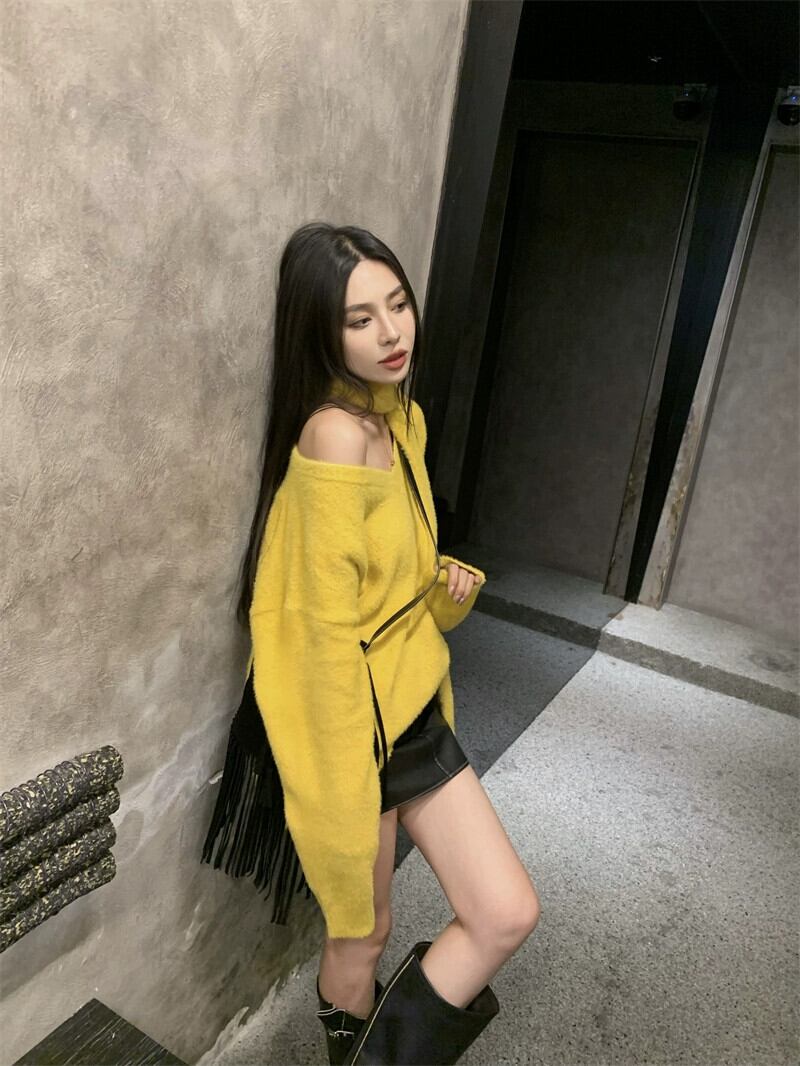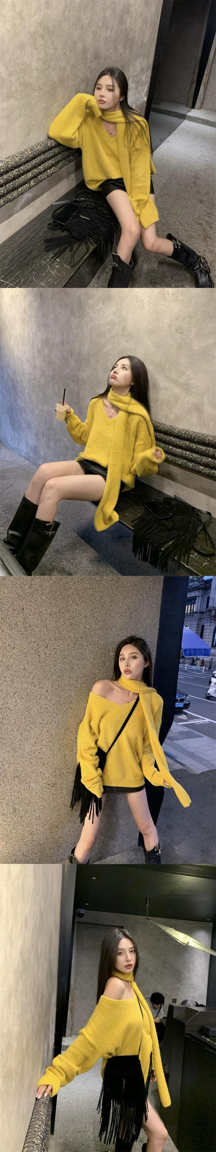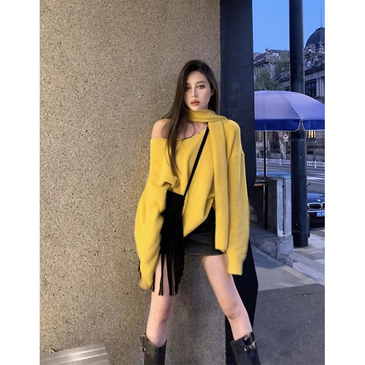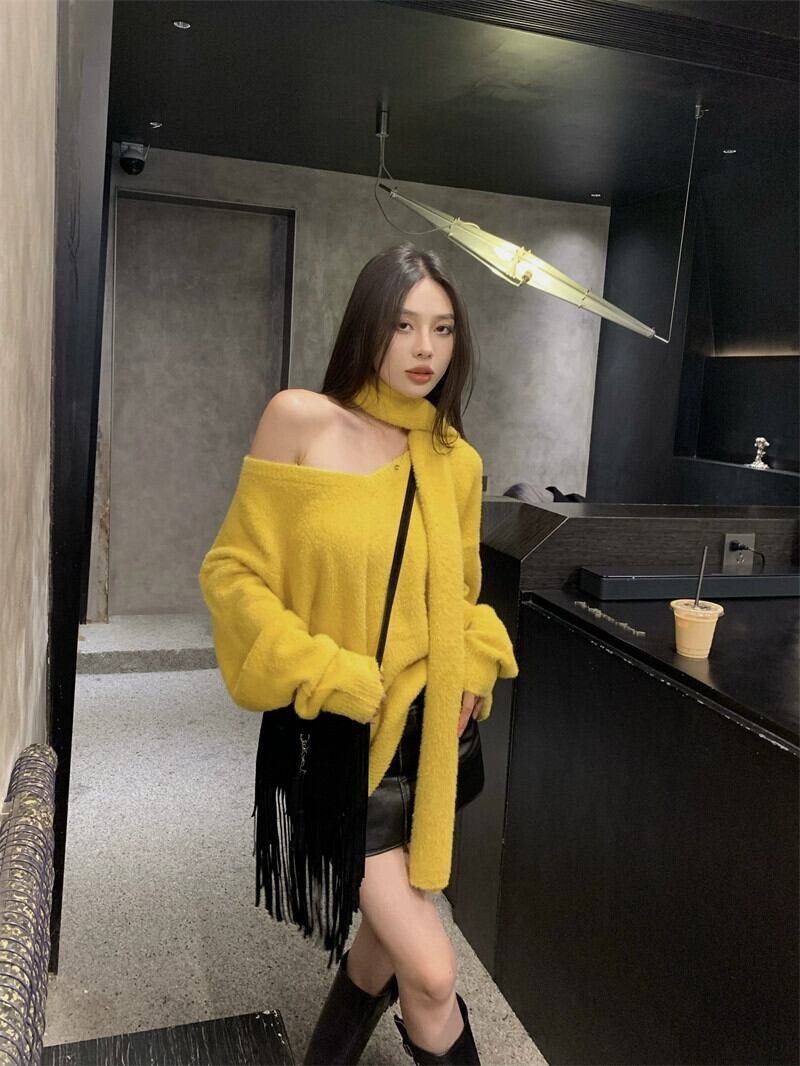 ソフトでワックス状のオフショルダー長袖セーター女性 2024 年春の新しいスタイルのルーズでスタイリッシュなニットトップ、スカーフデザイントレンド ロング スプリング 春物 missk94415923712