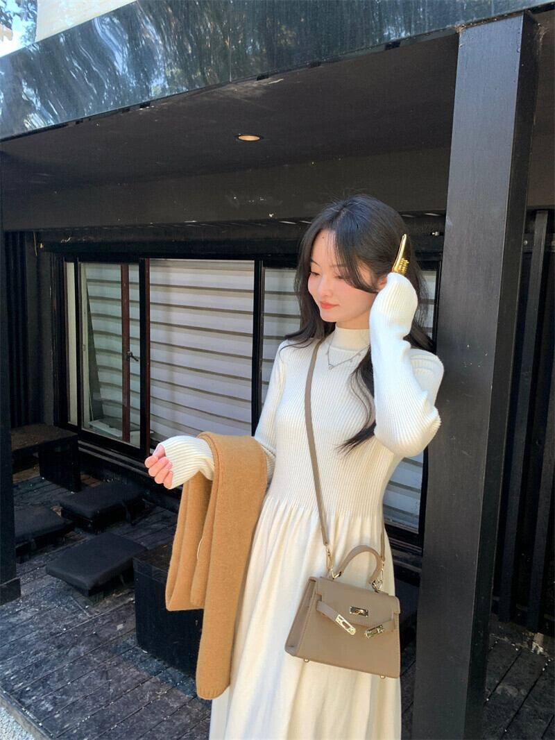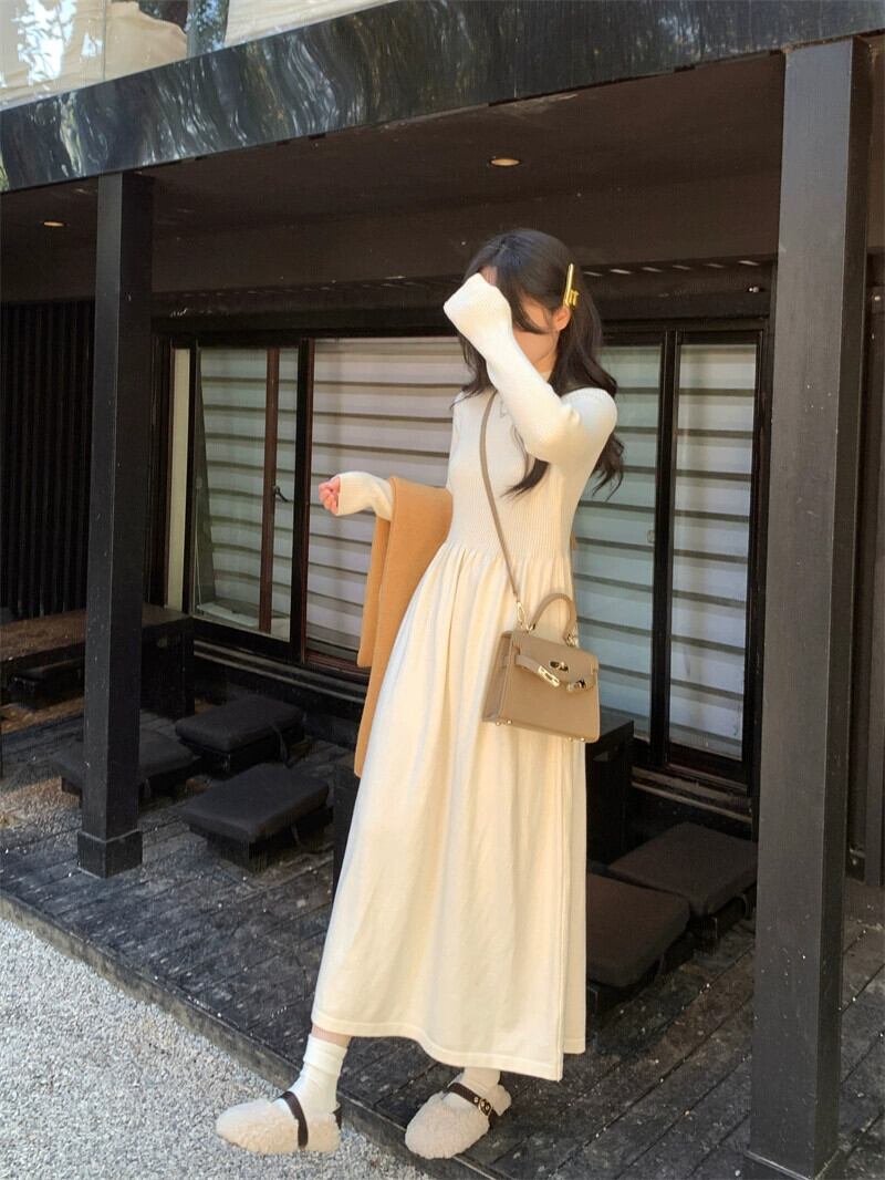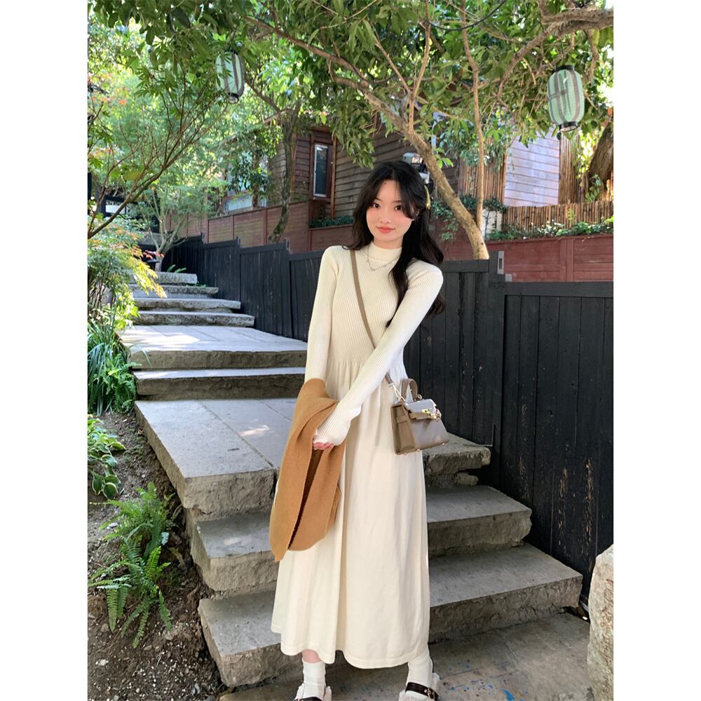 スリムフィットの春ニットドレス女性、厚くて暖かい底、アプリコットのミドル丈のコートとスカート スプリング 春物 missk86165531061