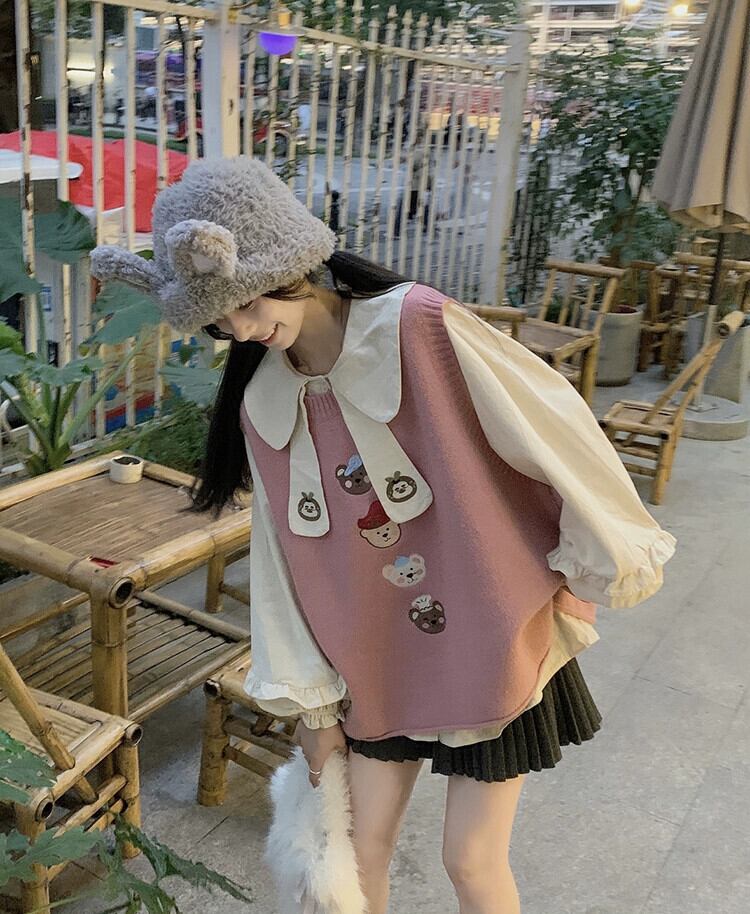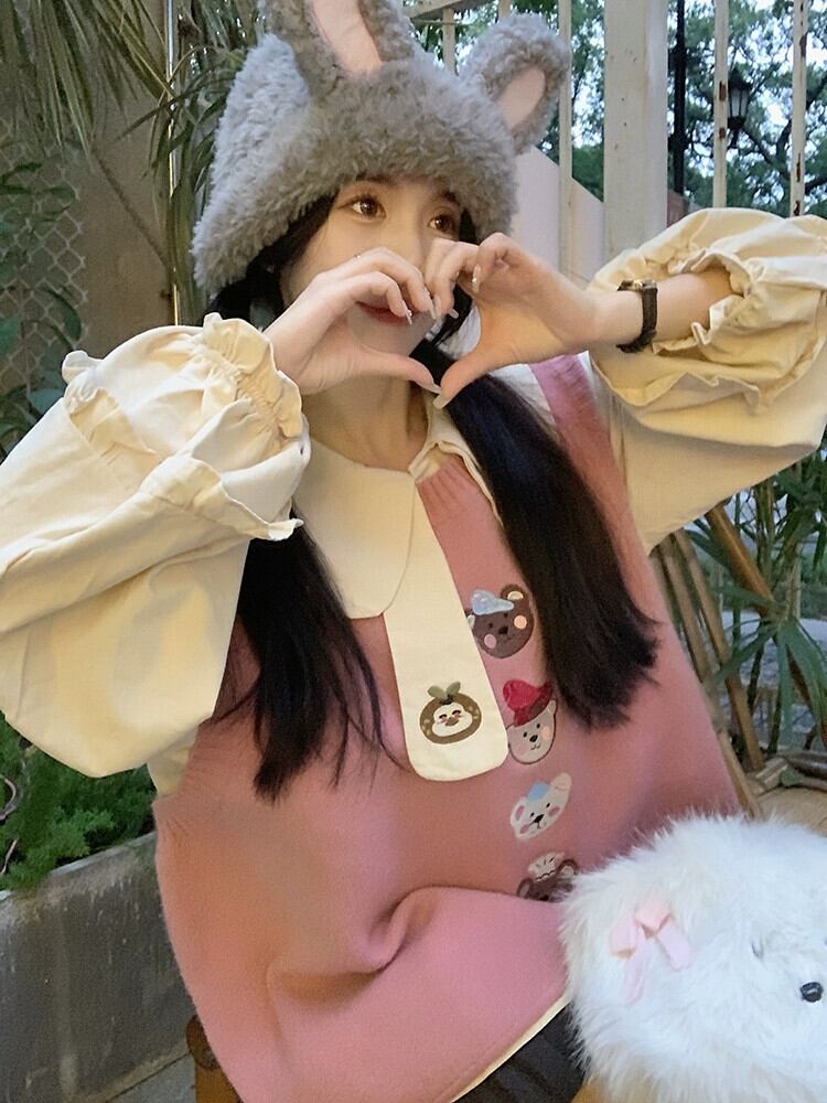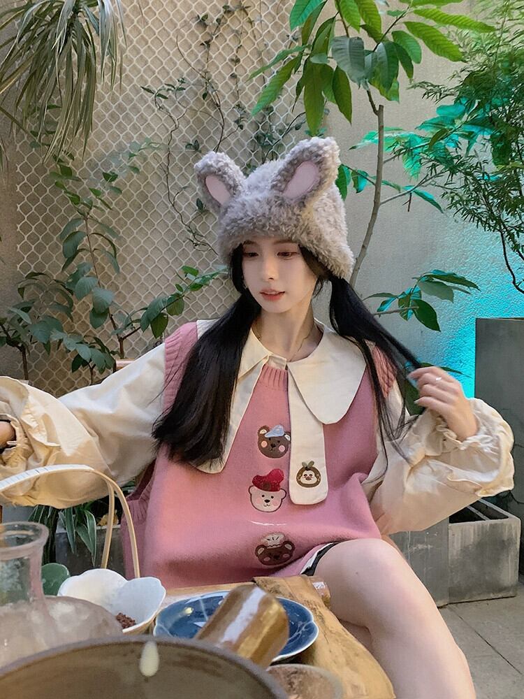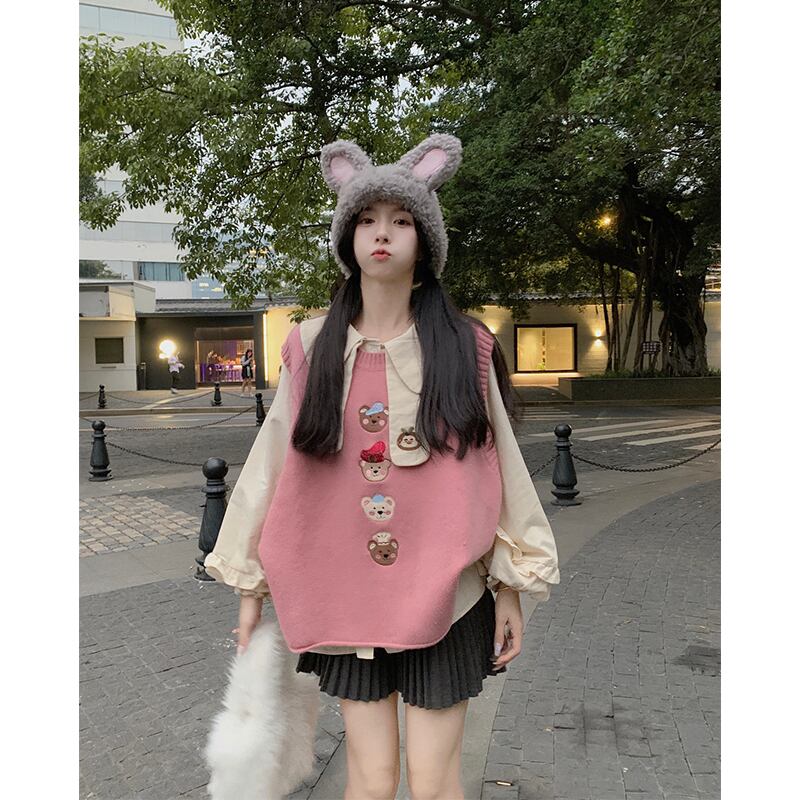 かわいい耳刺繍長袖シャツクマニットベスト女性春の新ファッションツーピースセット ロング レッド 大人ガーリー スウィート キュート カジュアル スプリング 春物 missk5523517846