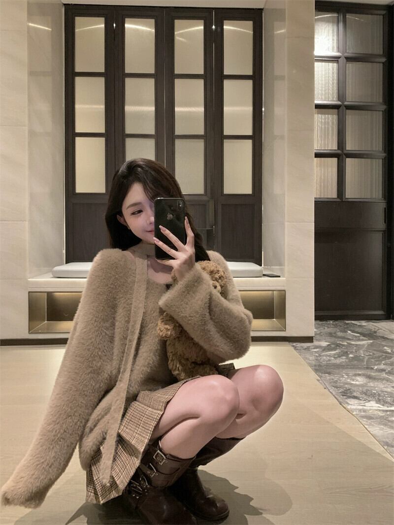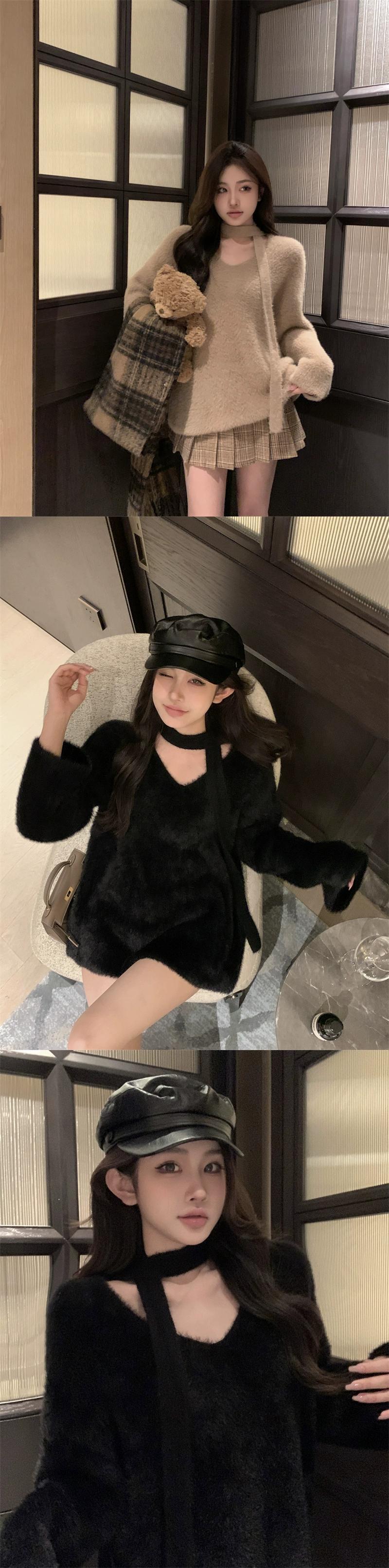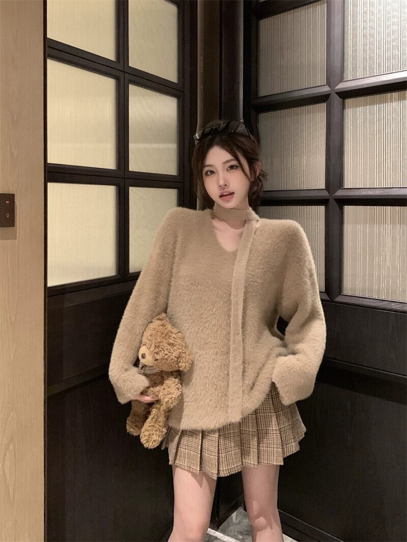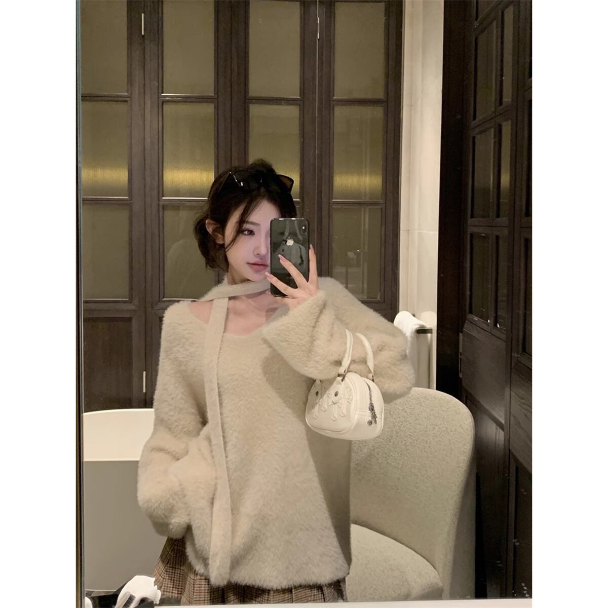 模造ミンクリボンセーター女性春と秋バージョン 2024 新スタイル怠惰なスタイルソフトワックス V ネックルーズ長袖トップイン ロング スプリング 春物 オータム 秋物 Vネック missk25226363505