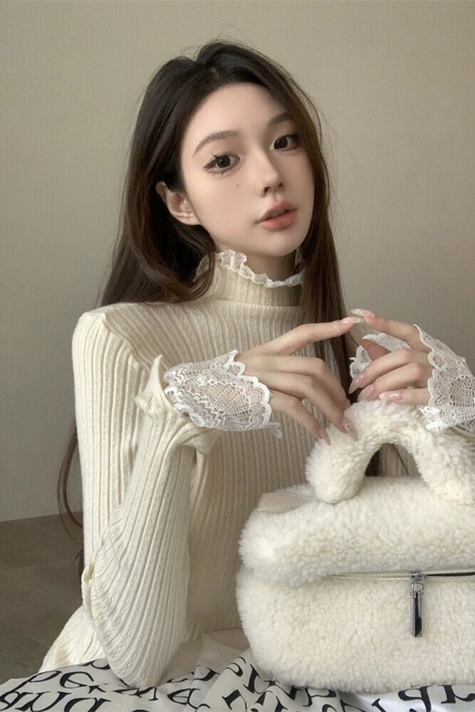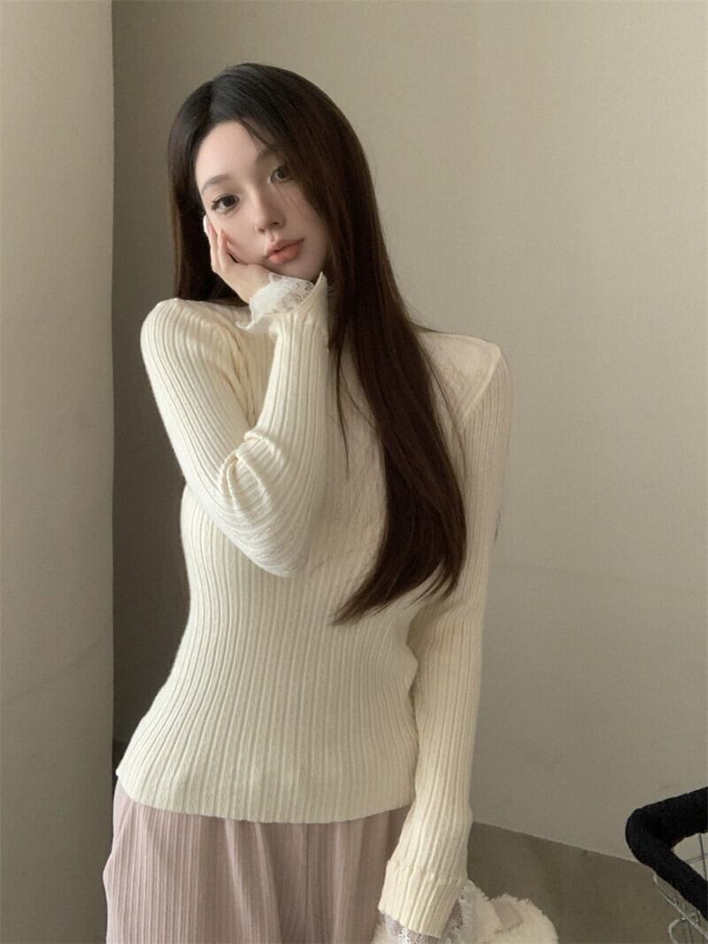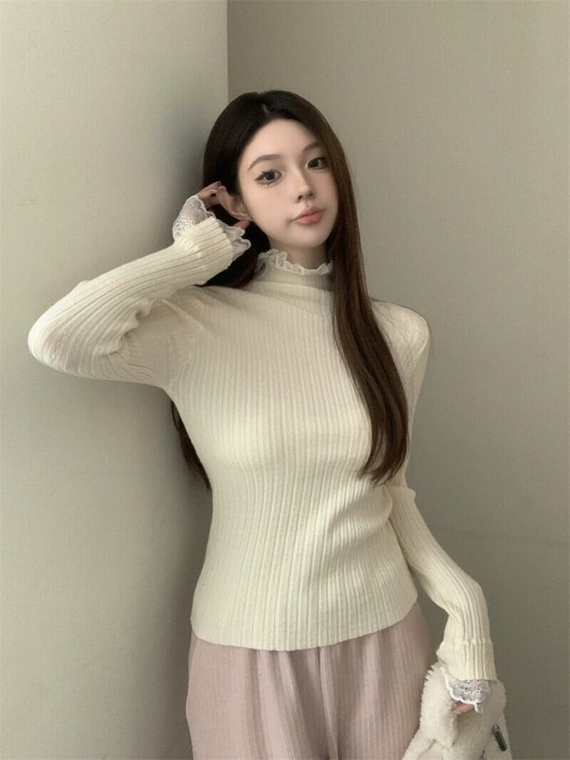 レースハーフタートルネックセーター女性 2024 春の新しい甘いスリムフィット長袖ボトシャツ ロング 大人ガーリー スウィート キュート カジュアル スプリング 春物 missk40989747013