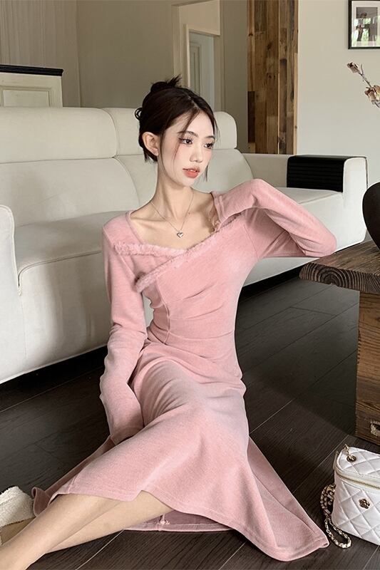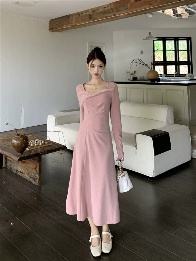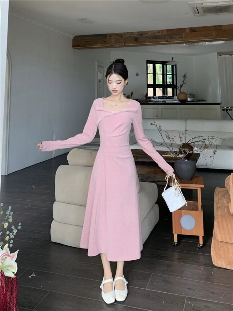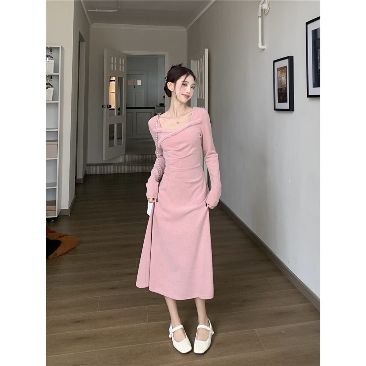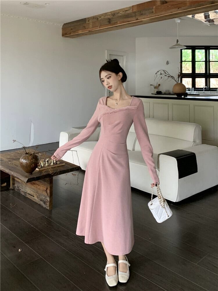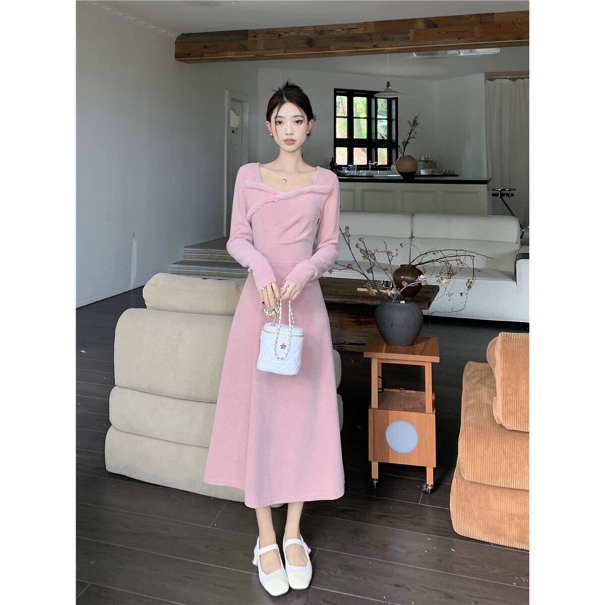 スクエアネックニットドレス女性春と秋 2024 新しいフレンチスタイルウエスト痩身ミッドレングス長袖 A ラインスカート ロング スプリング 春物 オータム 秋物 Aライン スクウェア missk31485375058