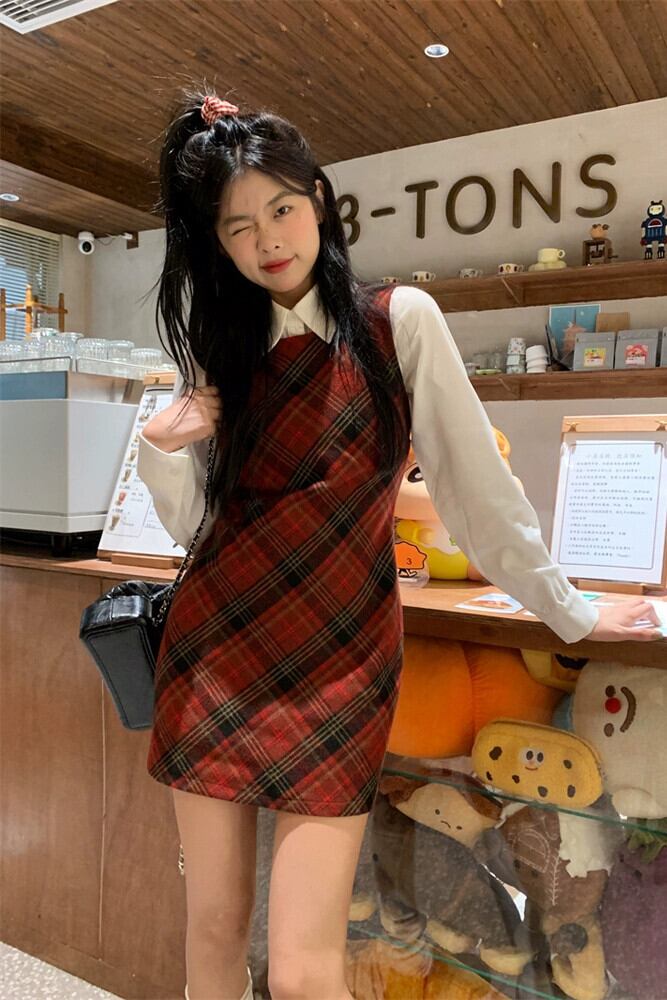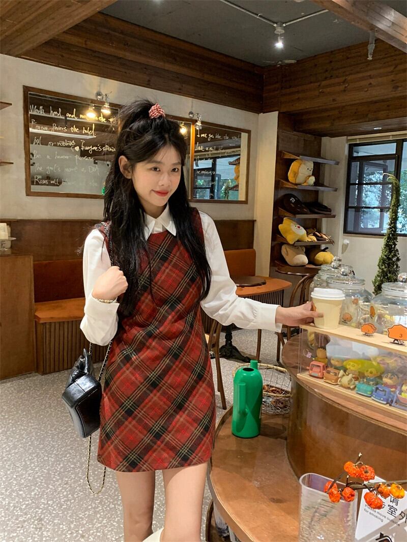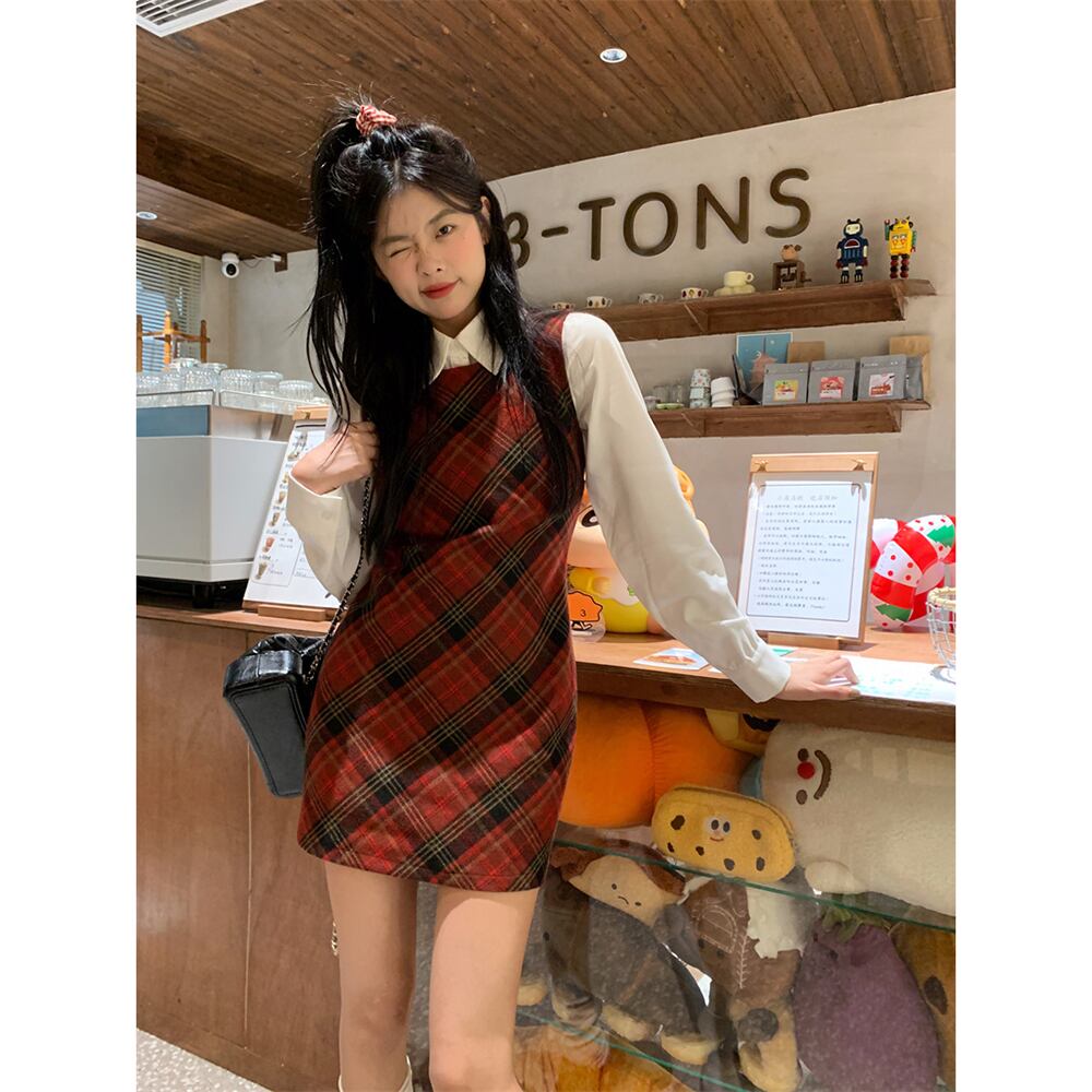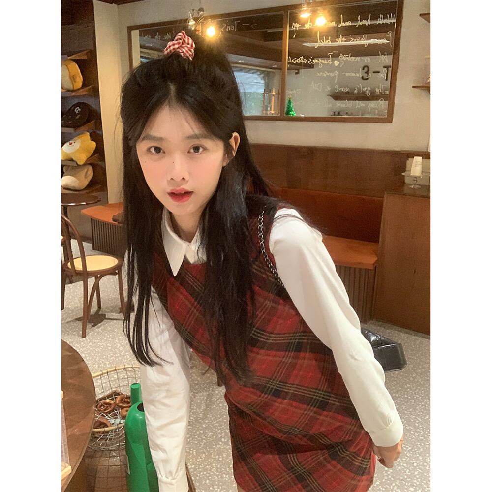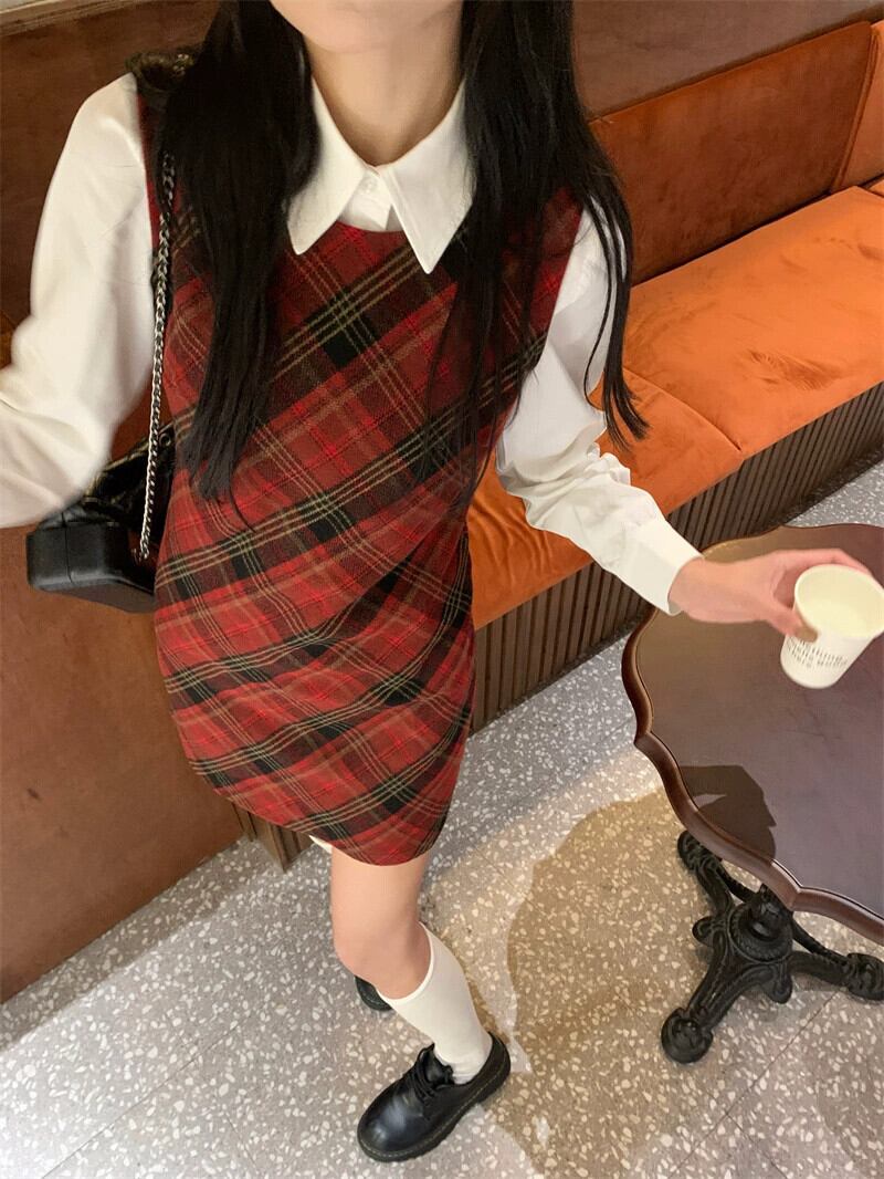 赤いチェック柄ウールベストドレス女性春と秋 2024 新しいプレッピースタイル痩身お尻カバーショートスカート レッド スプリング 春物 オータム 秋物 missk64418862775