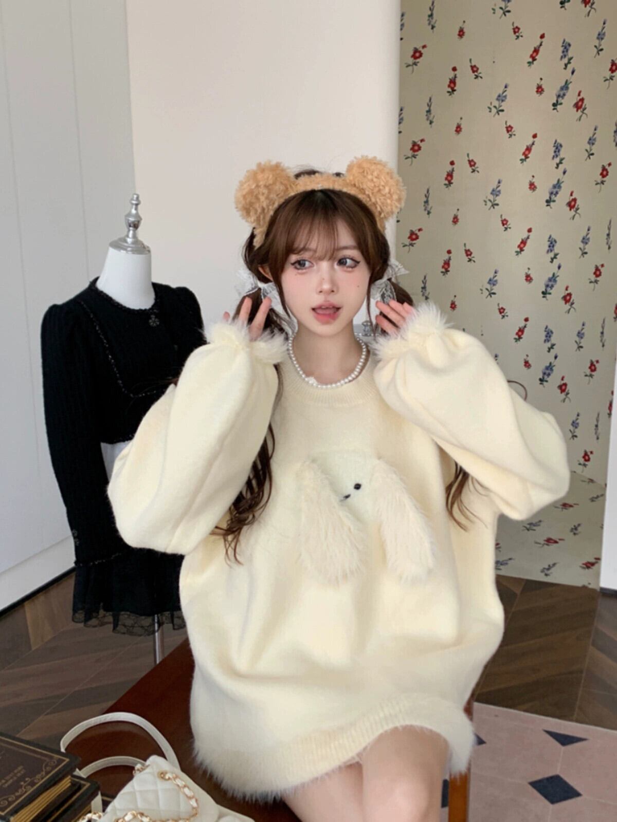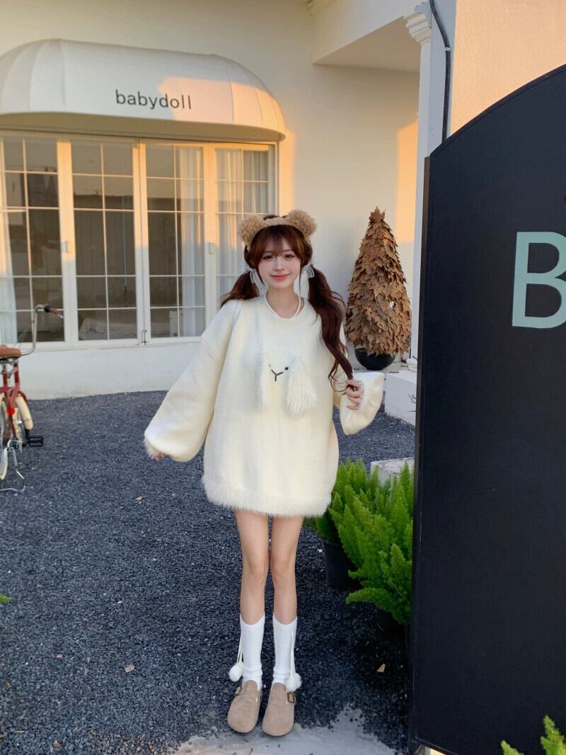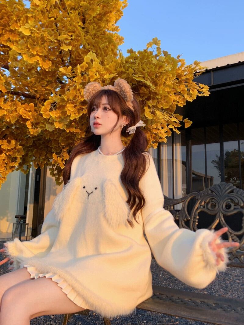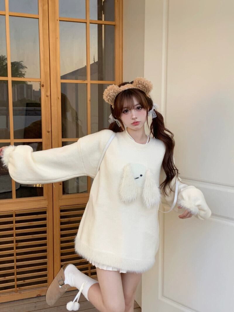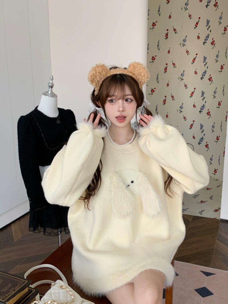 呼吸ソフトとワックス状ニットセーター女性春と秋 2024 新しい甘いバニー耳デザインルーズ長袖トップ ロング 大人ガーリー スウィート キュート カジュアル スプリング 春物 オータム 秋物 missk94481594619
