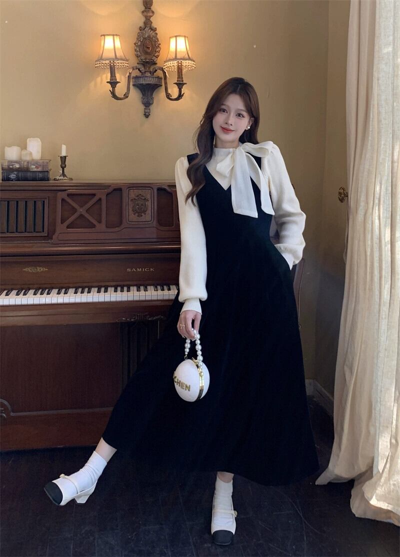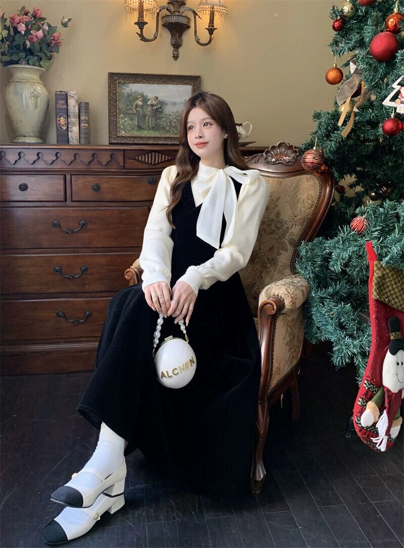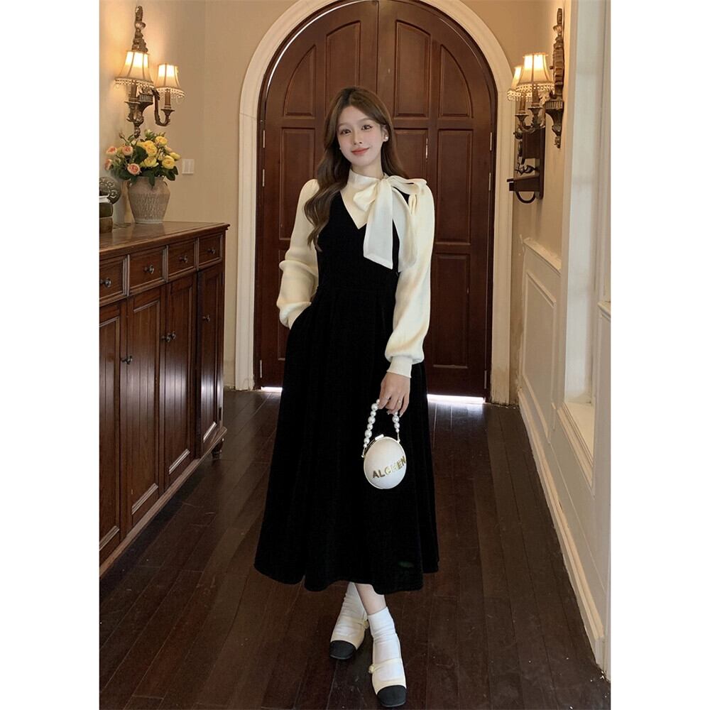 フランスの女性スタイルベルベットサスペンダードレス弓底セーター女性春と秋 2024 新しいツーピースセット リボン スプリング 春物 オータム 秋物 missk13862438562