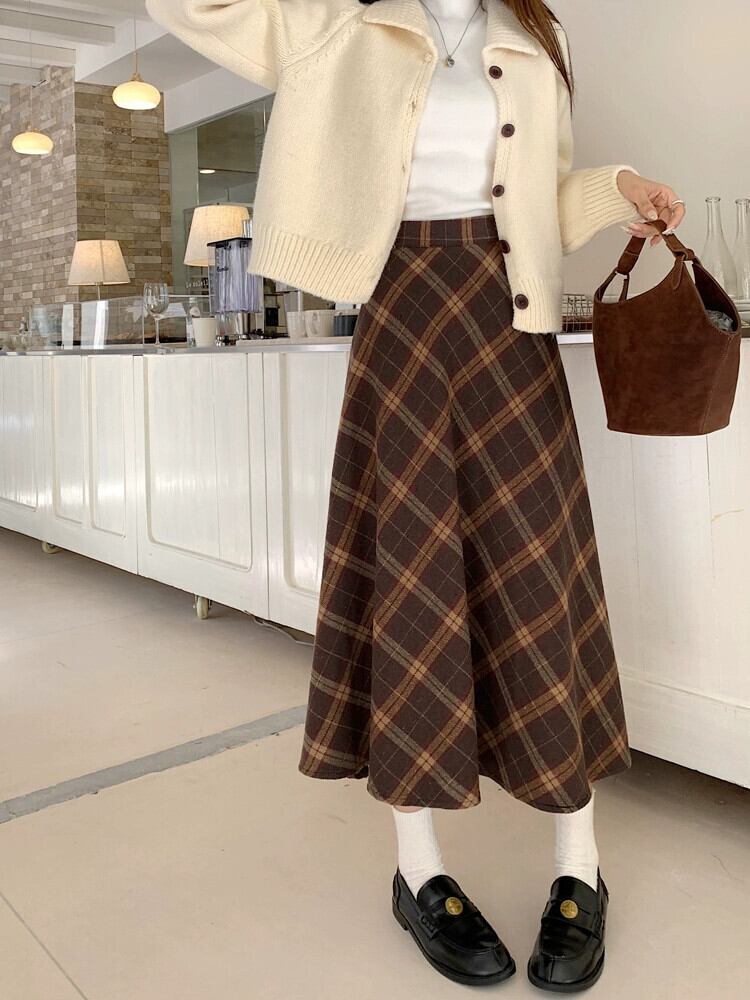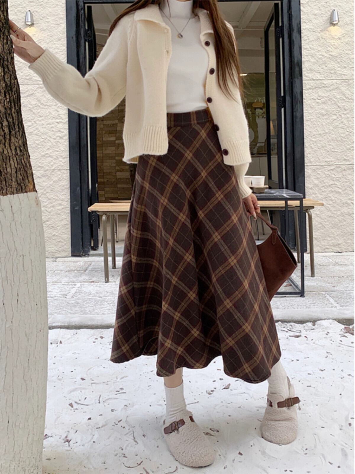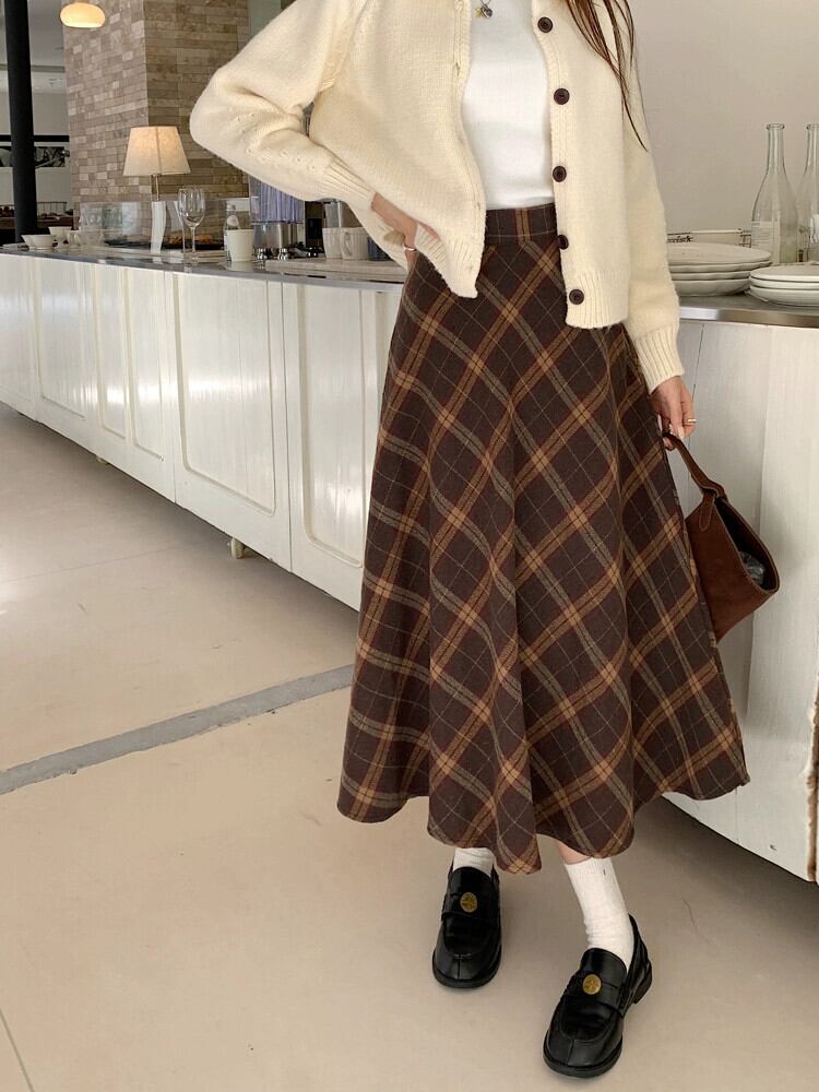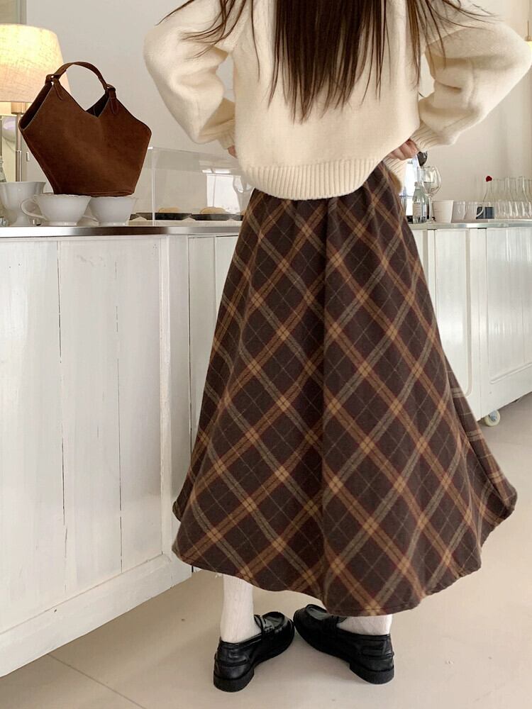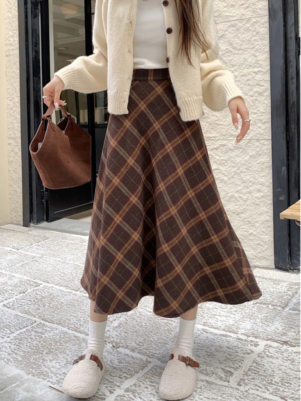チェック柄ウールスカートレディース2024春バージョン新作メイラードハイウエストスリムミドル丈Aラインスカート スプリング 春物 missk59932655364