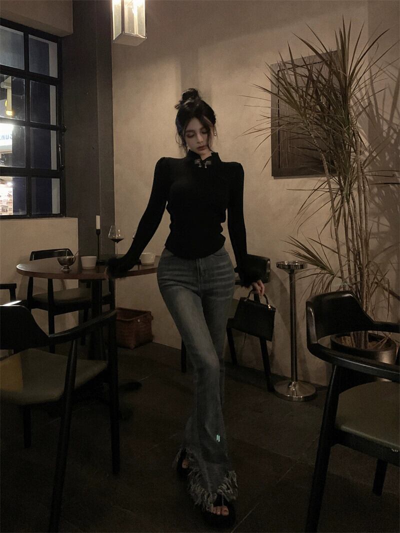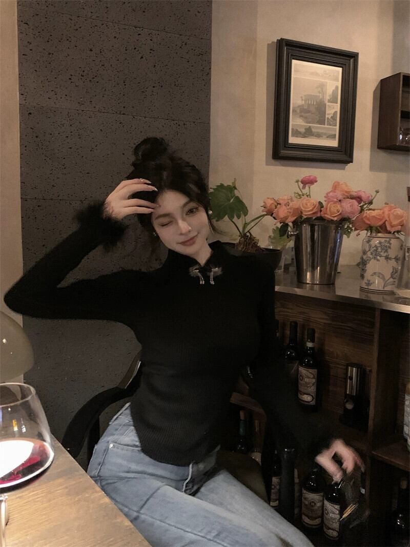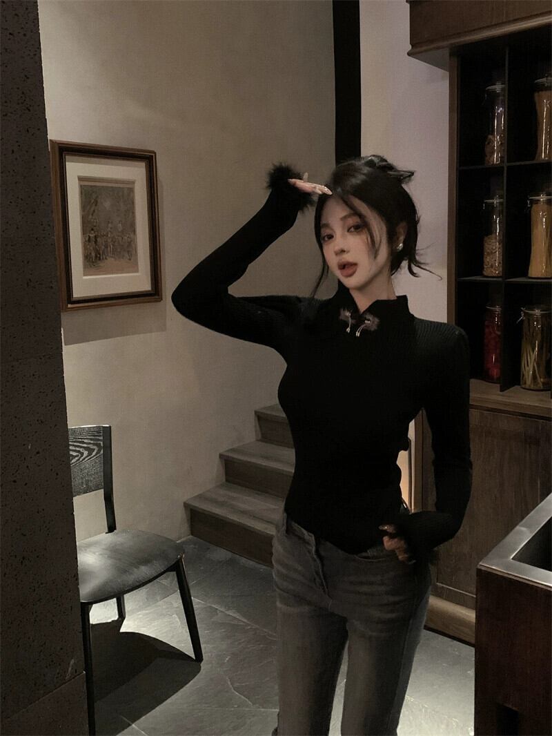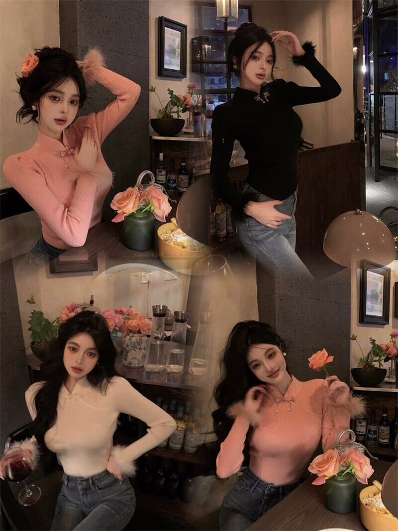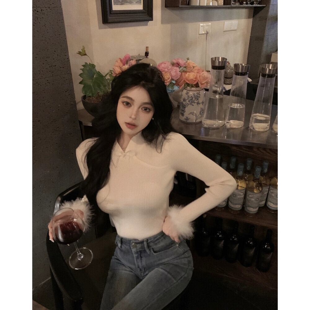 中国風の長袖セーターの女性の春 2024 新しいスタイルの毛皮のような袖口デザインスリミング底トップ ロング スプリング 春物 missk32757173773