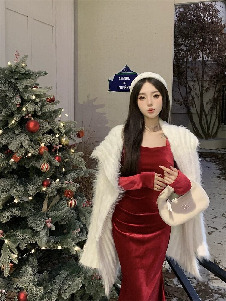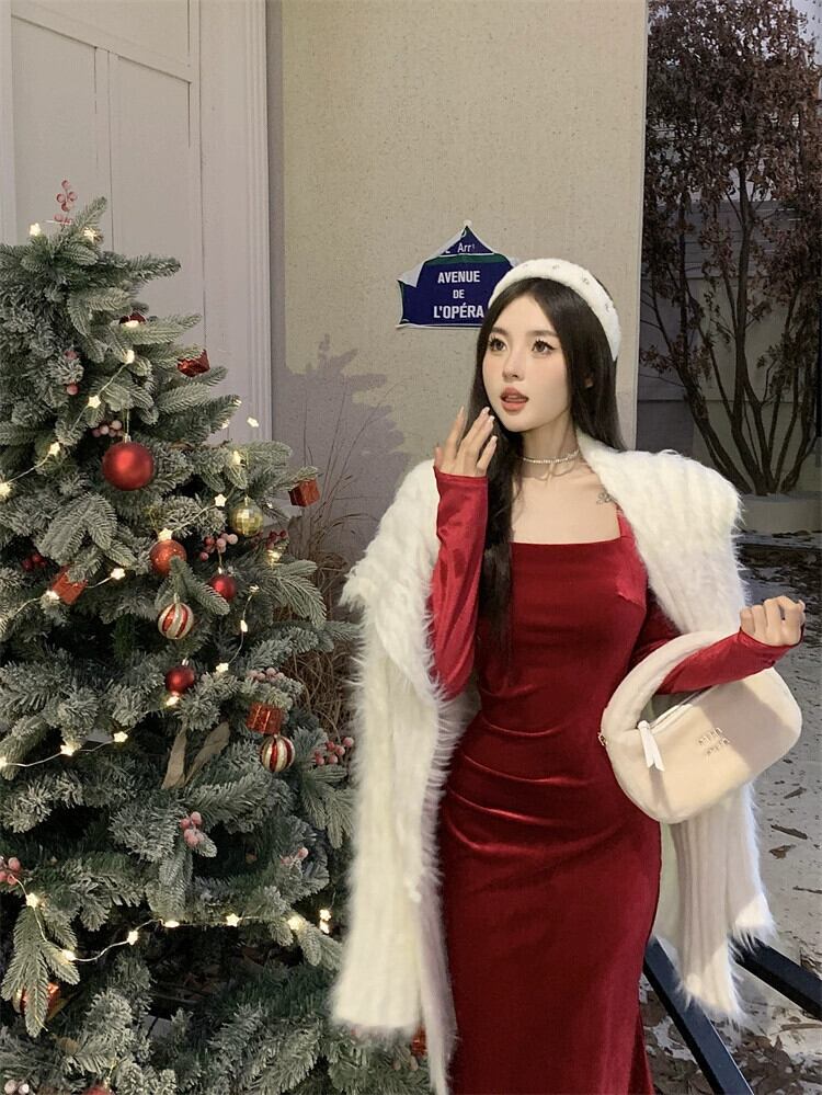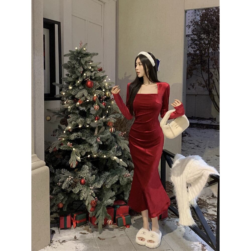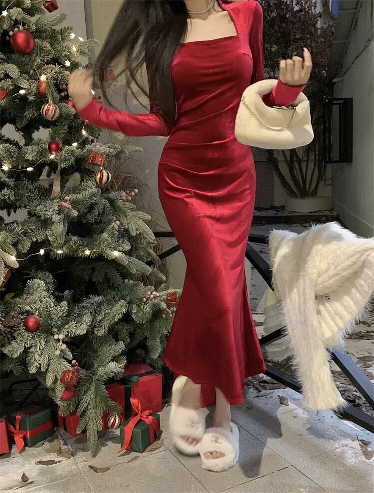 年のレッドベルベット長袖ドレス女性春 2024 新しいフレンチウエスト痩身フィッシュテールロングスカート スプリング 春物 missk52562206351