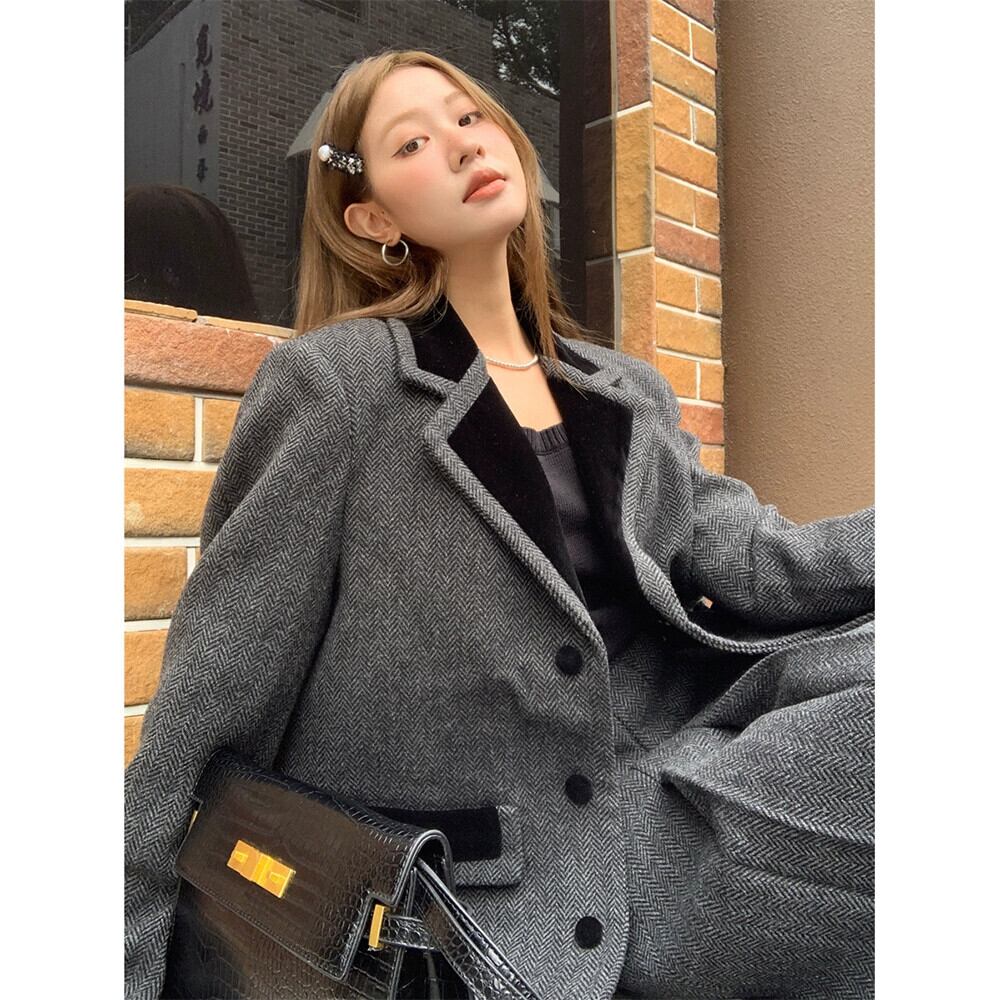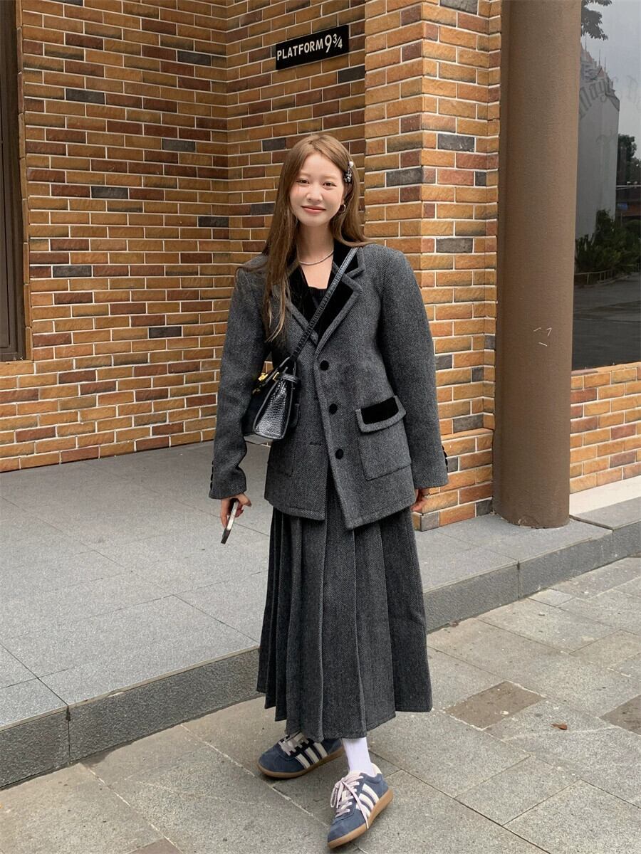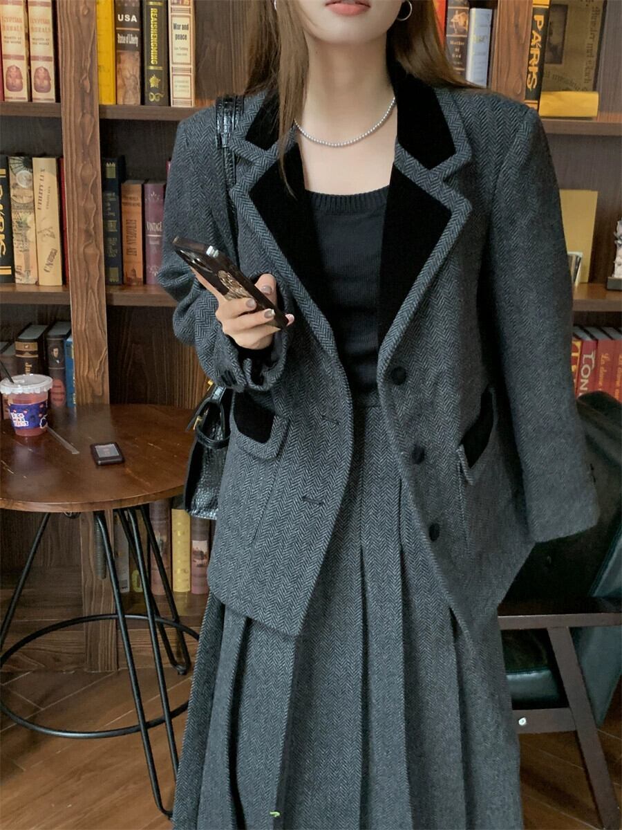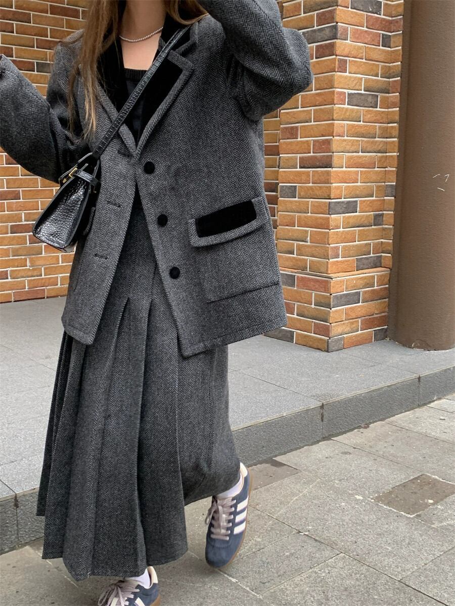 ラペルコントラストカラーキルティング肥厚ウールコートミドル丈プリーツスカートレディース 2024 春新作 2 点セット スプリング 春物 missk9932297900
